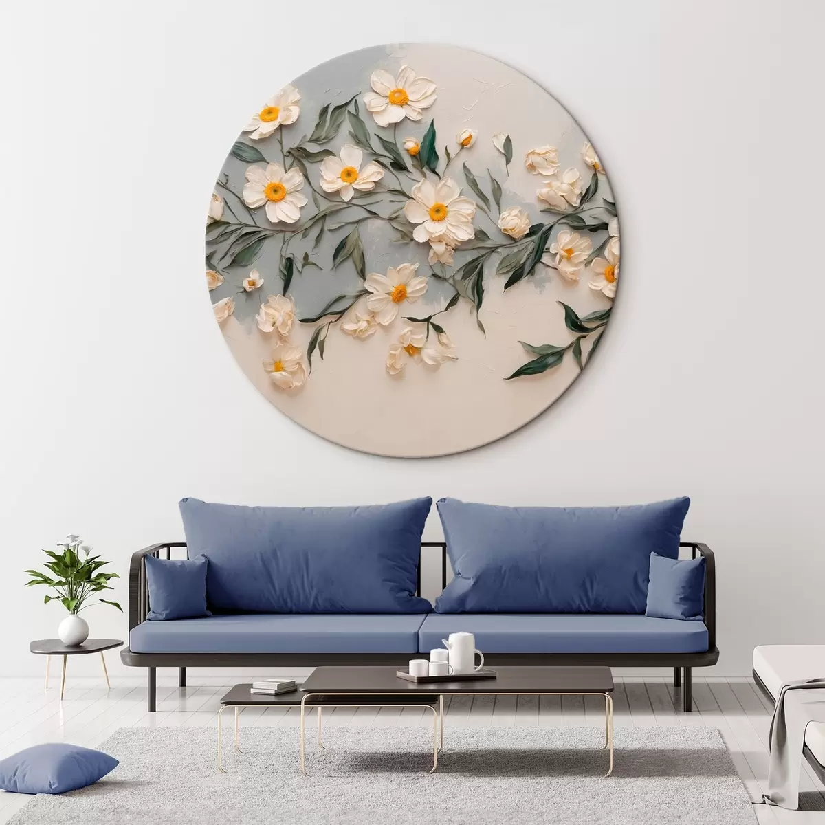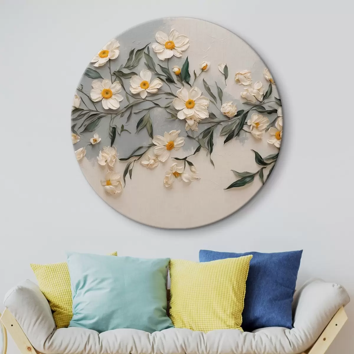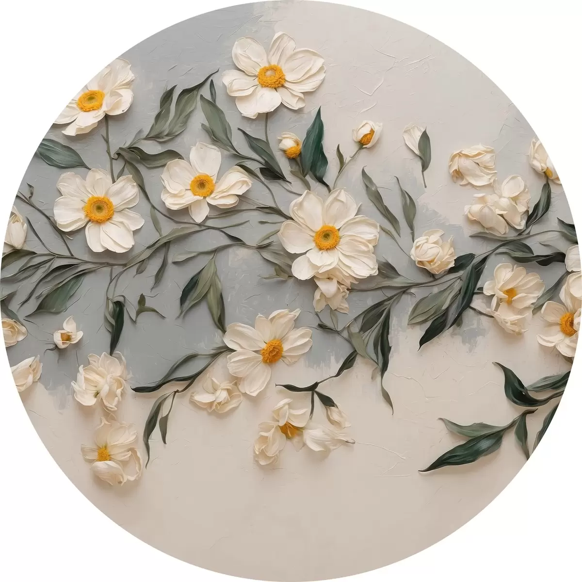 Ronde schilderijen Witte bloem en blad op witte en grijze achtergrond r42764