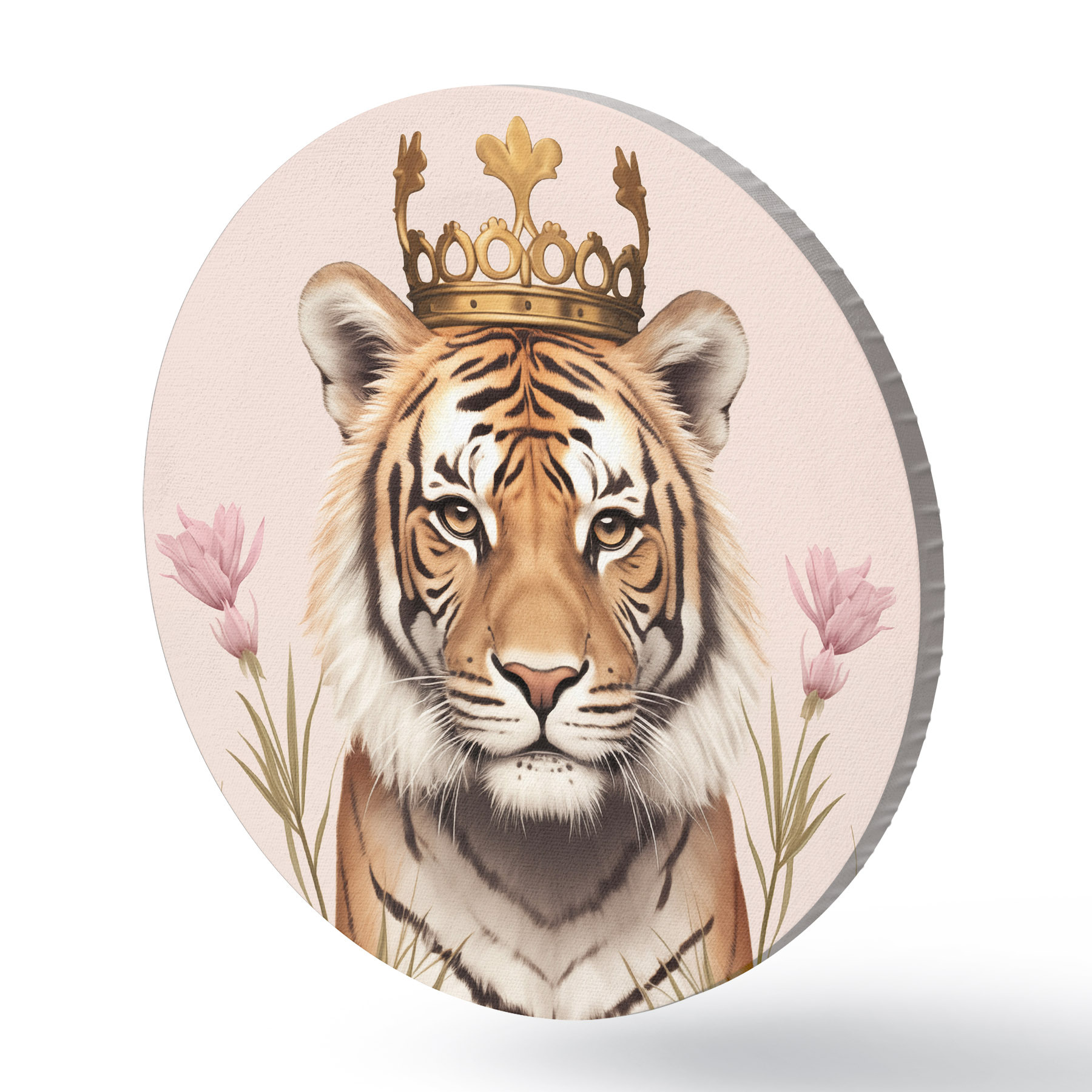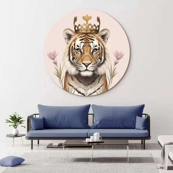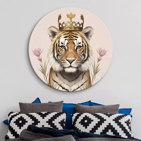 Ronde schilderijen Tijger met kroon, roze achtergrond, tulpenbloemen r42782