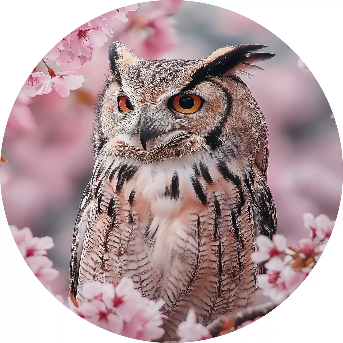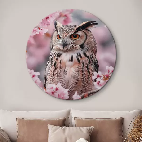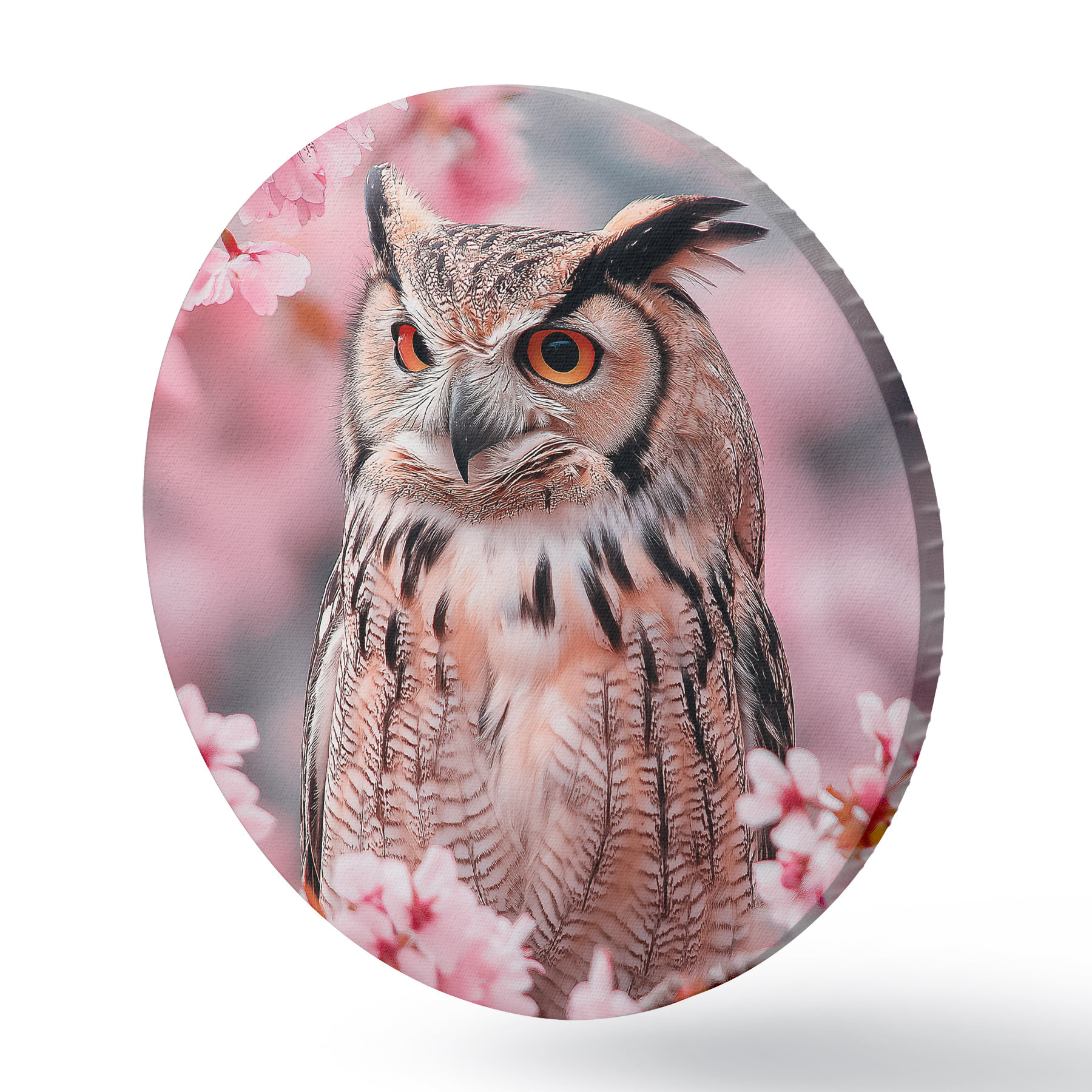 Ronde schilderijen Mooie uil op de tak van een kersenboom, natuur, realisme r42784