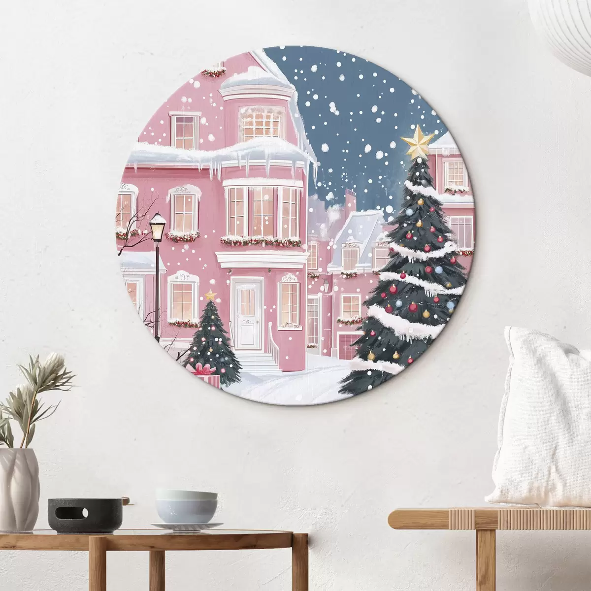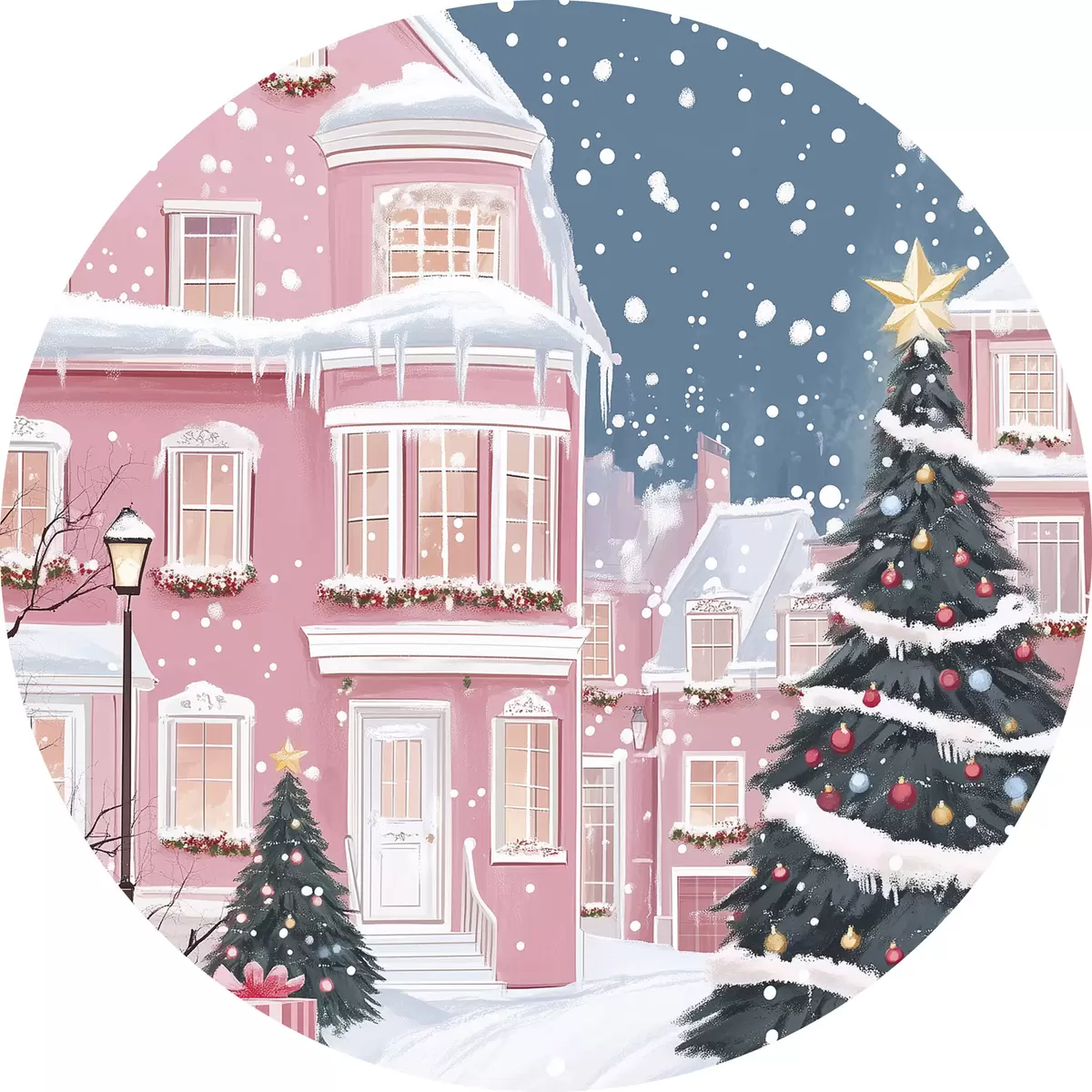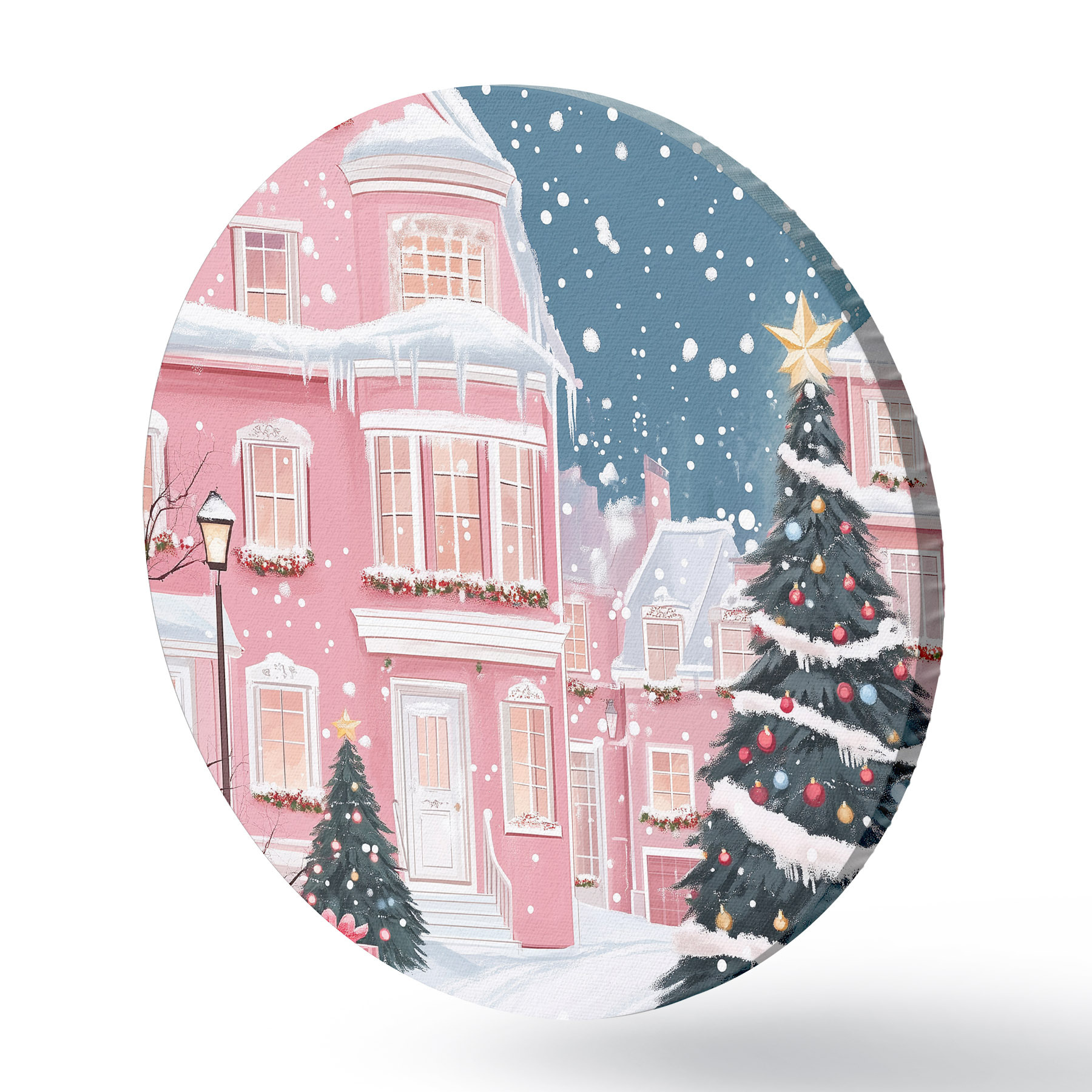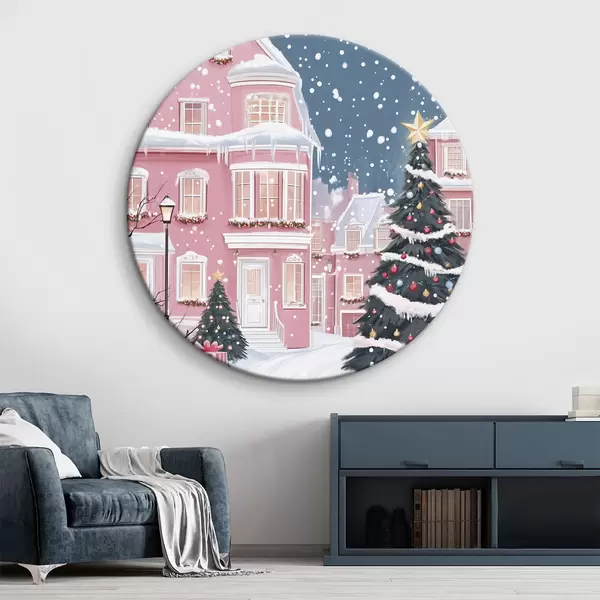 Ronde schilderijen Winterstad met roze huizen, kerstbomen, sneeuwvlokken r42792