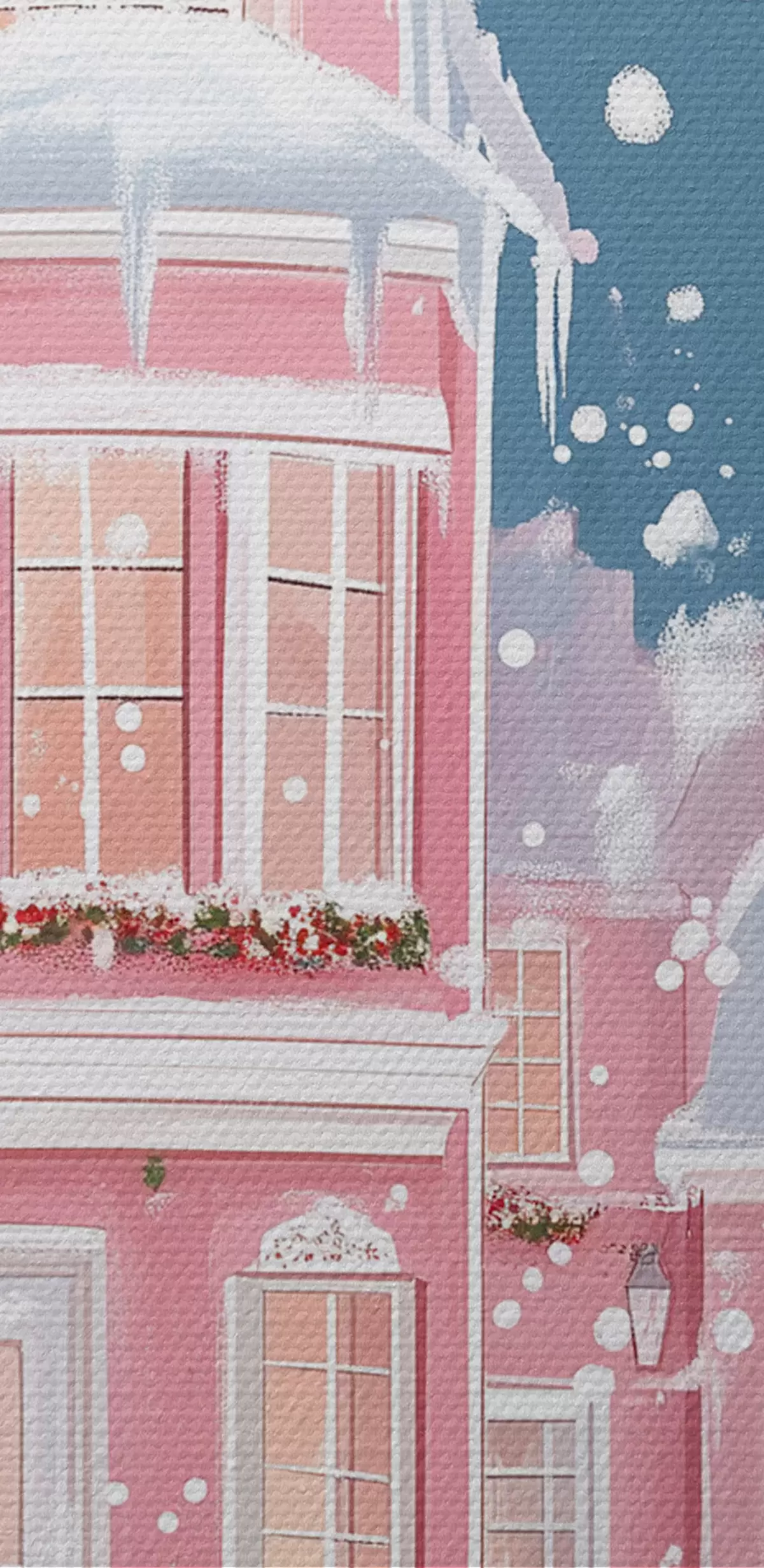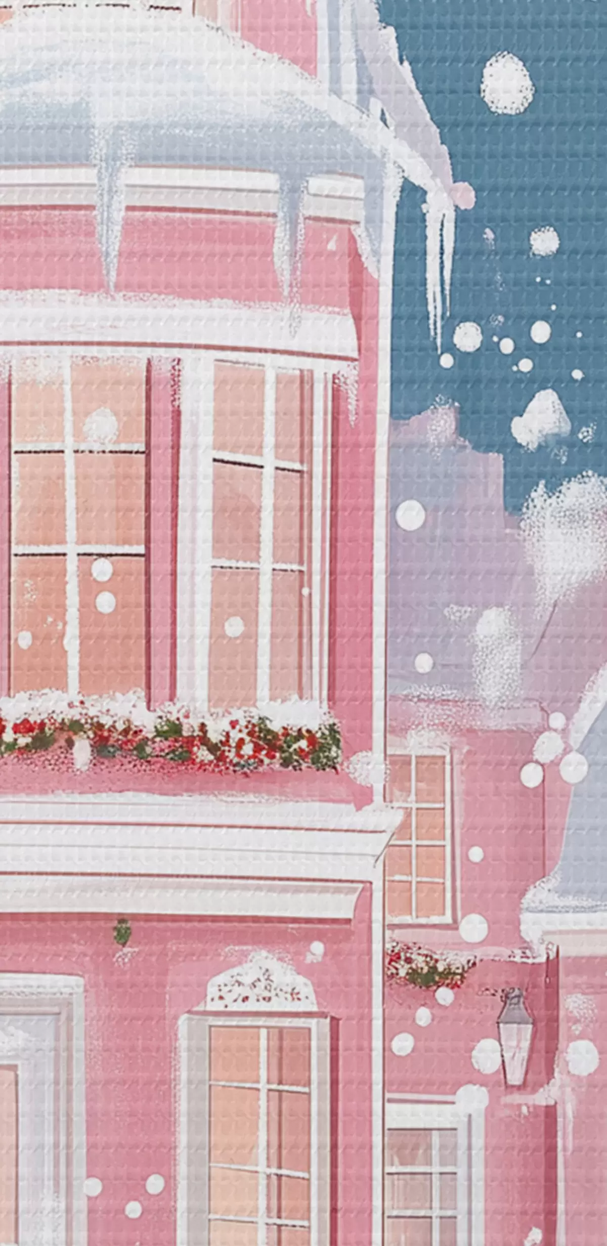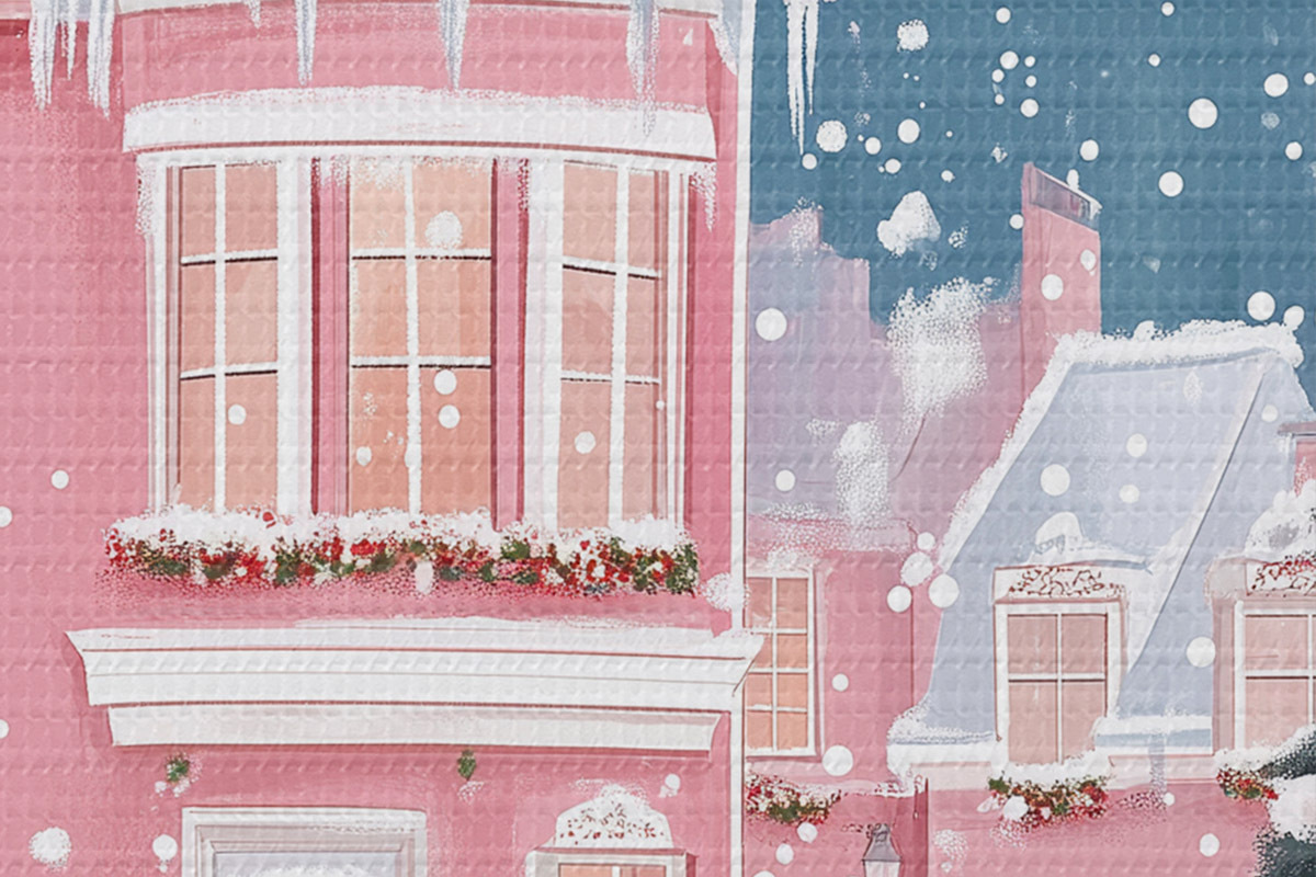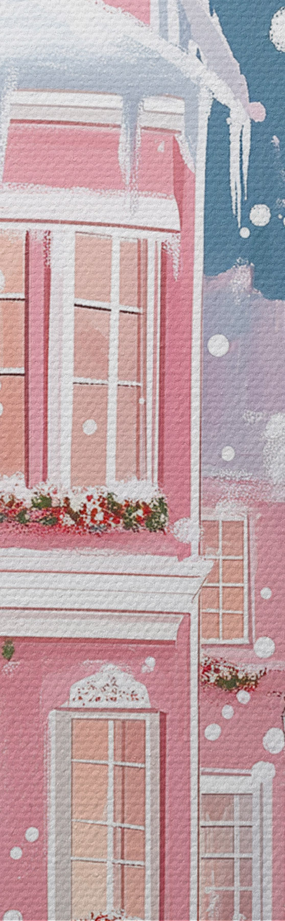 Afbeelding Winterstad met roze huizen, kerstbomen, sneeuwvlokken Nr r42792