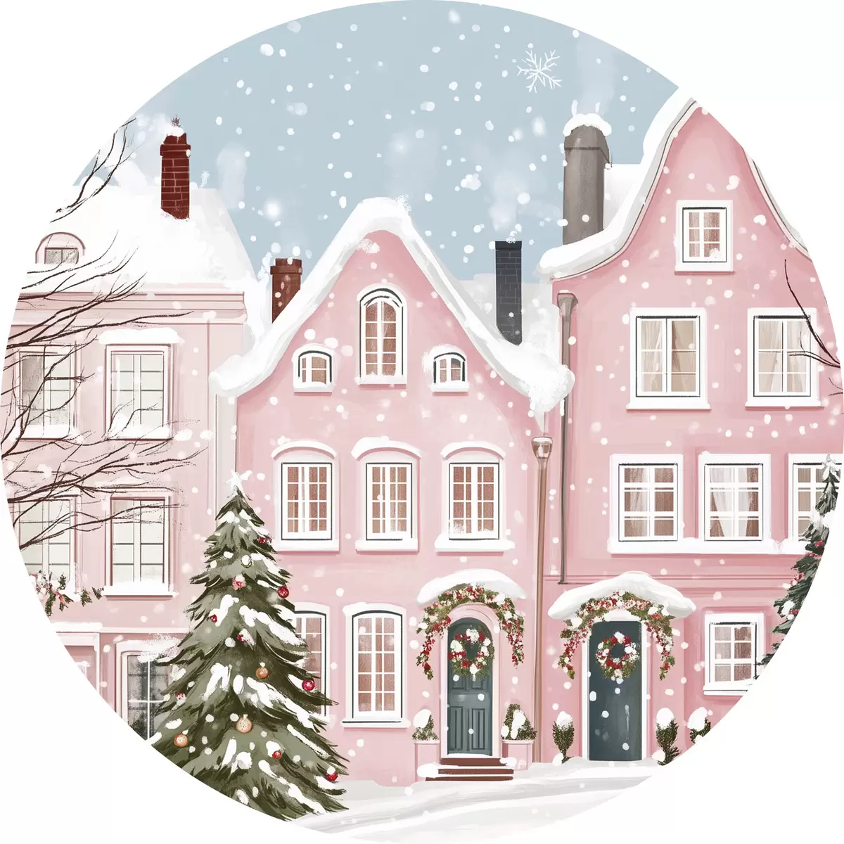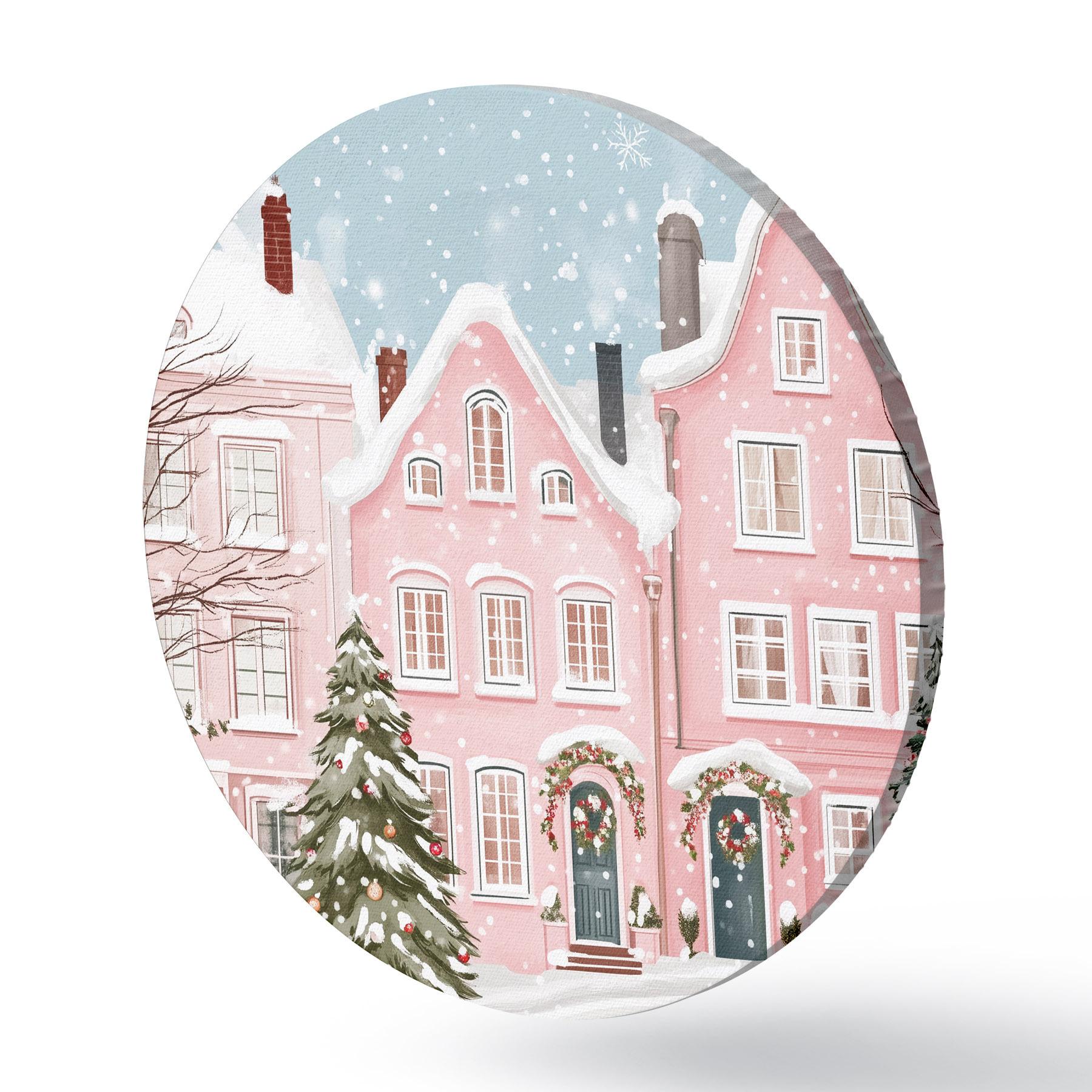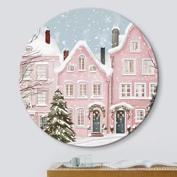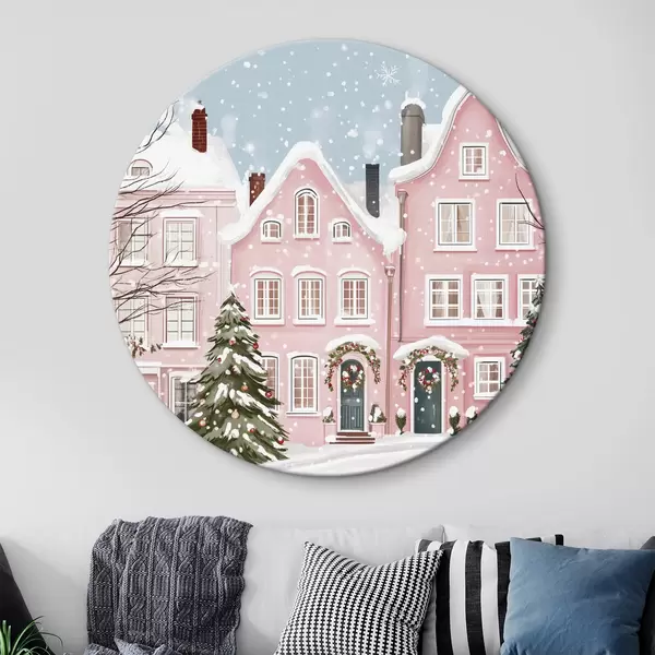 Ronde schilderijen Mooie stad met schattige roze huizen, winterse esthetiek, sneeuwvlokken r42793