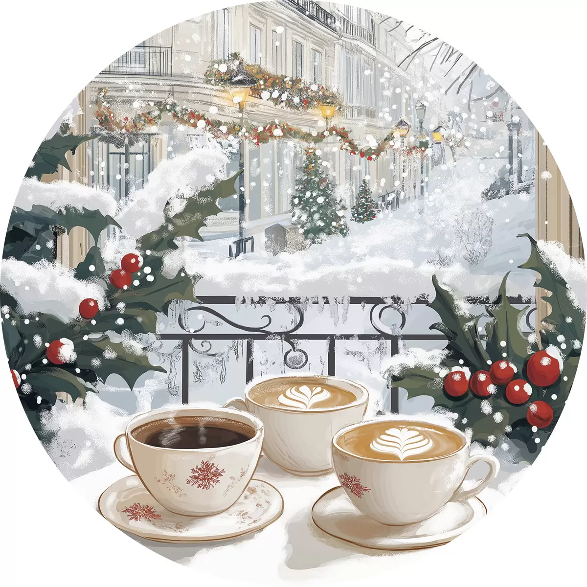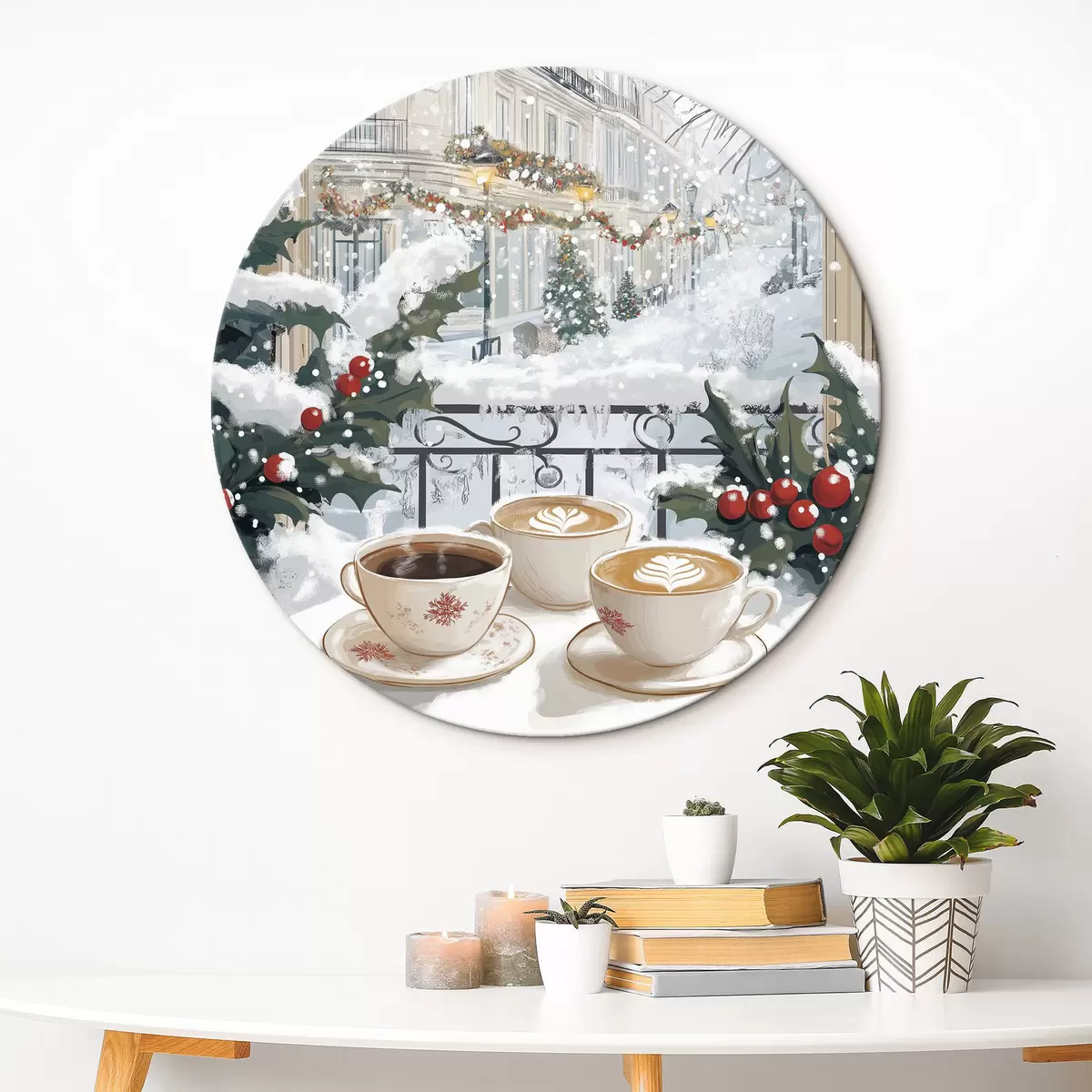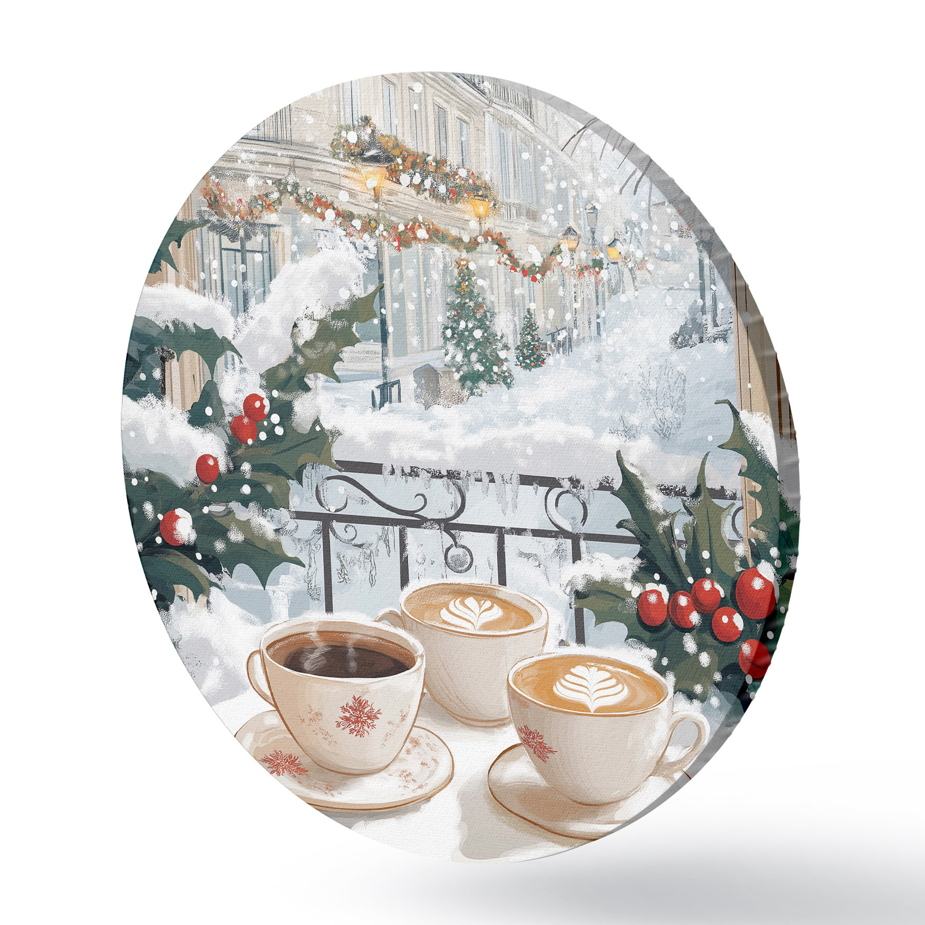Ronde schilderijen Winterse esthetiek, kopjes koffie, restaurant, stadsstraat r42794