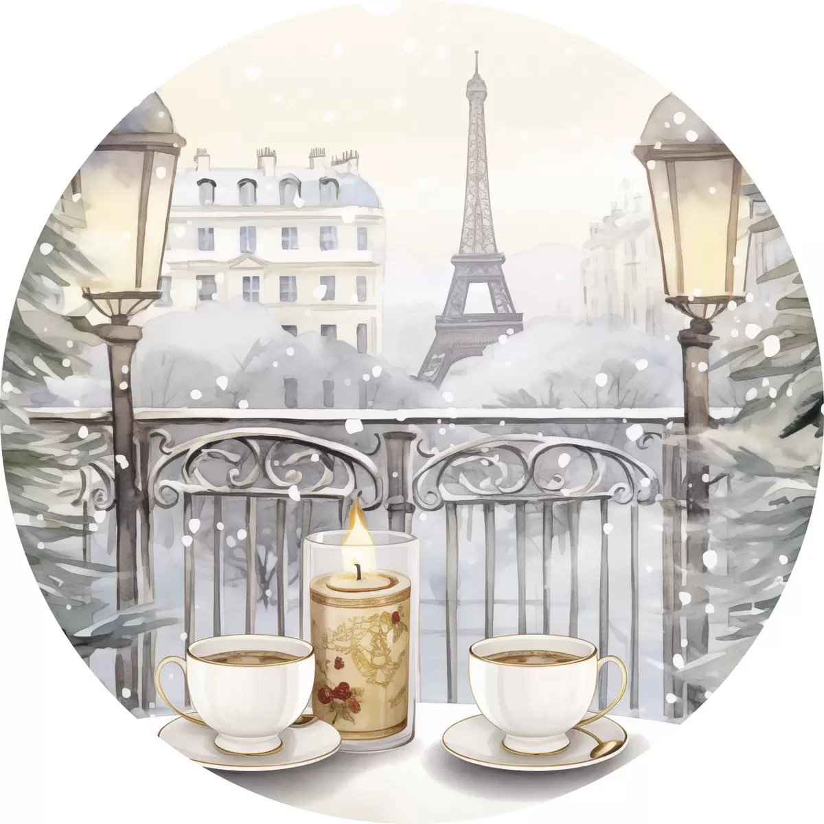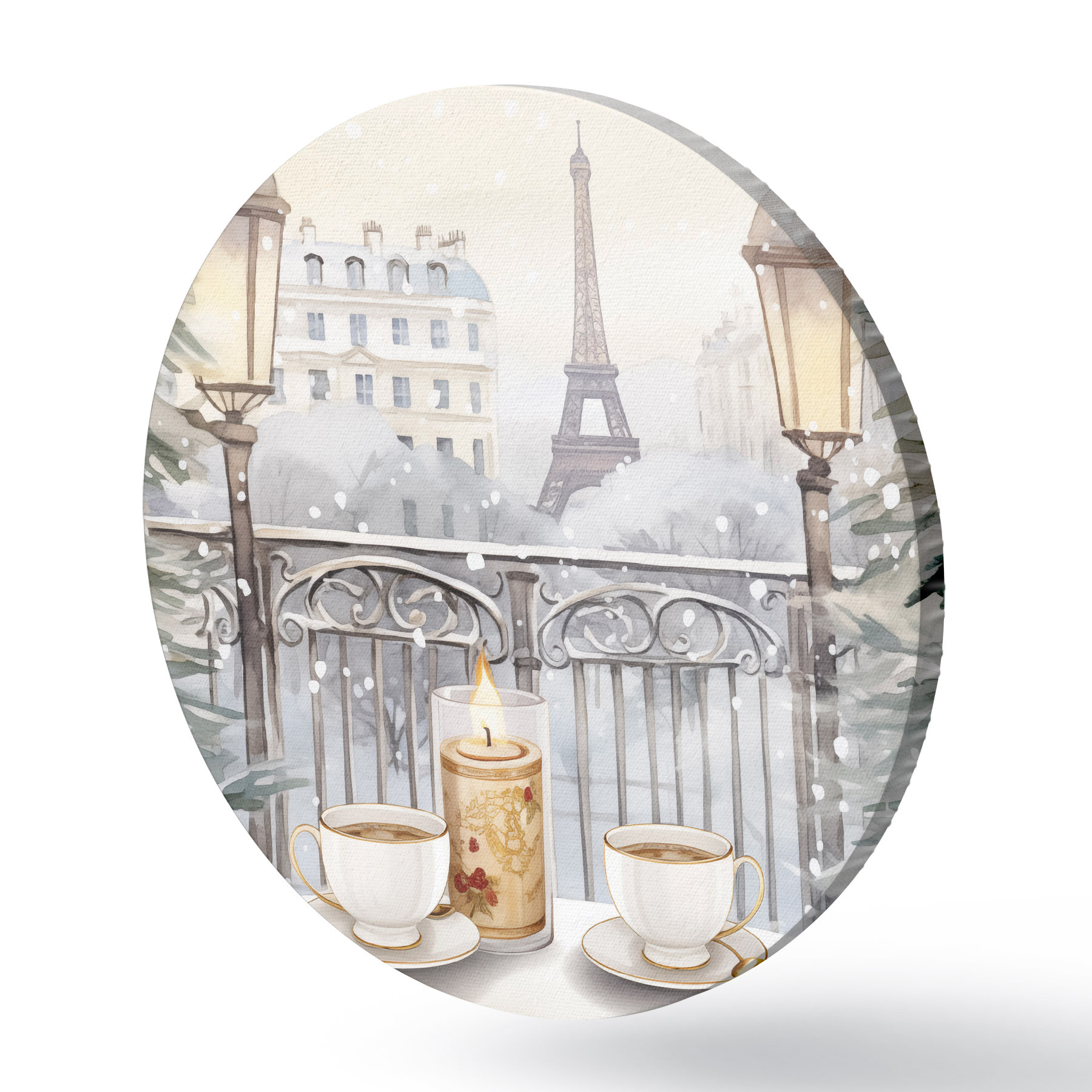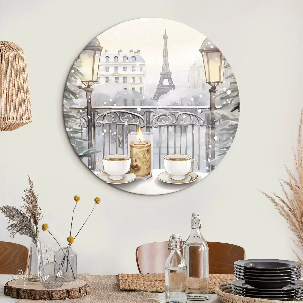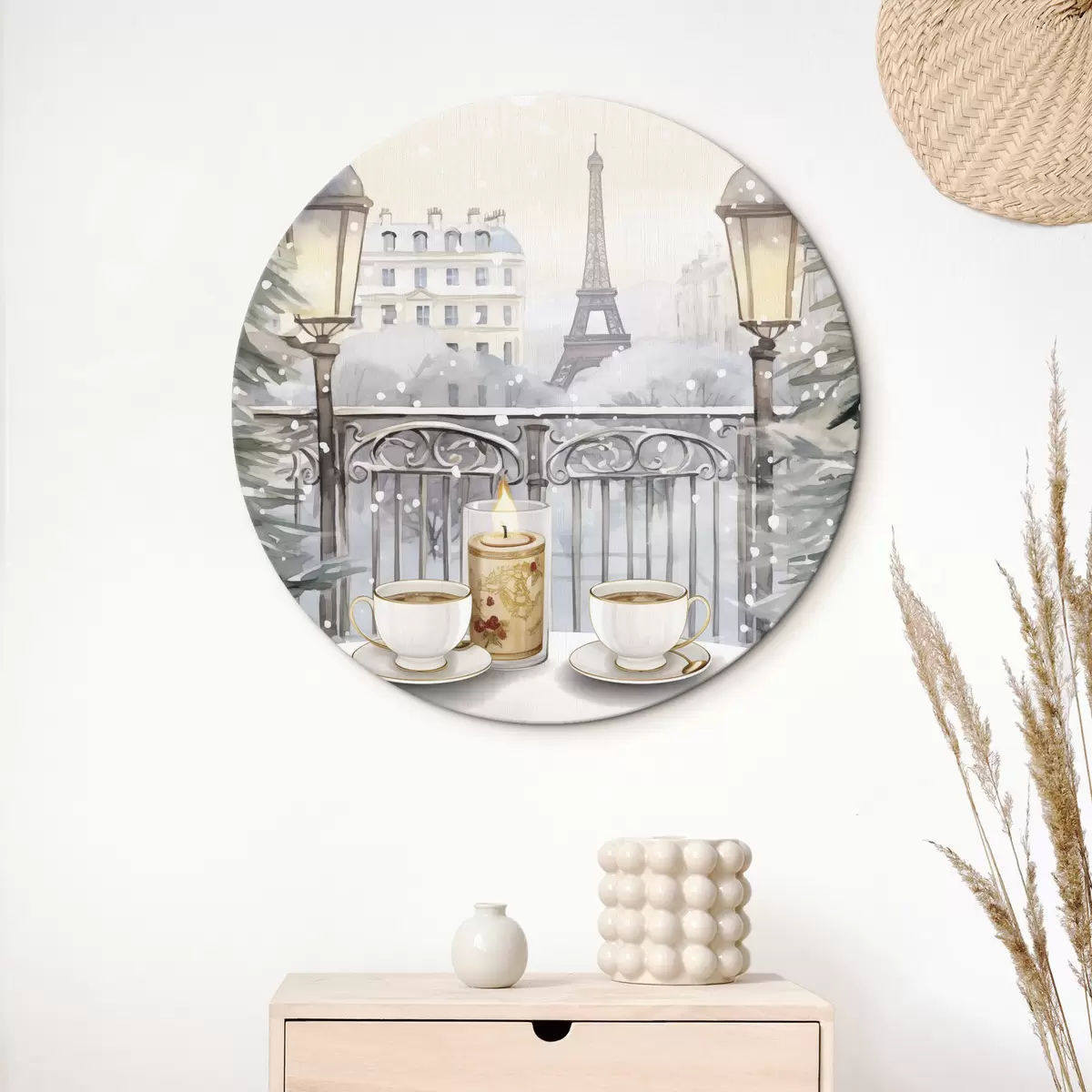 Ronde schilderijen Mooi café in Parijs, theekopjes, romantisch uitzicht, winter, aquarel stijl r42799