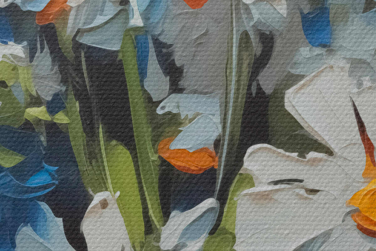 Er zijn drie soorten materiaal te bestellen: Economic Canvas - een dicht en duurzaam materiaal voor digitaal printen, identiek aan schildersdoek, waterdicht oppervlak, realistische weergave van details, materiaal met gemiddelde korrel. Premium Canvas - de textuur lijkt op die van schildersdoek (verweven kleine draden). Zachte, gedetailleerde reproductie van de afbeelding op een mat oppervlak. Eco-Premium - hoogwaardige 100% katoenen stof. Dankzij de natuurlijke katoenvezels is het materiaal duurzaam en slijtvast. Uitstekende kleurweergave en detail.
