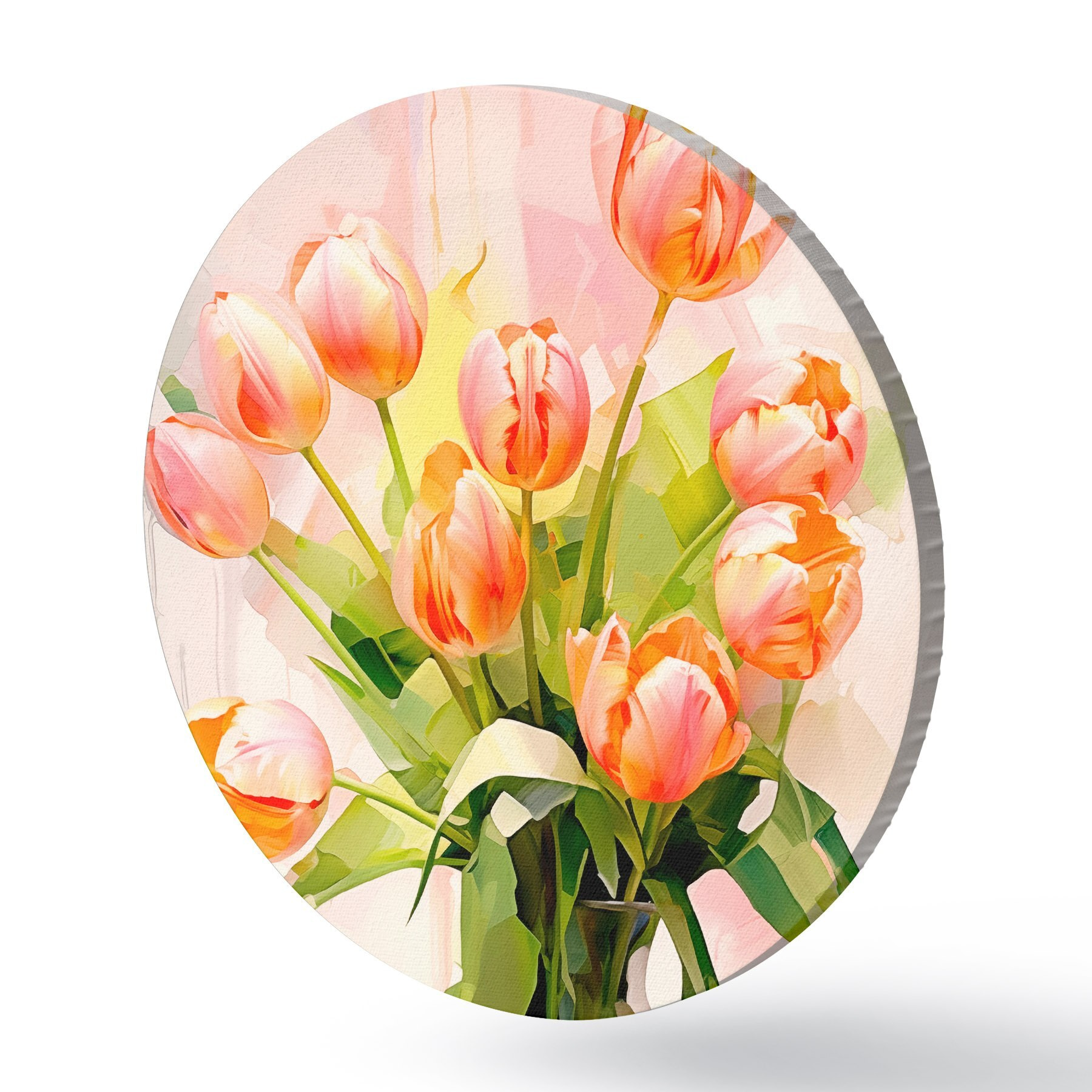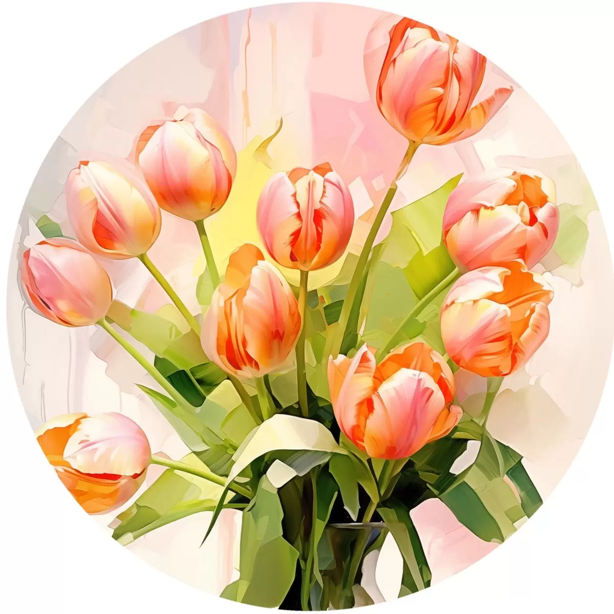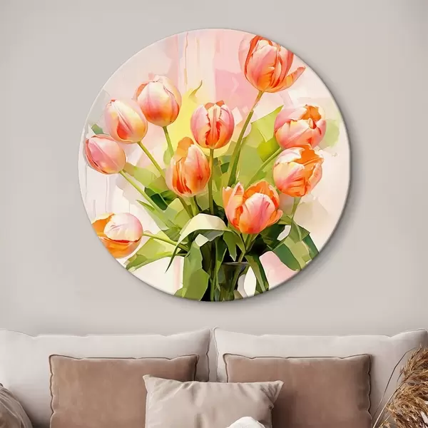 Ronde schilderijen Schilderachtig stilleven met tulpen in een glazen vaas op een lichte achtergrond r42940