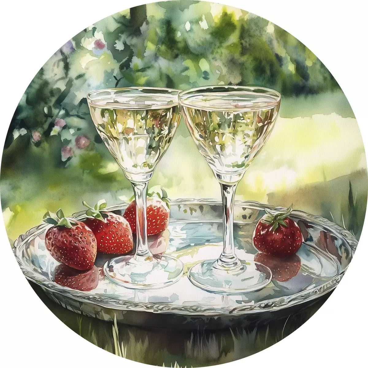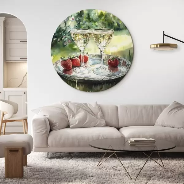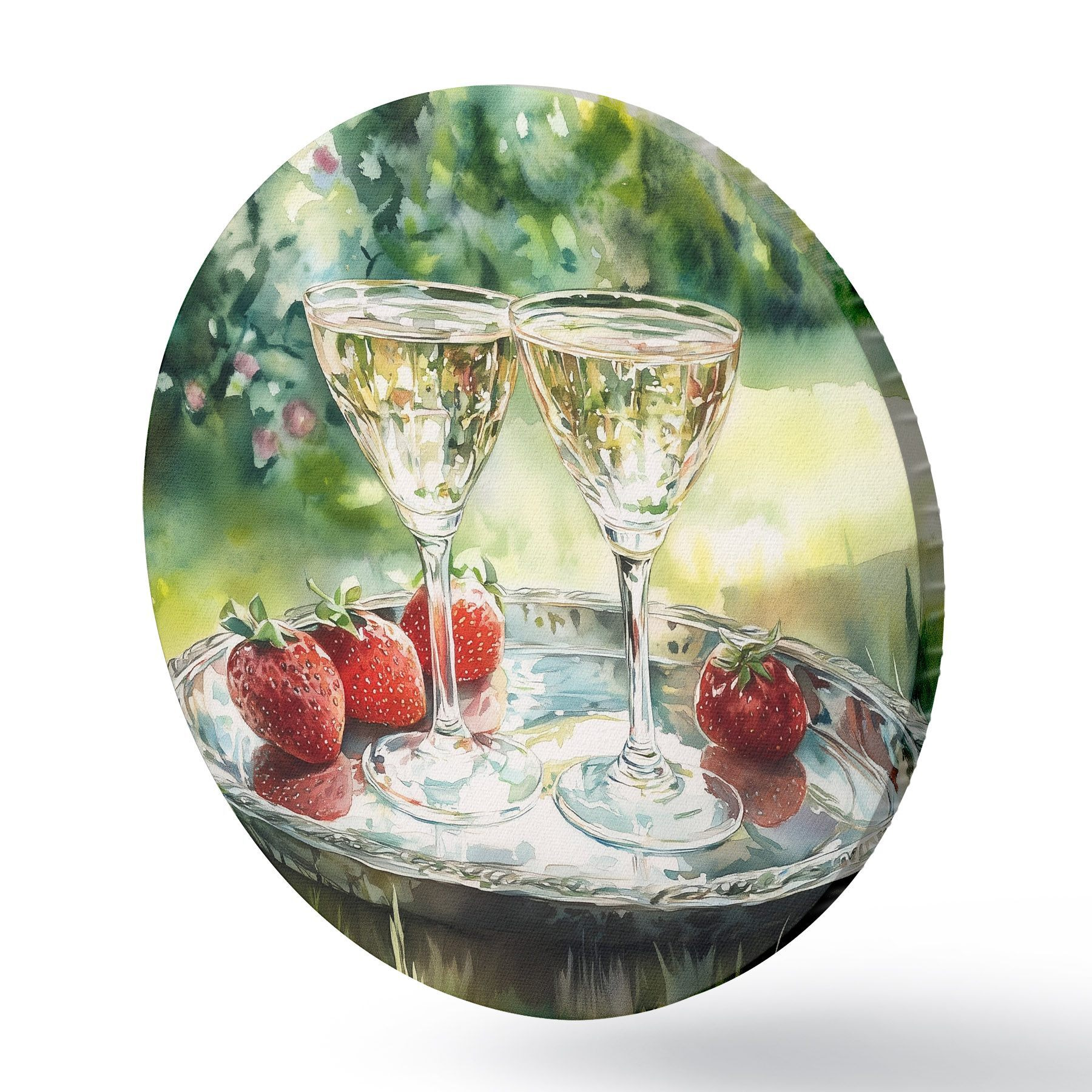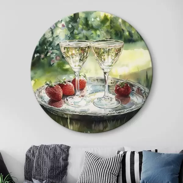 Ronde schilderijen Zomer picknick met champagne en aardbeien, aquarel tekening r43055