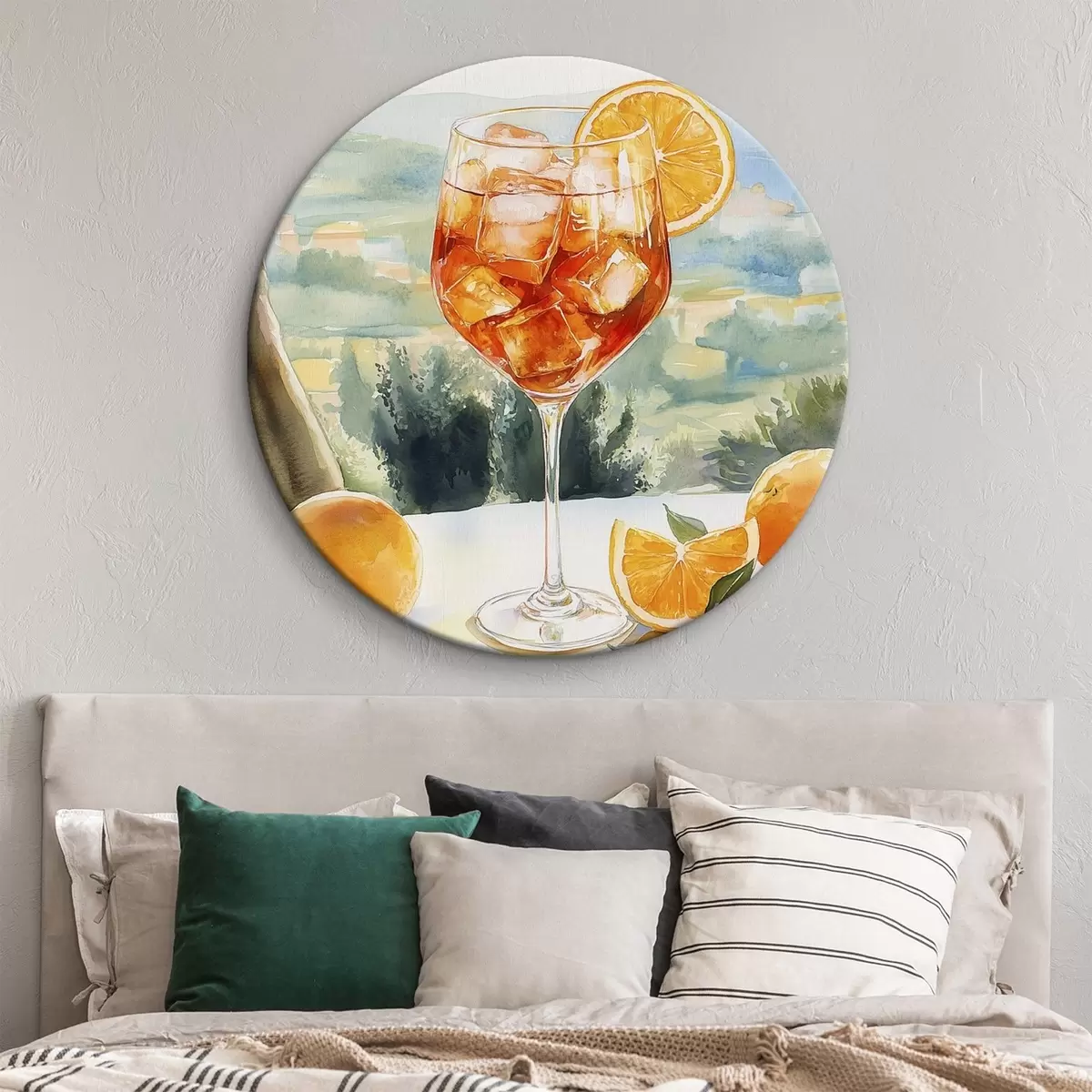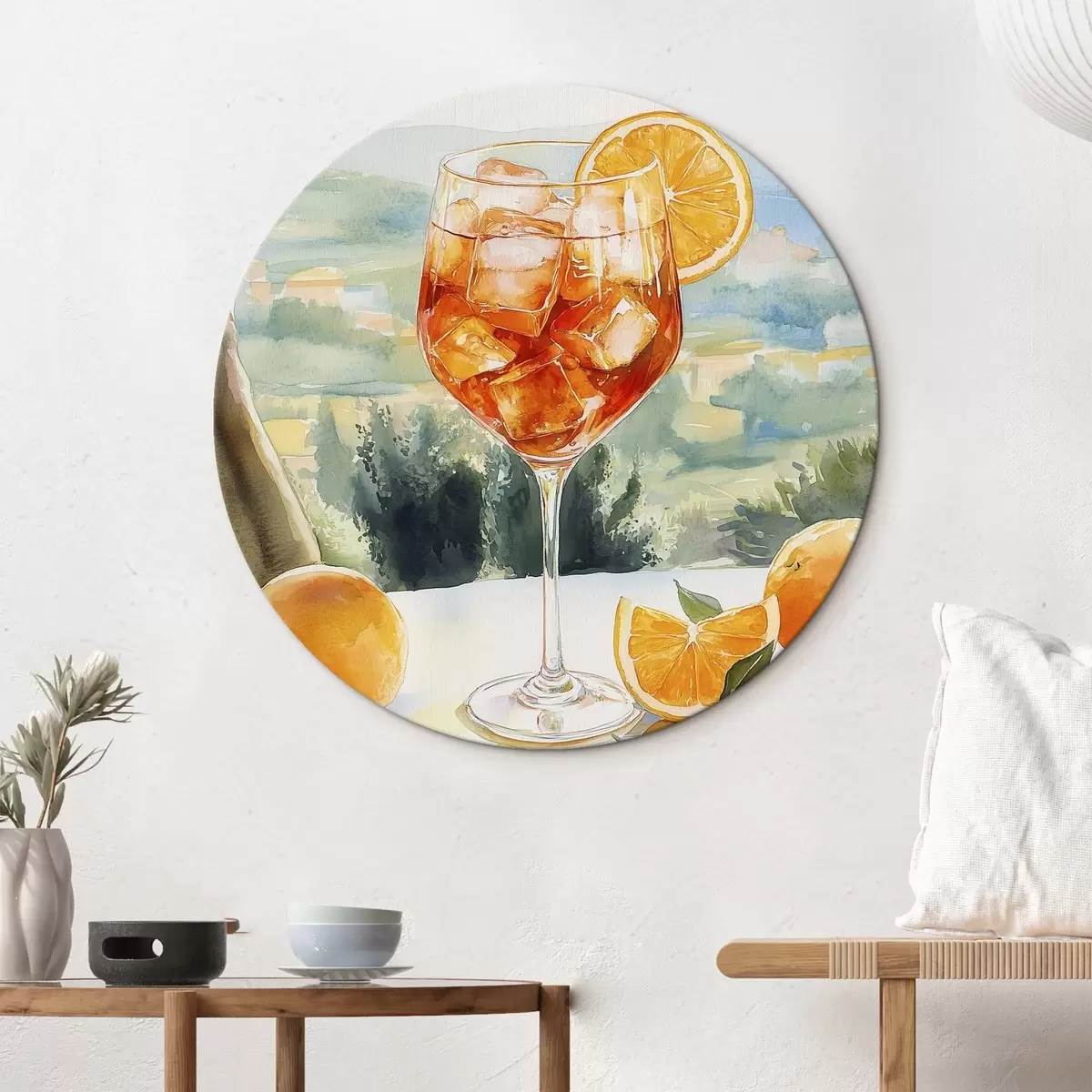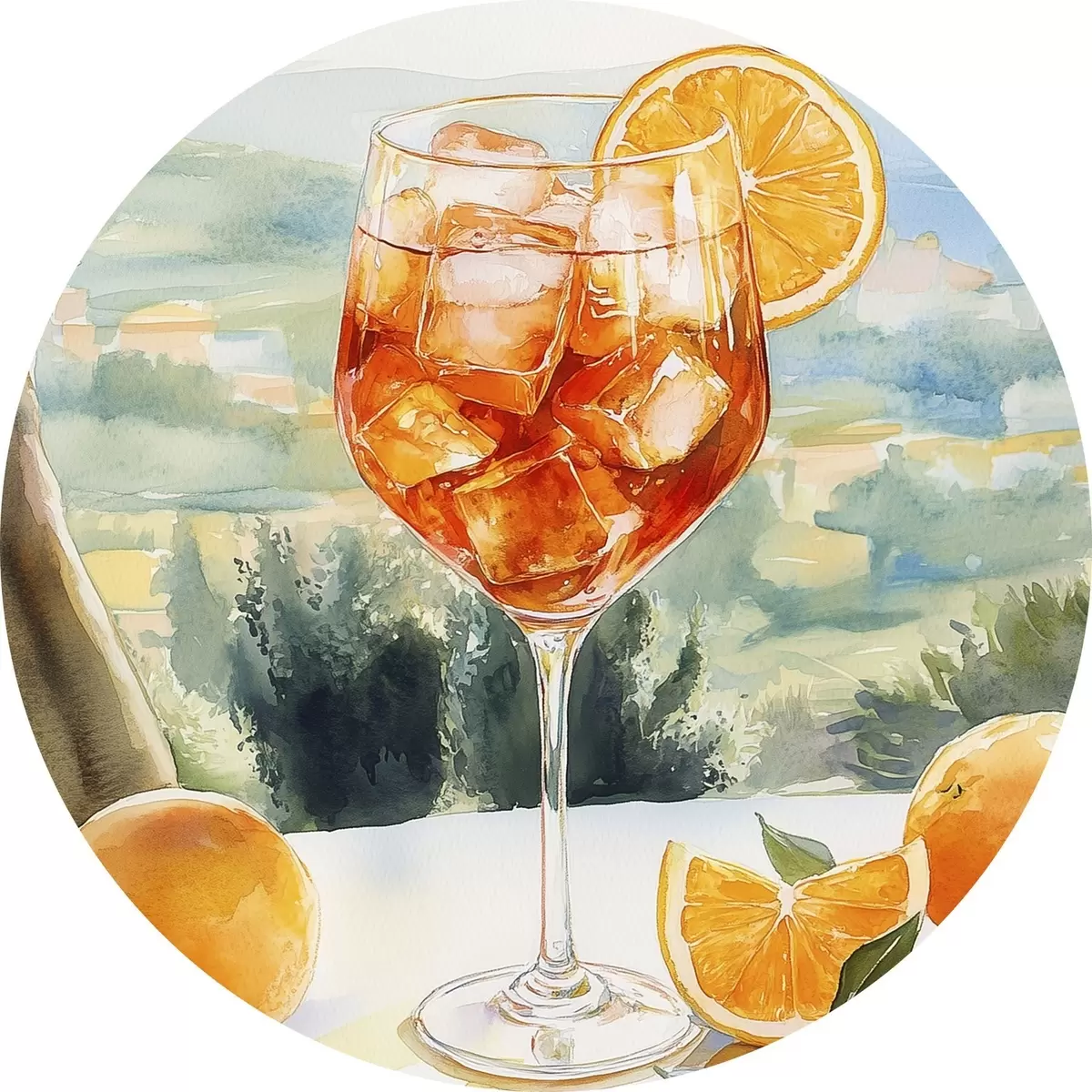 Ronde schilderijen Zomercocktail, Aperol Spritz, sinaasappels, aquareltekening r43058