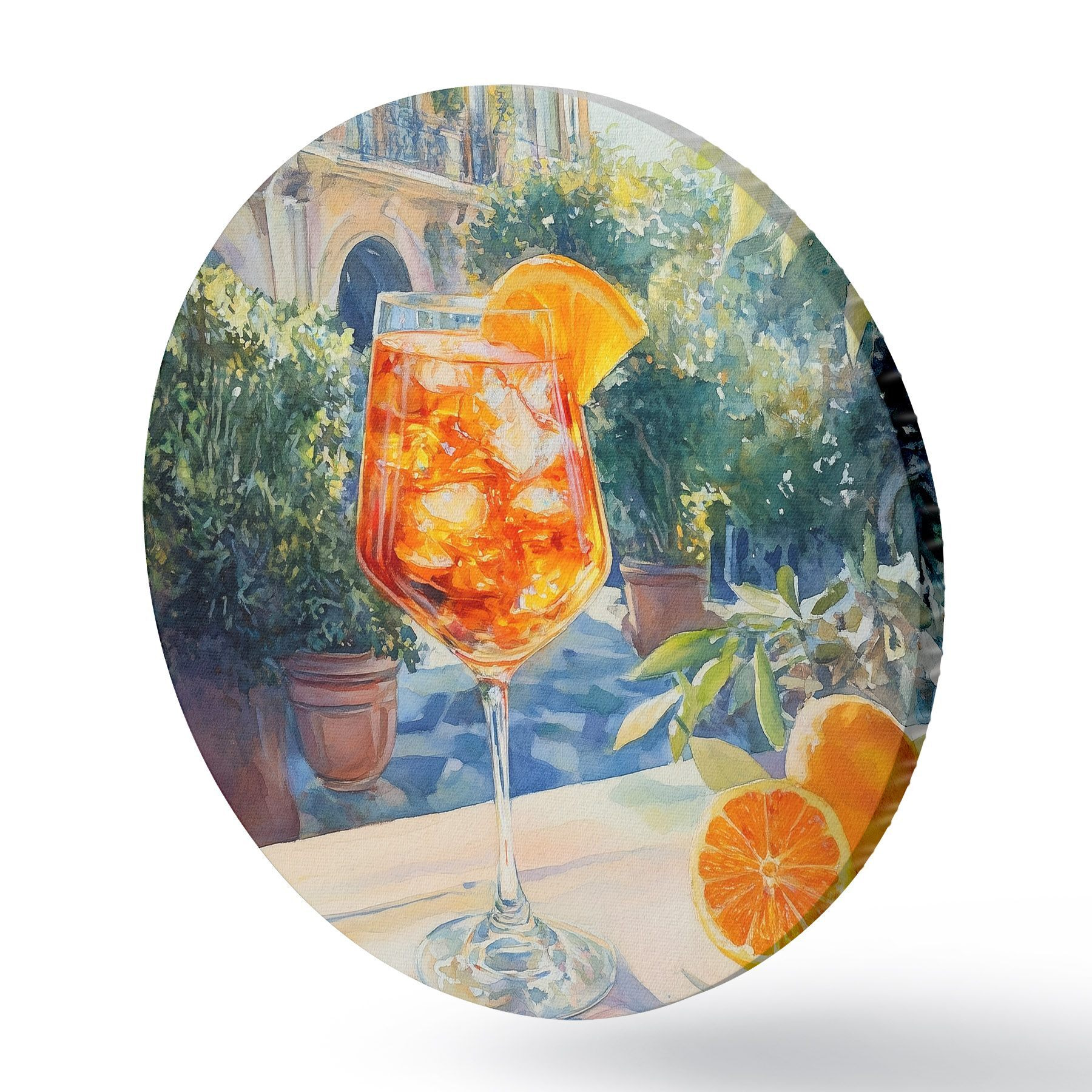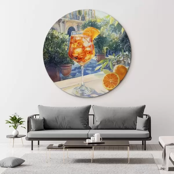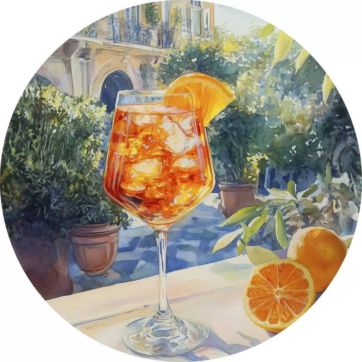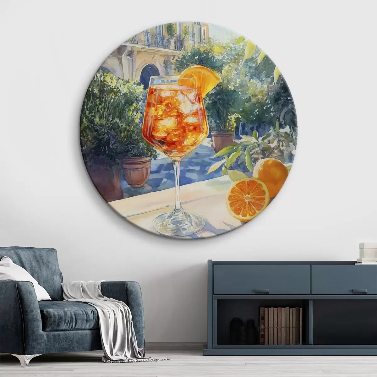 Ronde schilderijen Cocktail met sinaasappels, aquarelstijl, Italië, Aperol Spritz, architectuur, zomertuin r43061