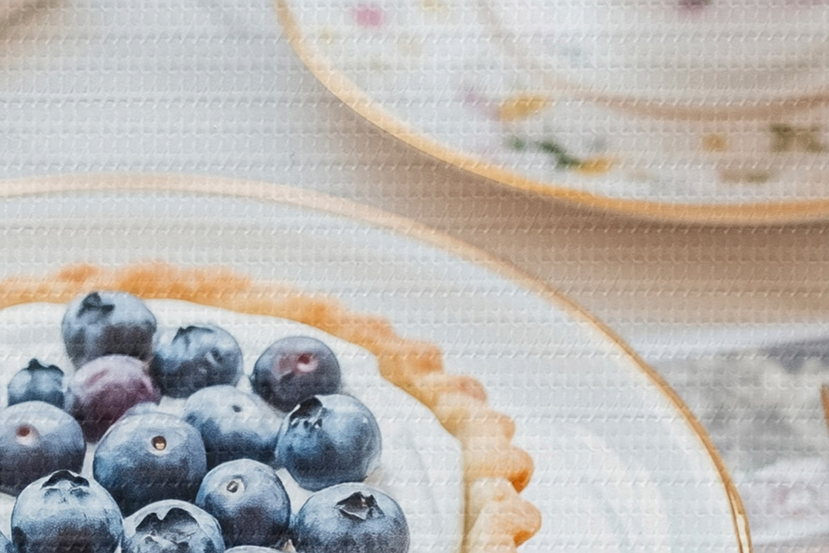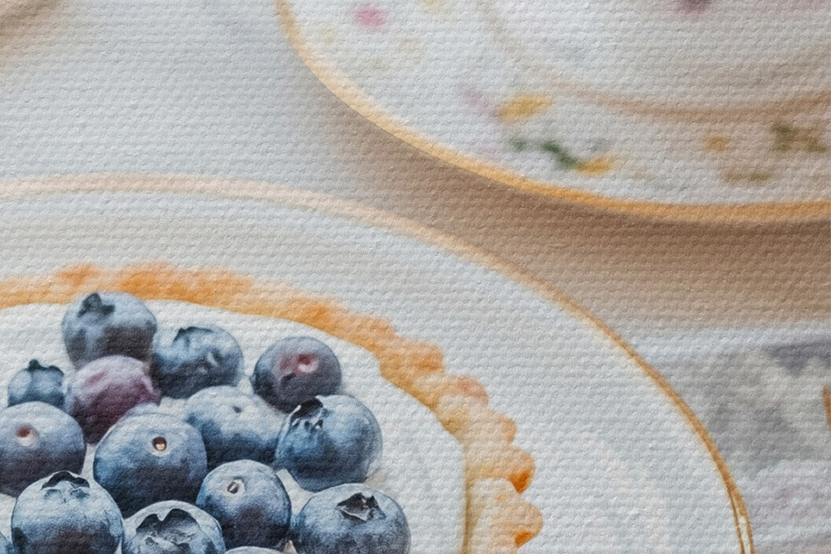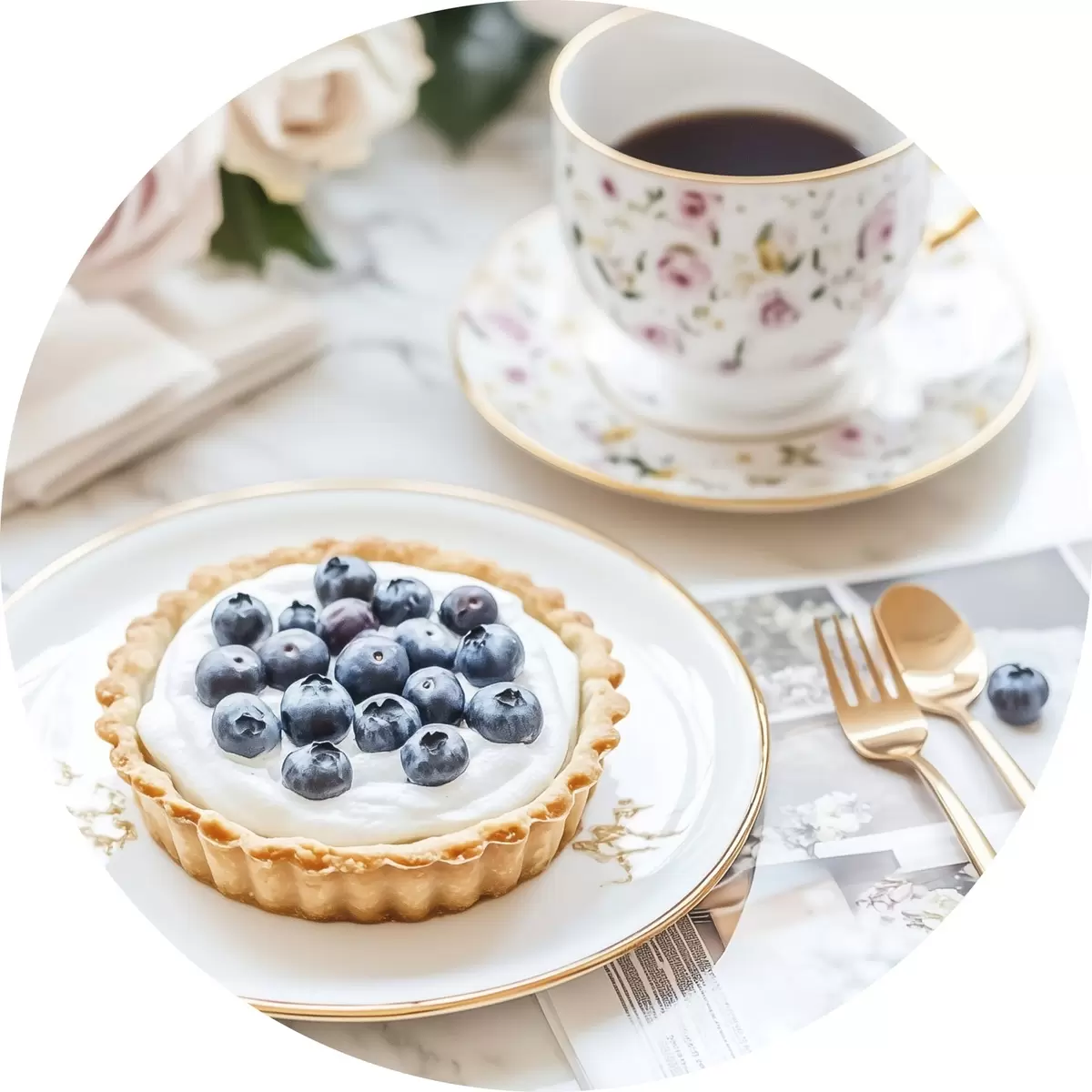 Afbeelding Bosbessen cupcake met kopje thee, boho stijl, roze rozen Nr r43066