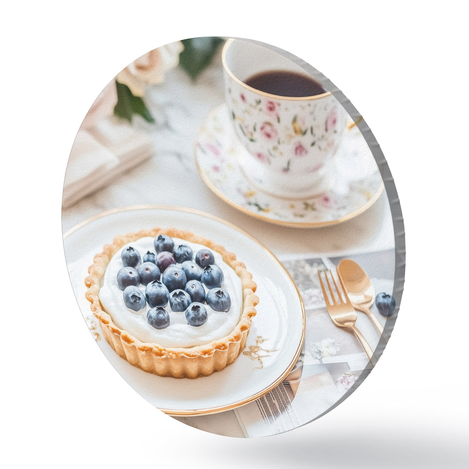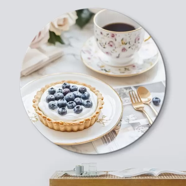 Ronde schilderijen Bosbessen cupcake met kopje thee, boho stijl, roze rozen r43066