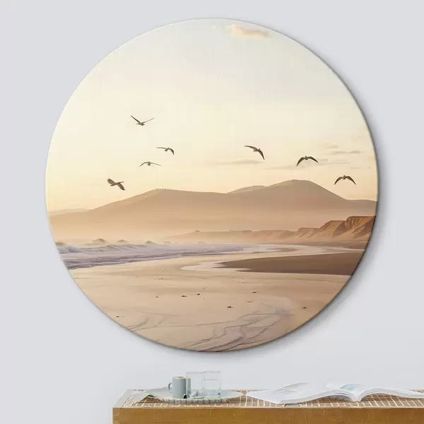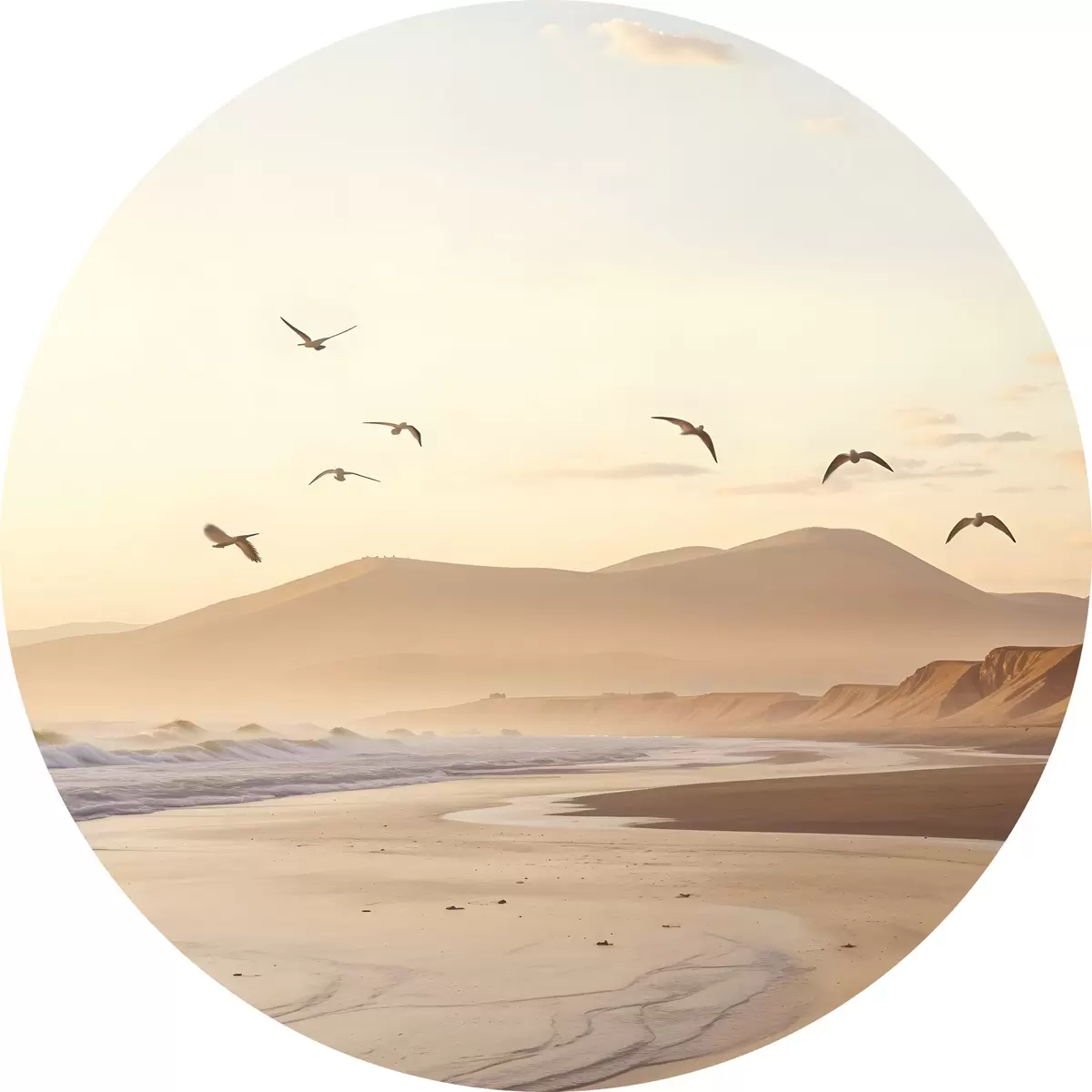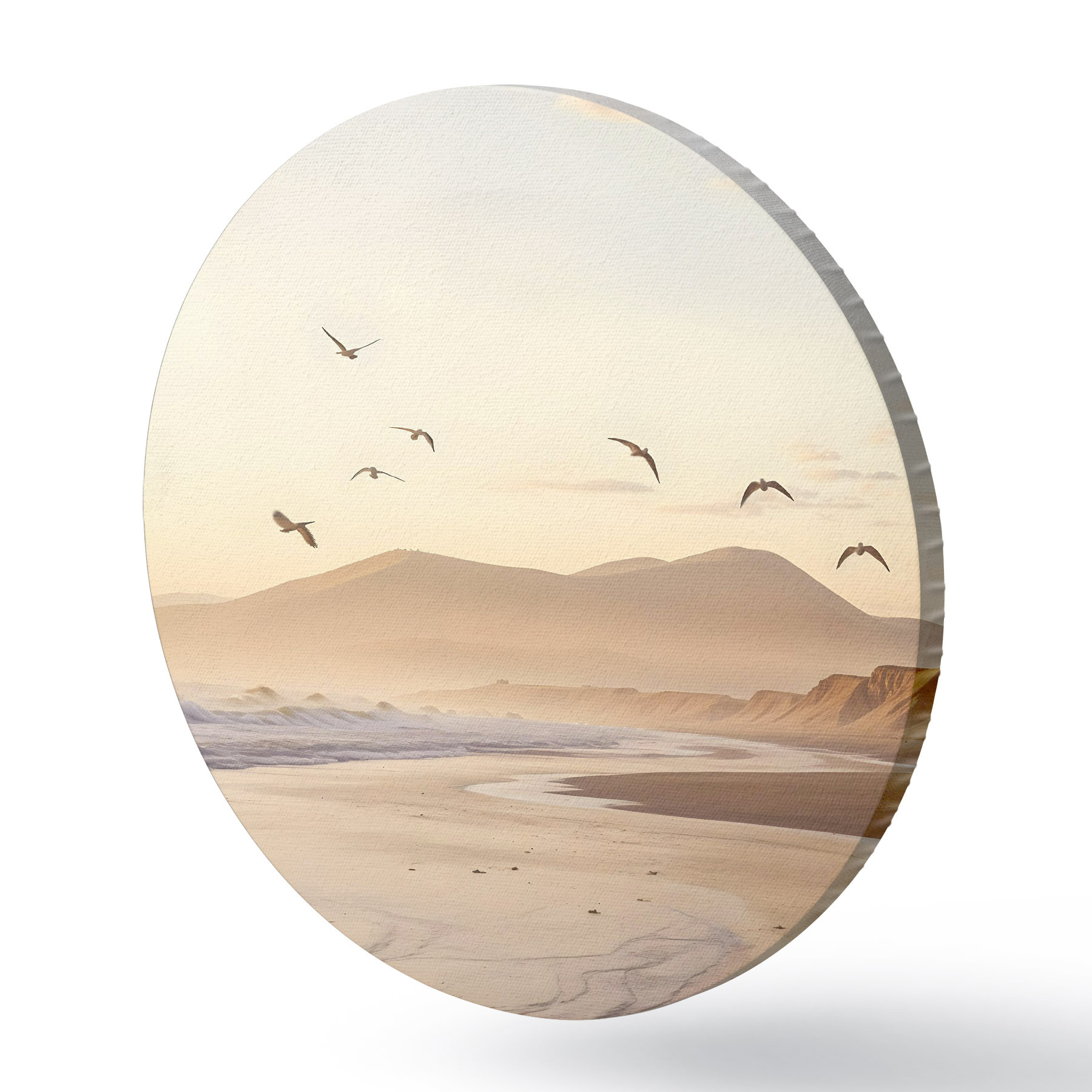 Ronde schilderijen Vogels vliegen over het strand met oceaan, bergen op de achtergrond, warme kleuren, zacht pastel palet r43162