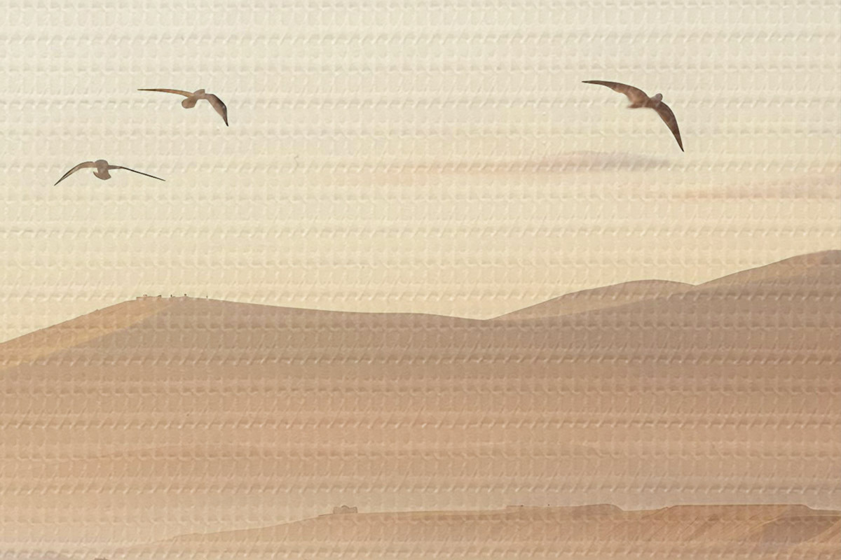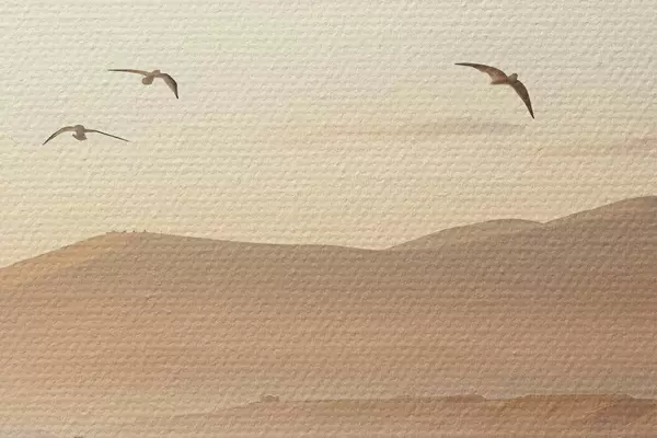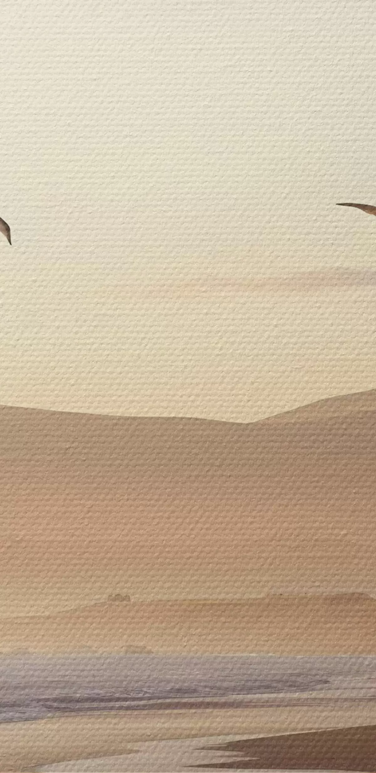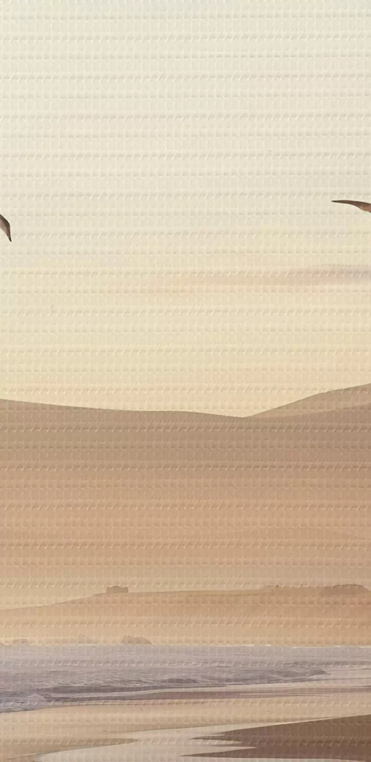 Afbeelding Vogels vliegen over het strand met oceaan, bergen op de achtergrond, warme kleuren, zacht pastel palet Nr r43162