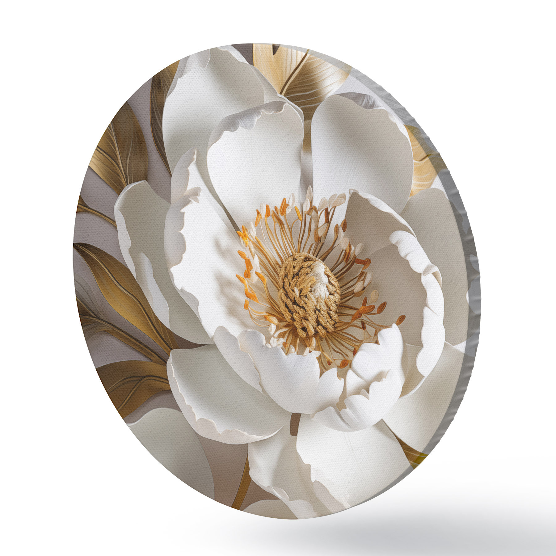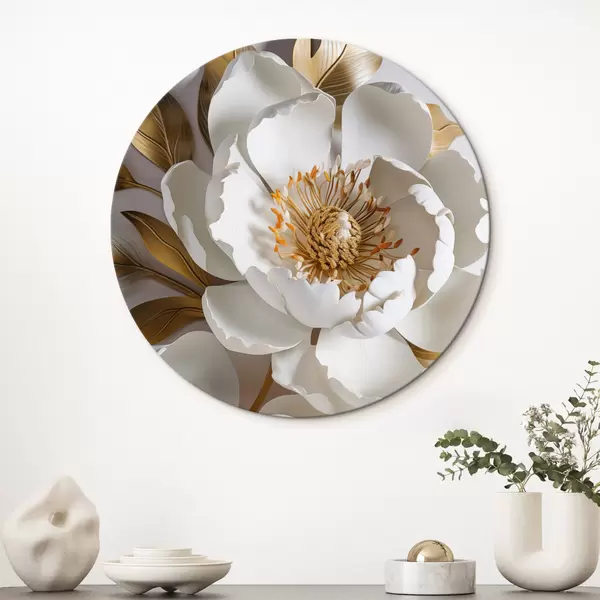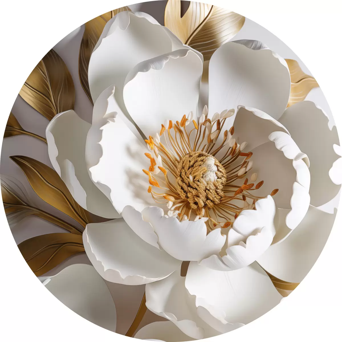 Ronde schilderijen Witte delicate gedetailleerde decoratieve pioenbloemen met gele bladeren, de achtergrond is een lichtgrijze kleur r43176