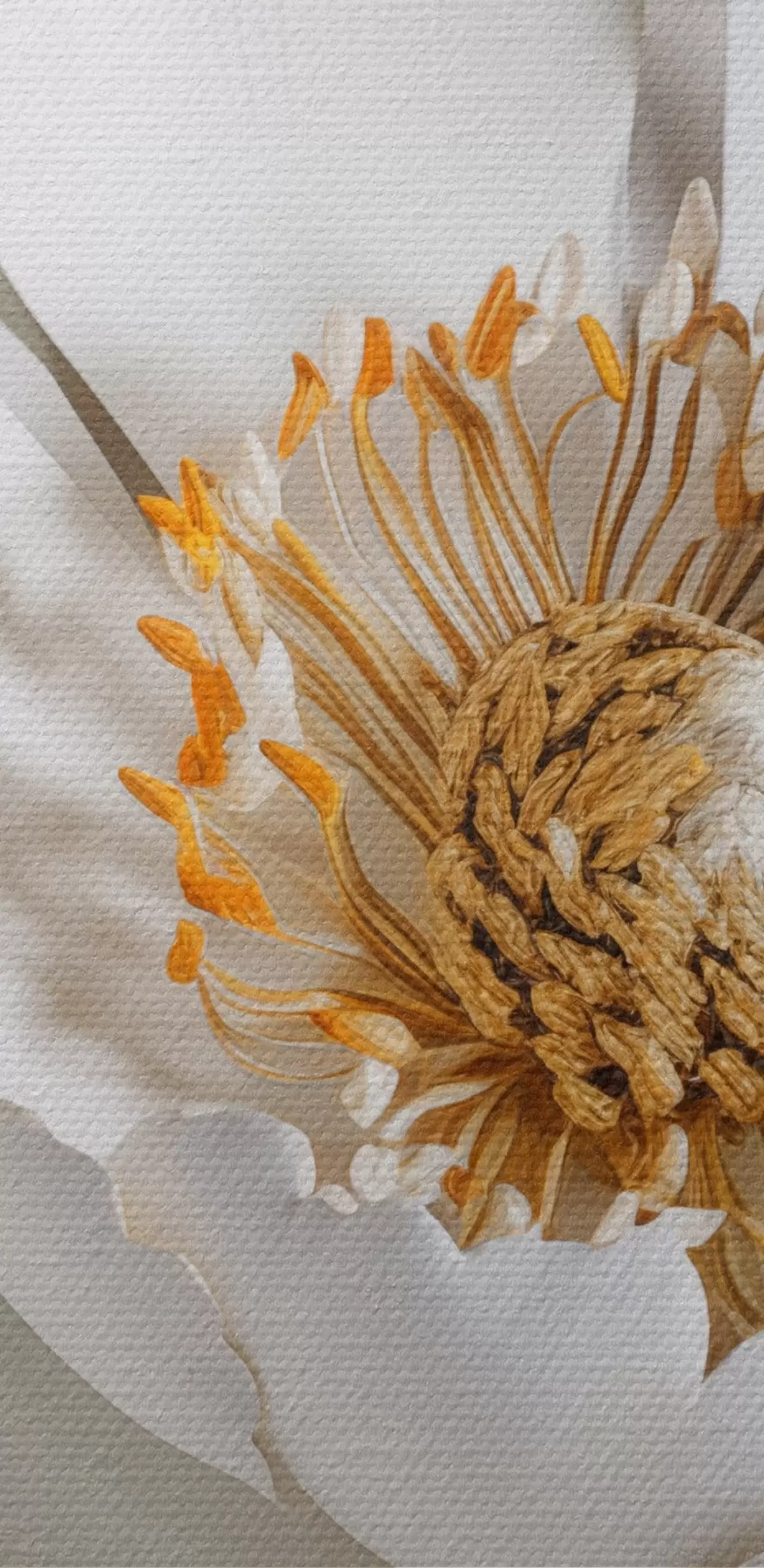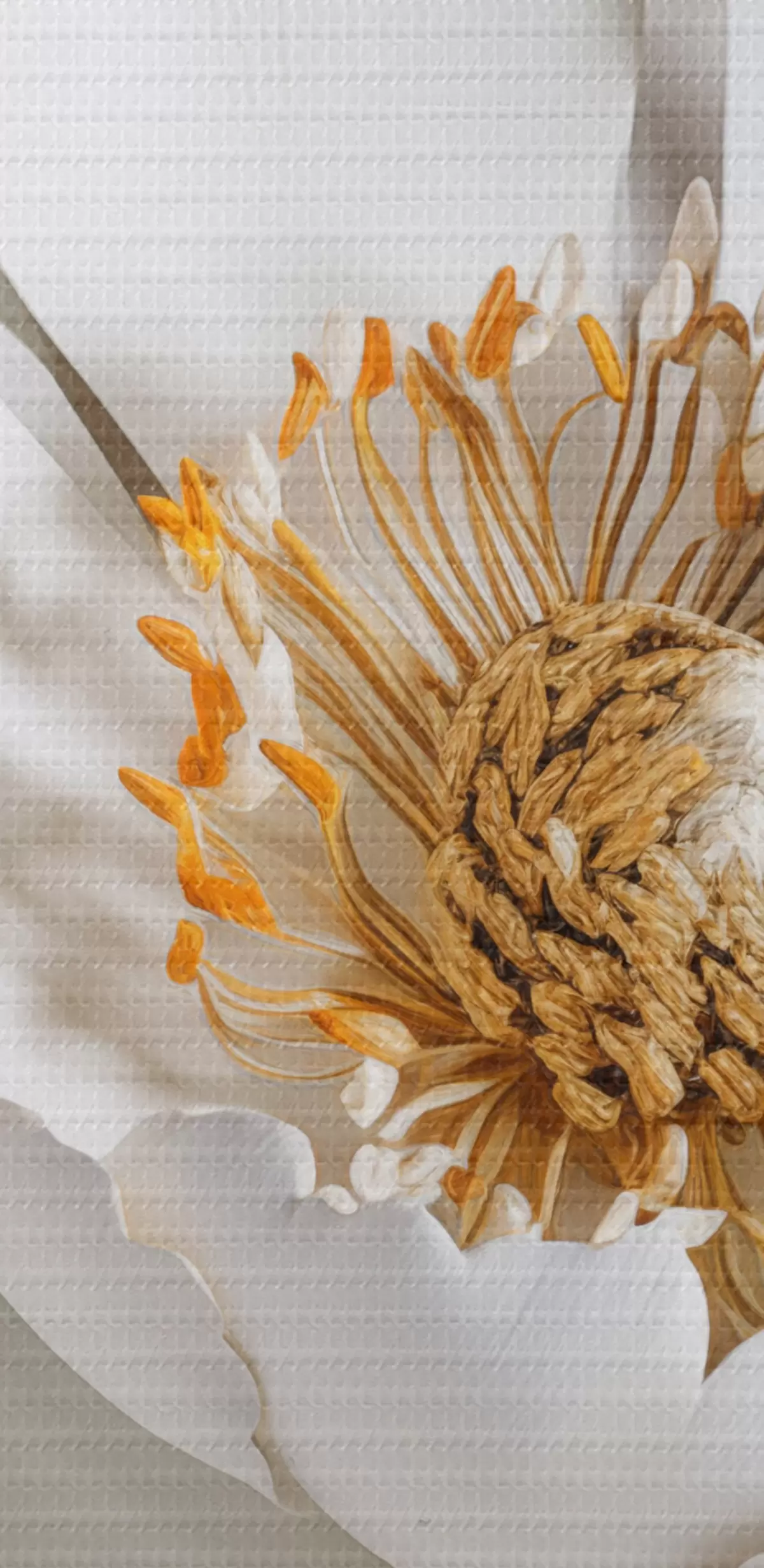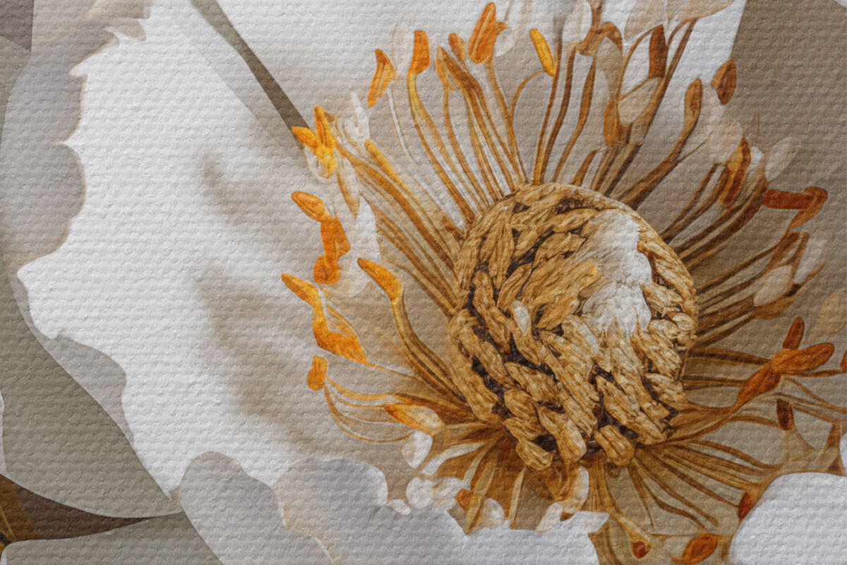 Afbeelding Witte delicate gedetailleerde decoratieve pioenbloemen met gele bladeren, de achtergrond is een lichtgrijze kleur Nr r43176