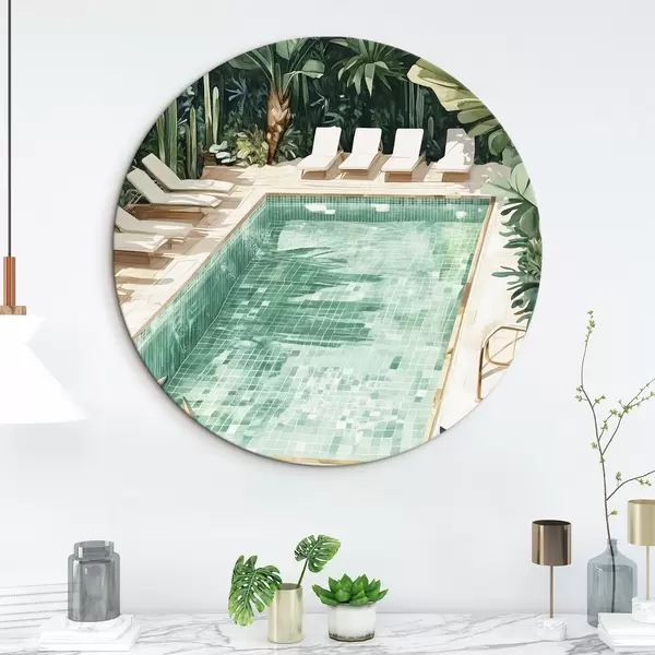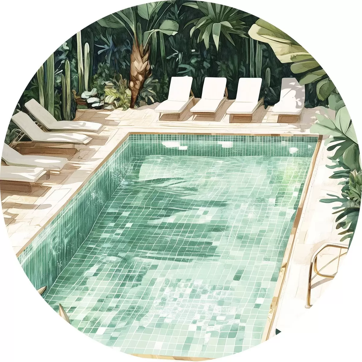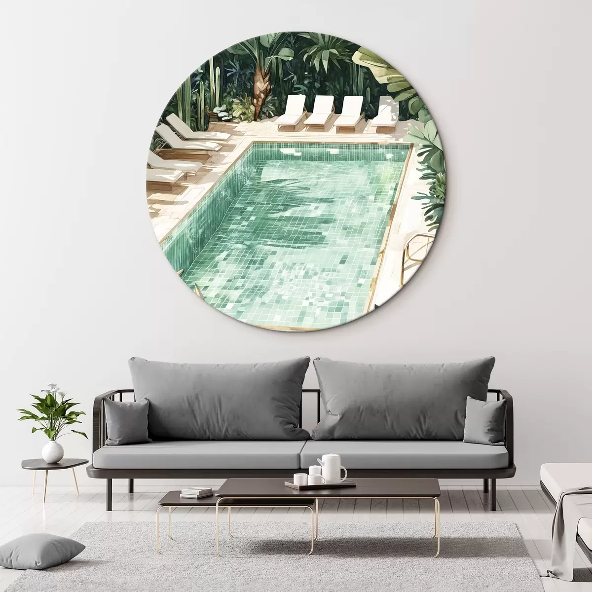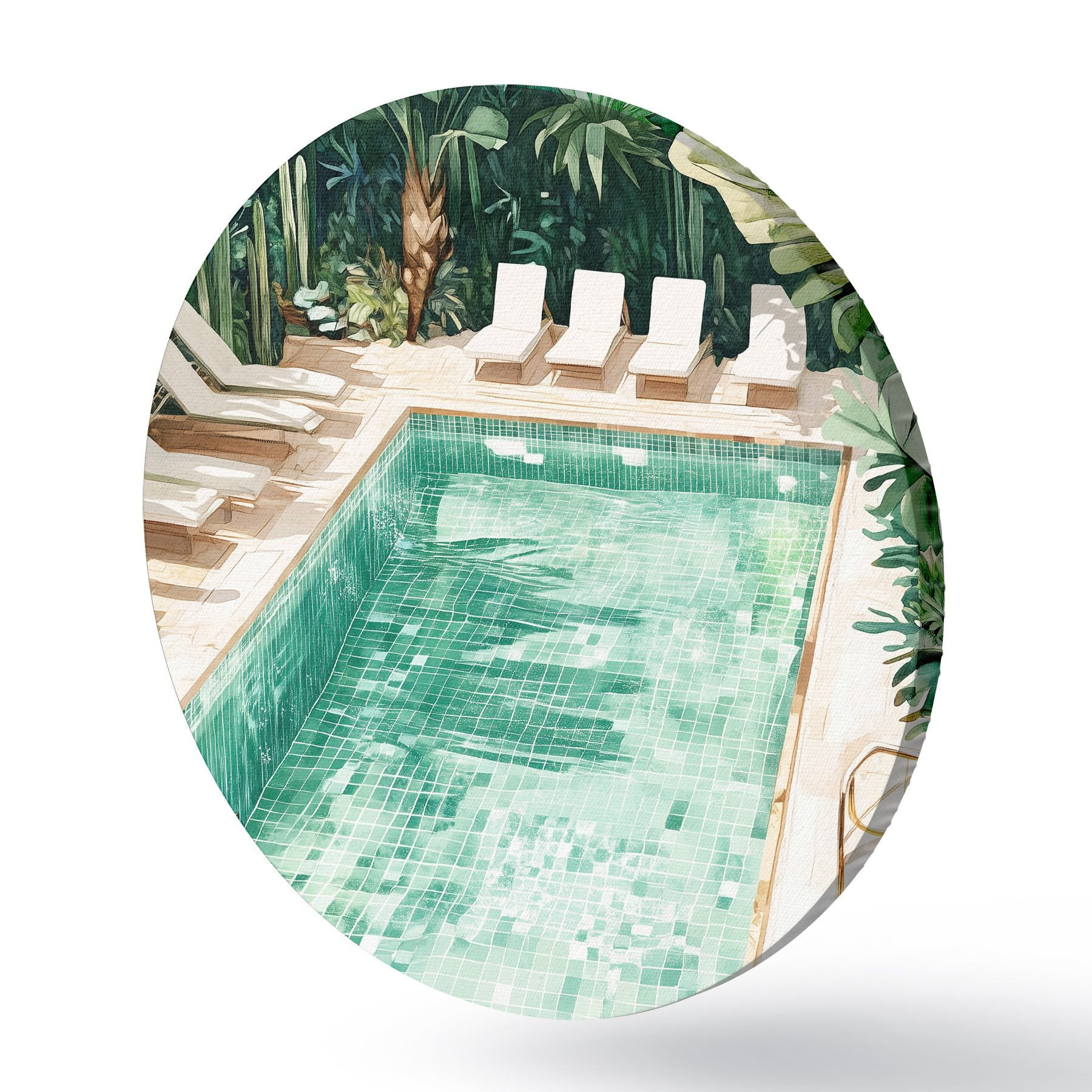 Ronde schilderijen Zomerzwembad in de groene tuin, vintage stijl, aquarel r43189