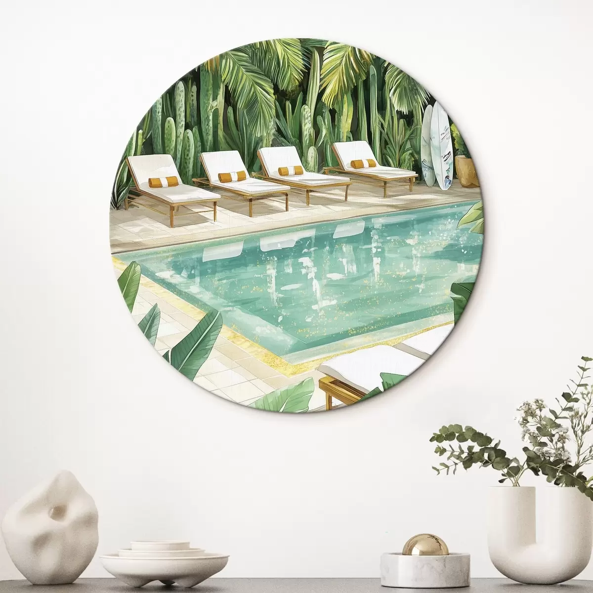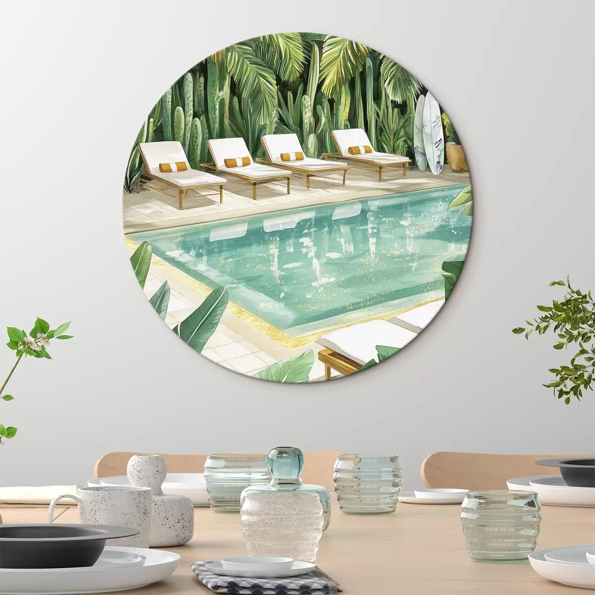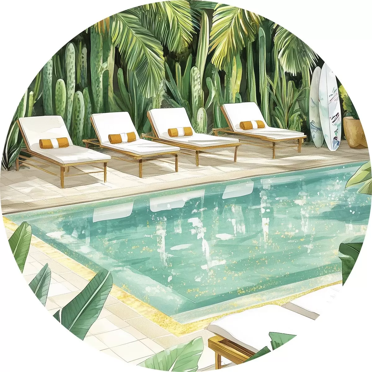 Ronde schilderijen Tropische natuur, tuin, zomerzwembad, surfen, aquarelstijl r43190