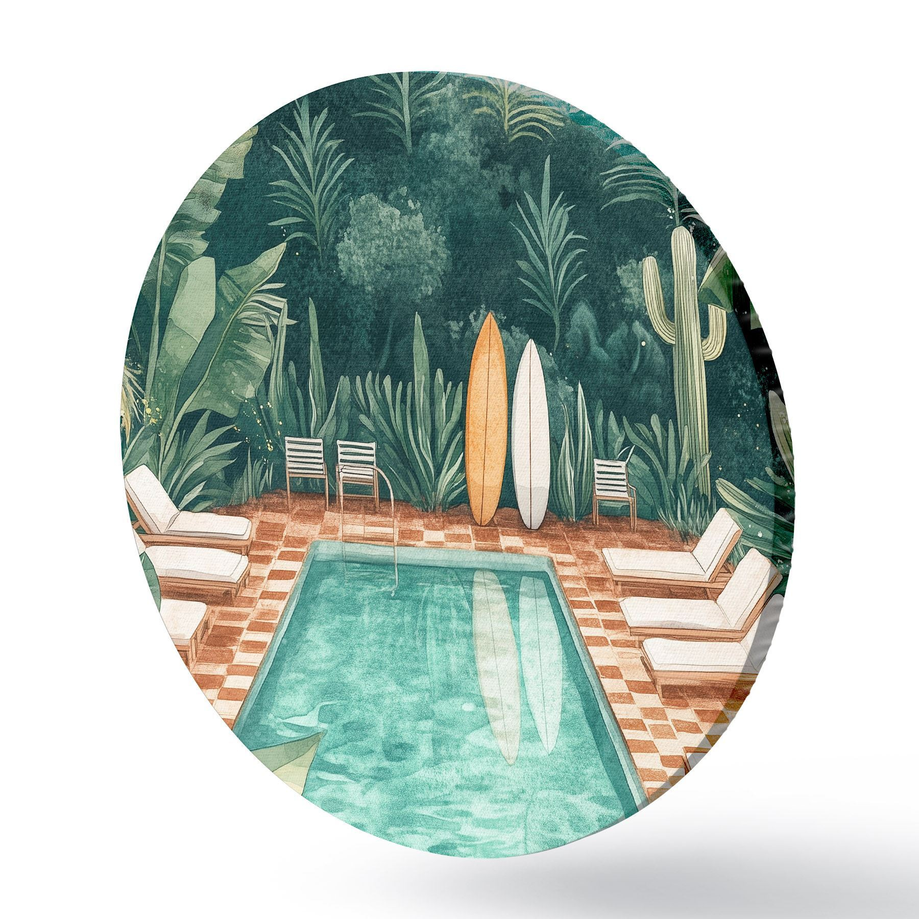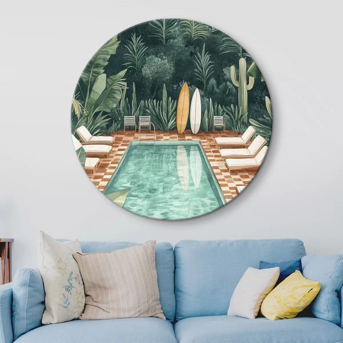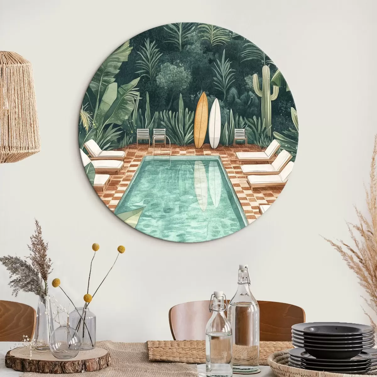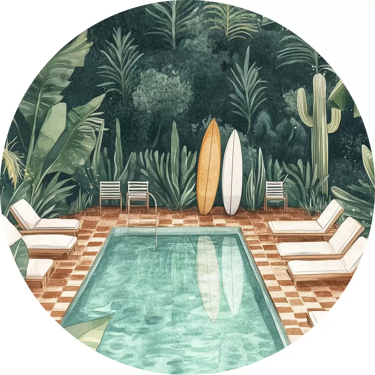 Ronde schilderijen Vintage zomerzwembad, tropisch bos, groen, palmbomen, aquarelstijl r43191