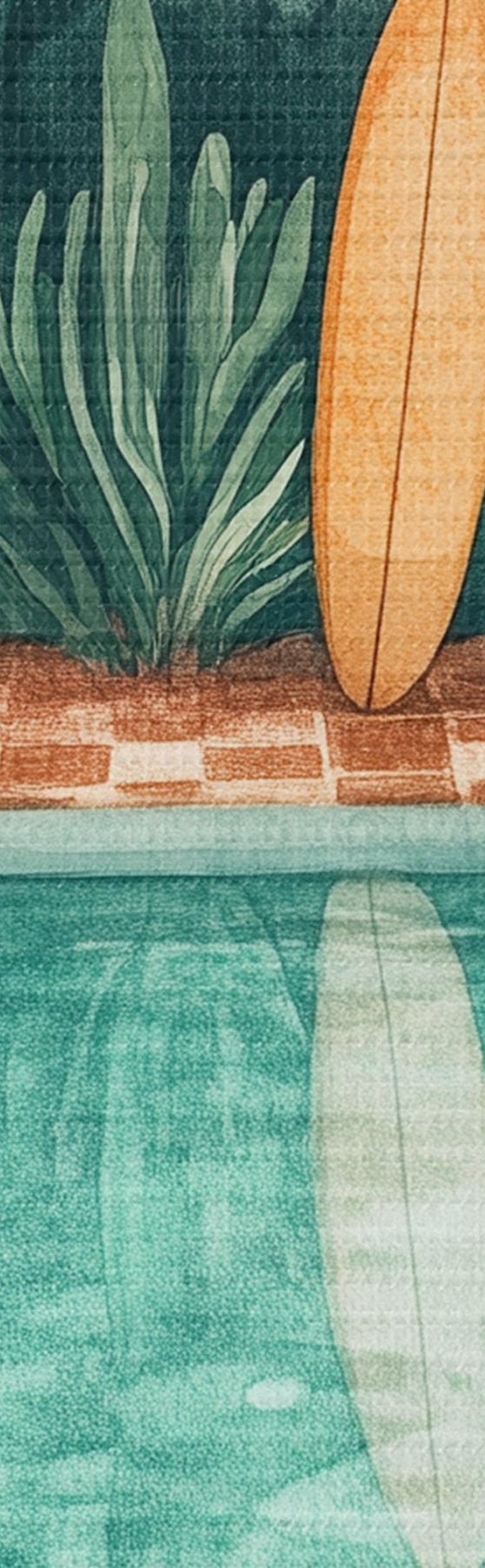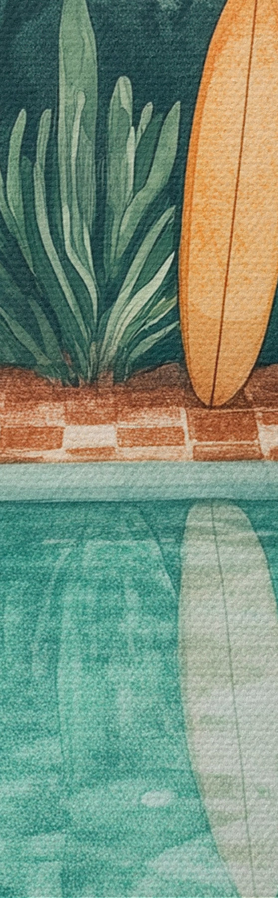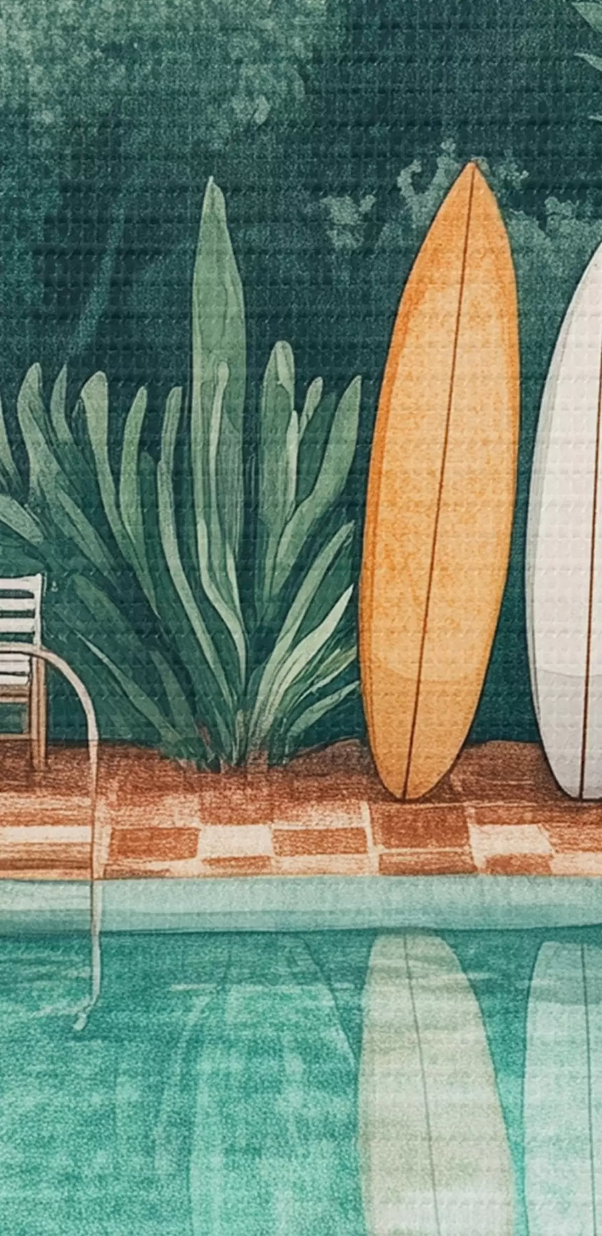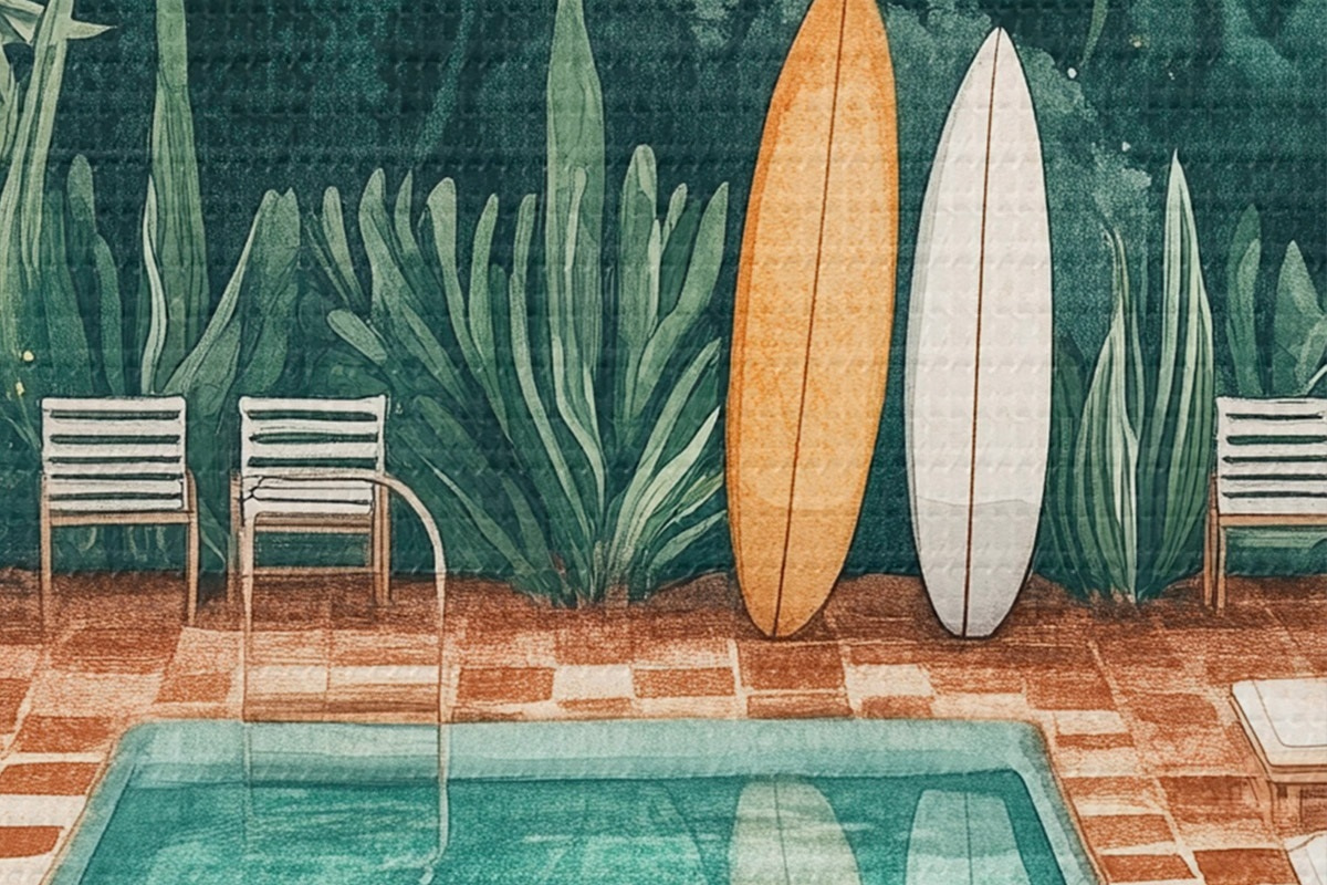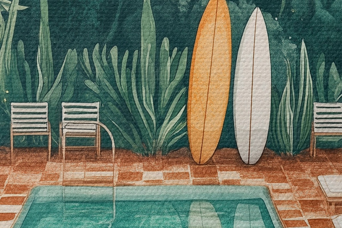 Afbeelding Vintage zomerzwembad, tropisch bos, groen, palmbomen, aquarelstijl Nr r43191