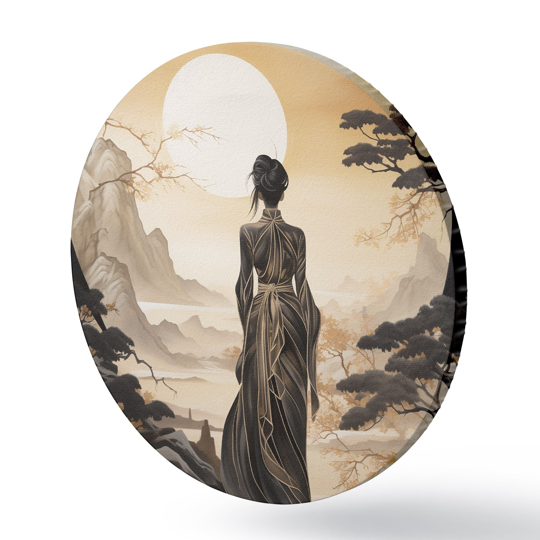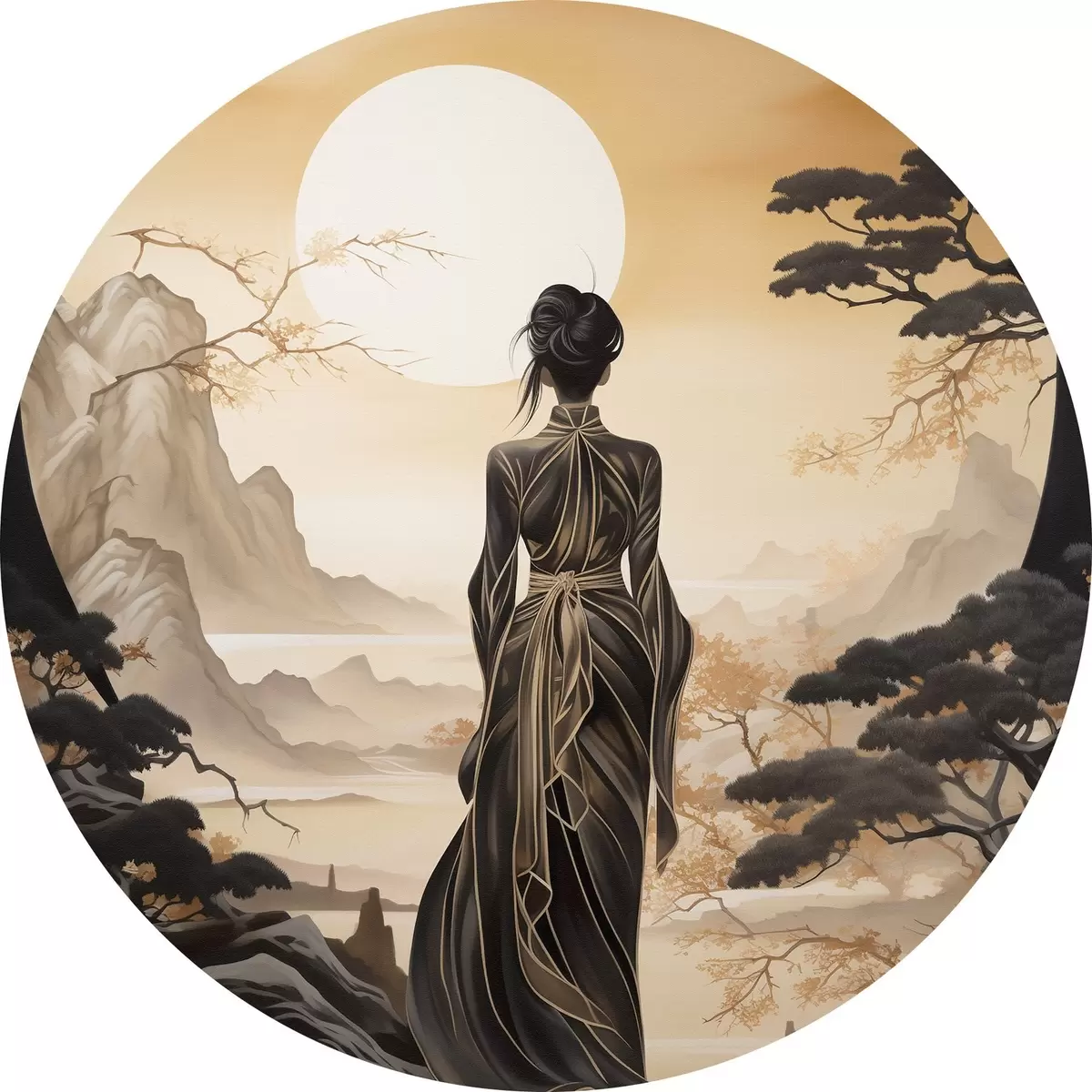 Ronde schilderijen Mensen, Japan, meisje bij zonsondergang tegen de achtergrond van sakura en bergen r43256