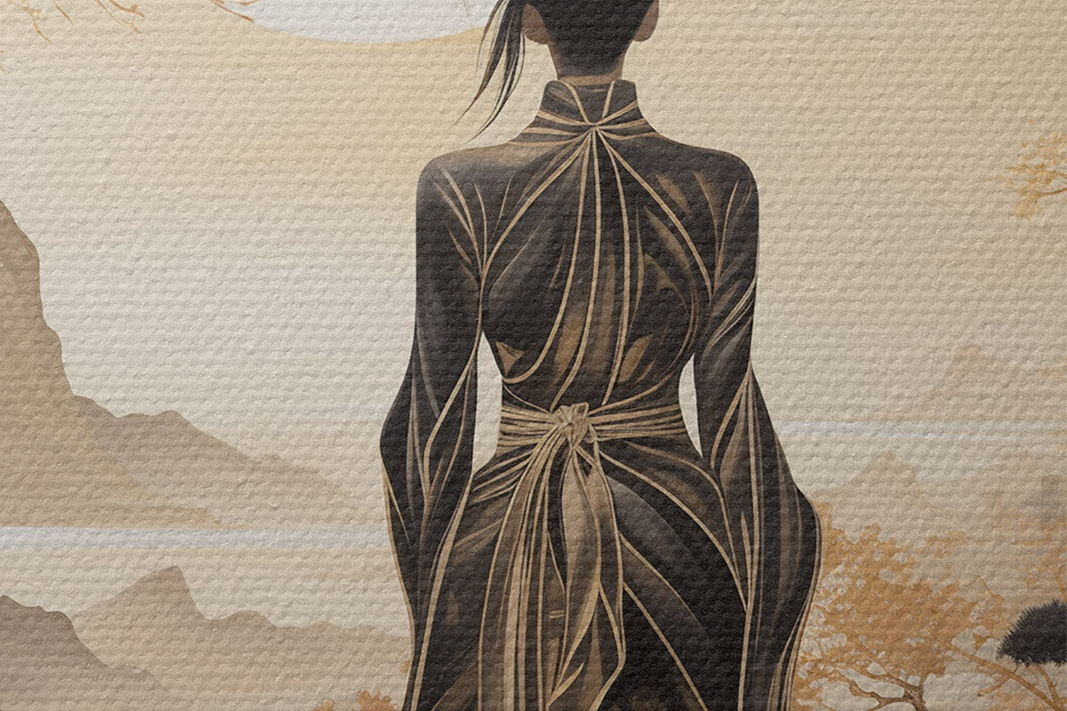 Afbeelding Mensen, Japan, meisje bij zonsondergang tegen de achtergrond van sakura en bergen Nr r43256