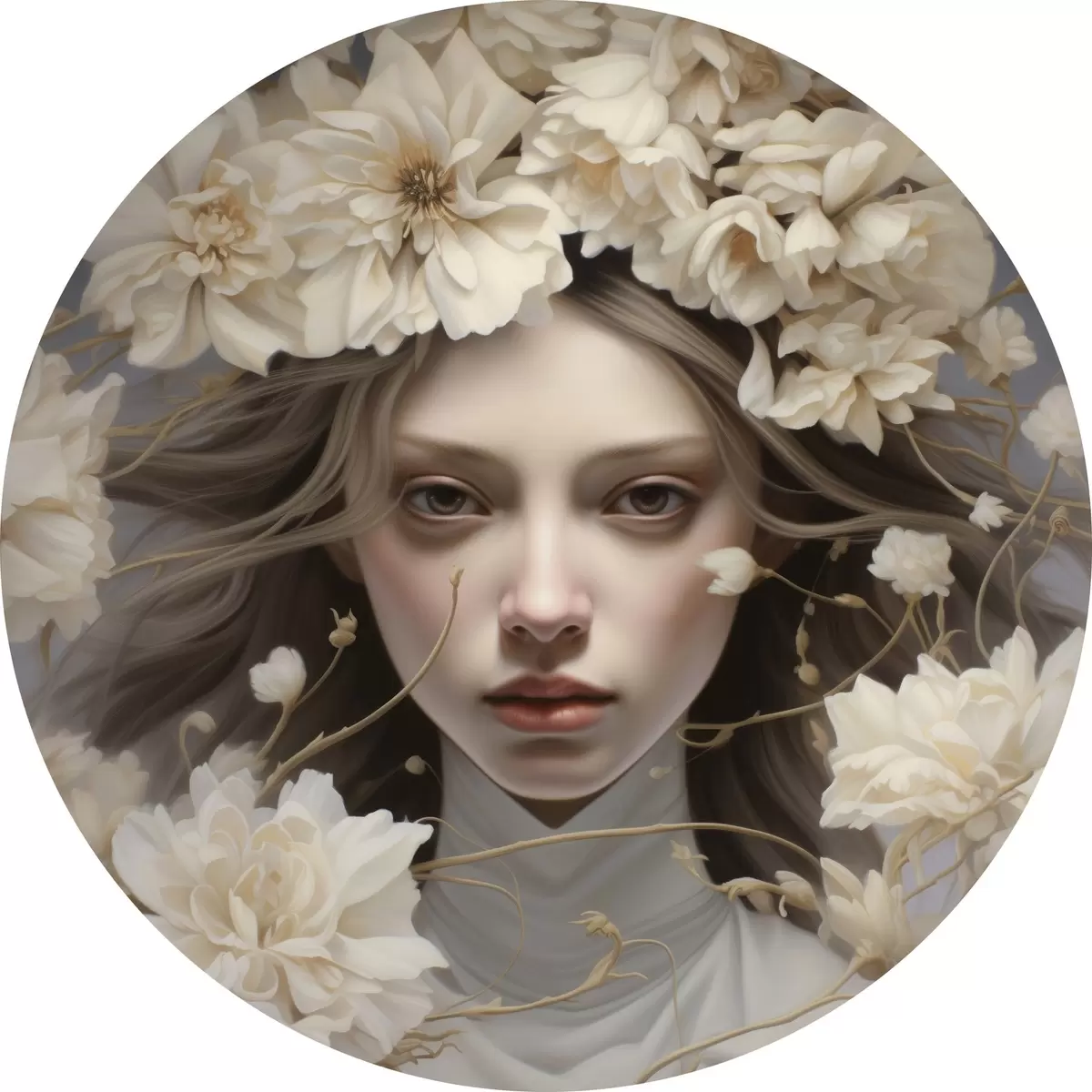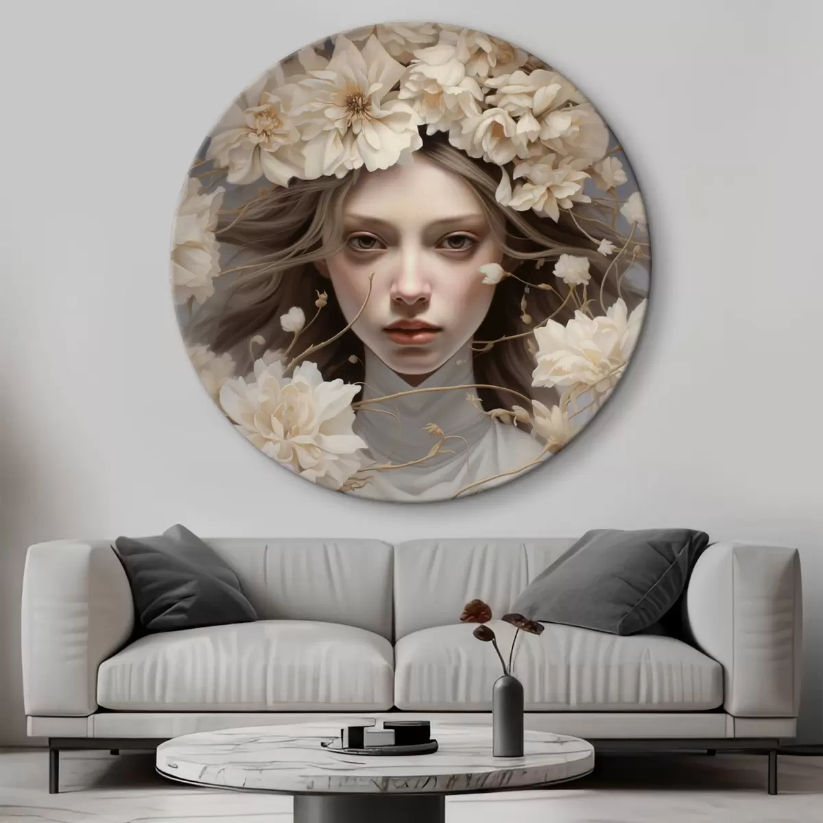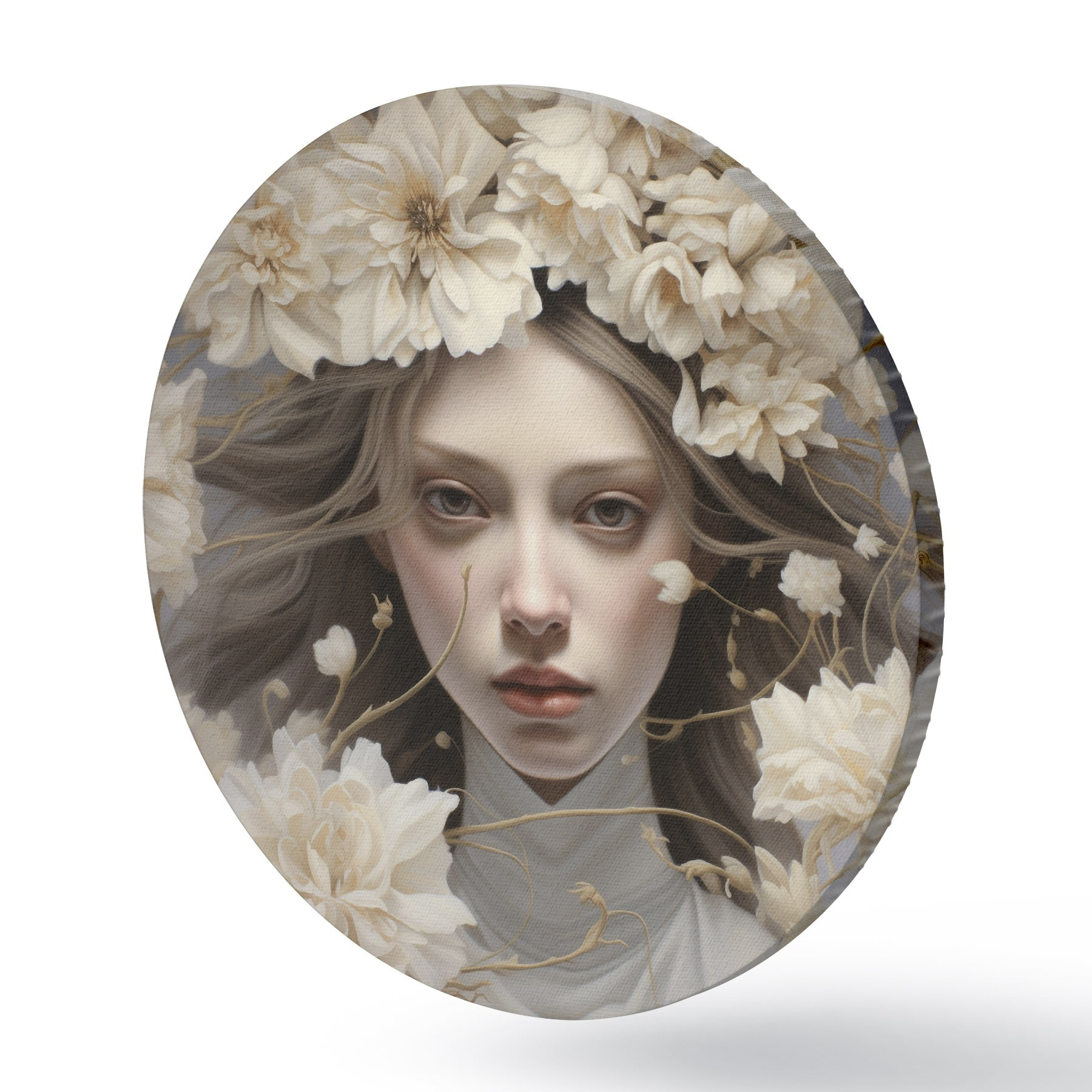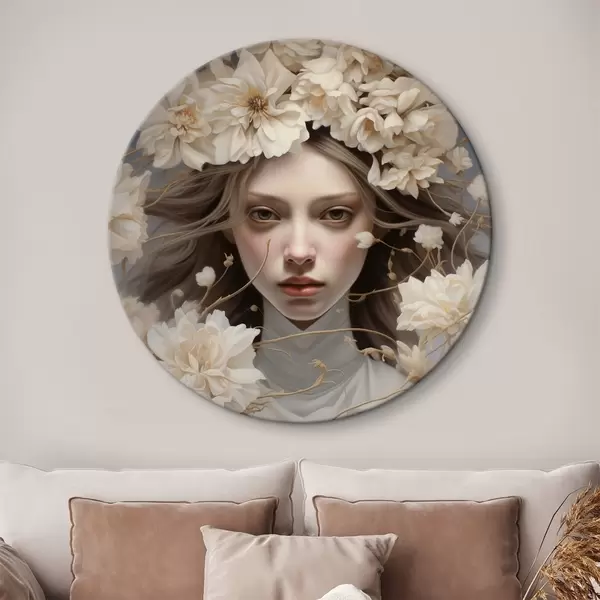 Ronde schilderijen Meisje in bloemen in rustige tinten r43367