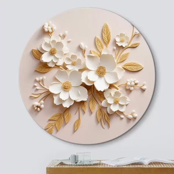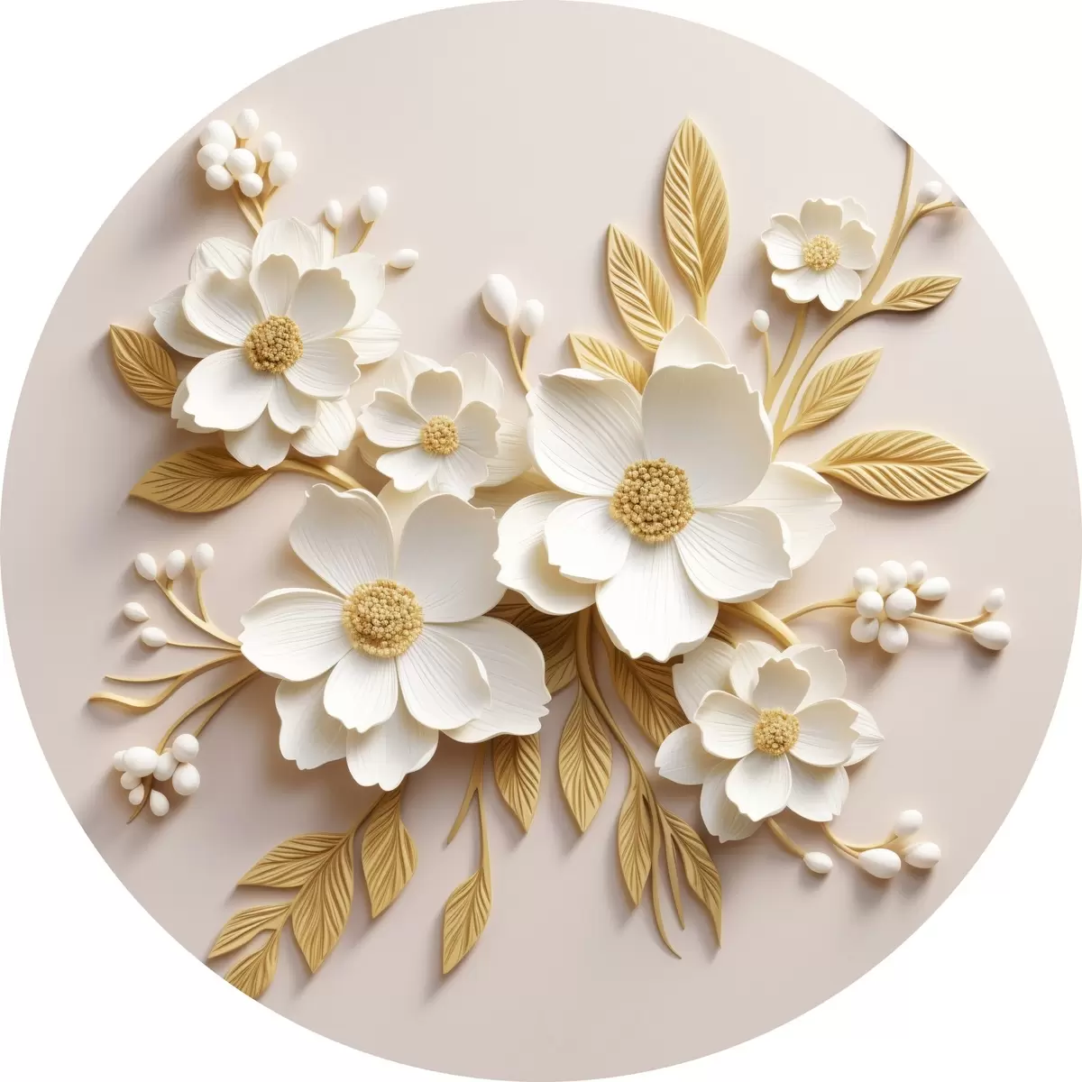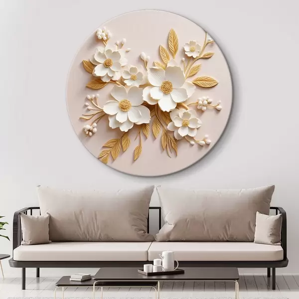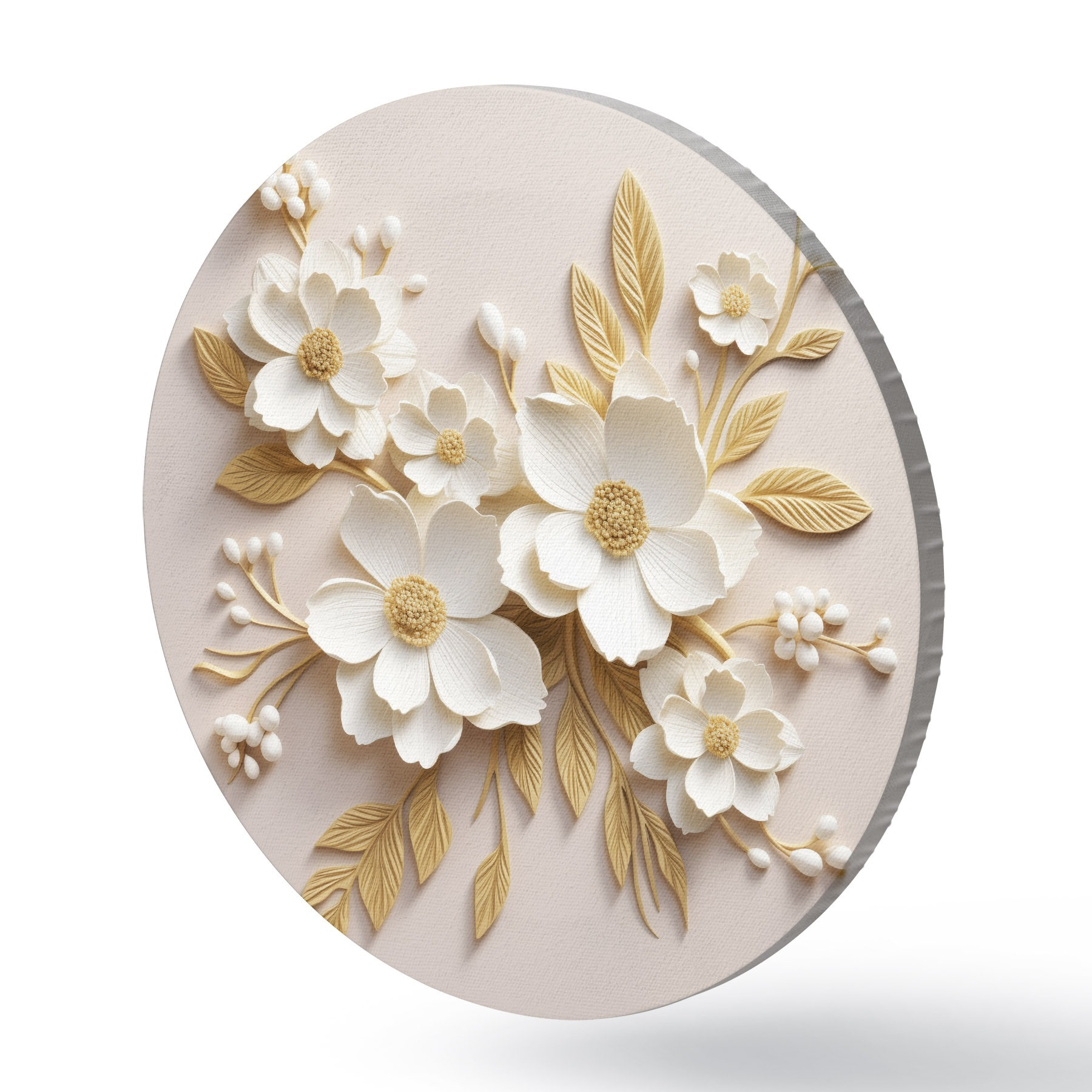 Ronde schilderijen 3D witte bloemen met bladeren op een crèmekleurige achtergrond r43383
