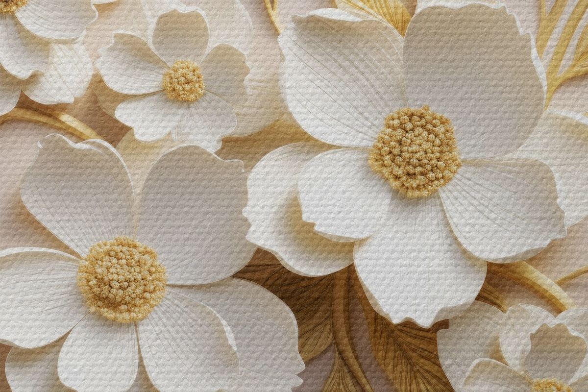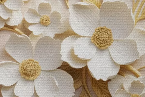 Afbeelding 3D witte bloemen met bladeren op een crèmekleurige achtergrond Nr r43383