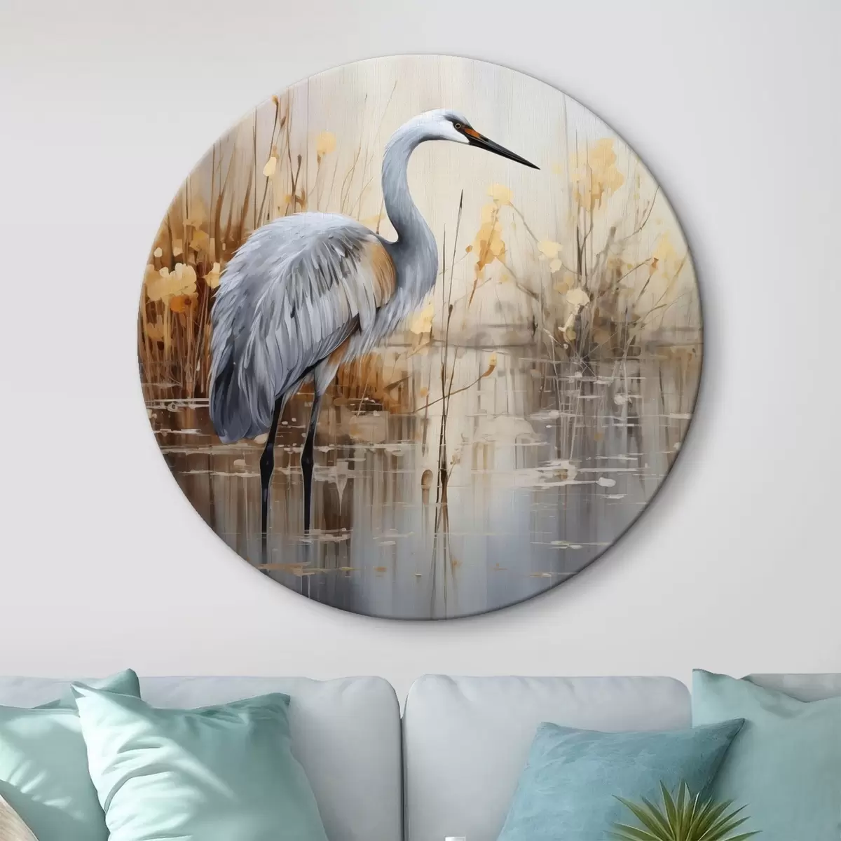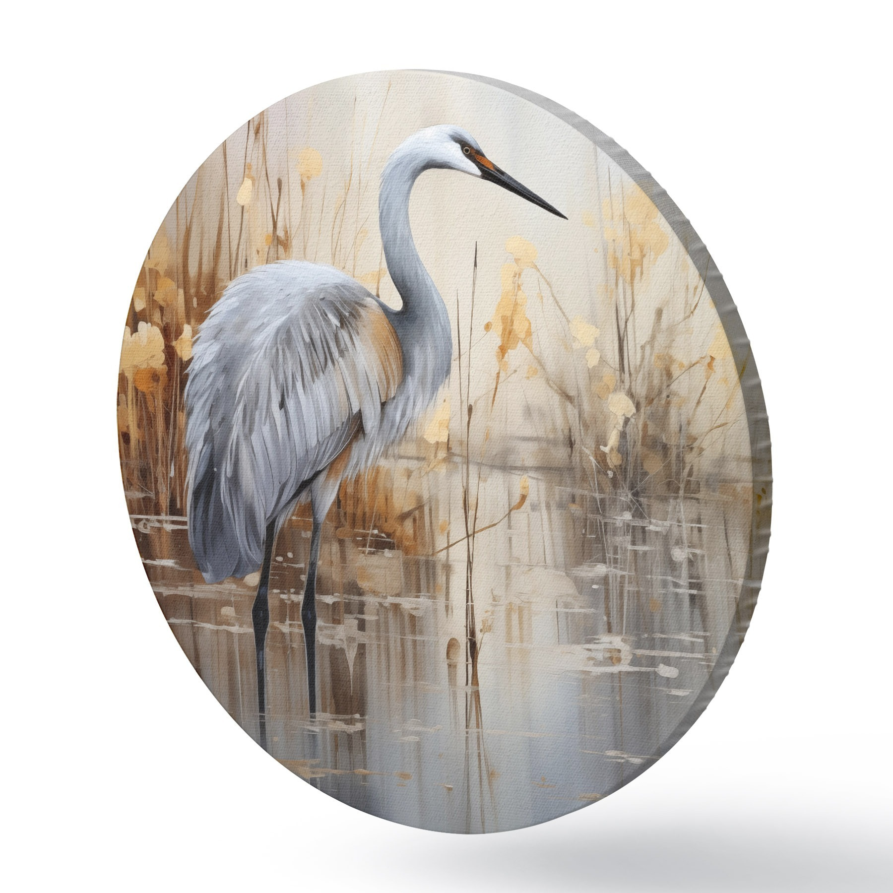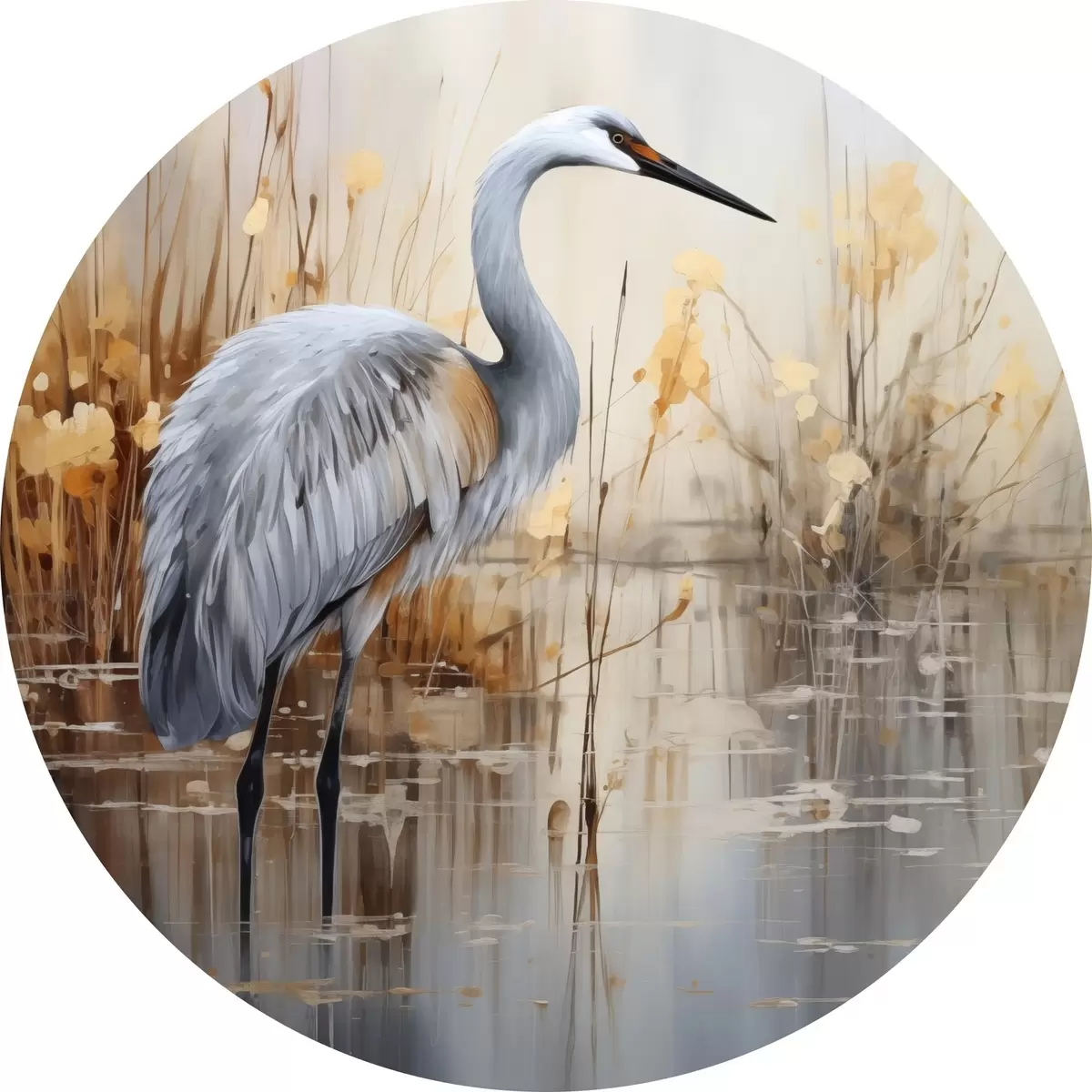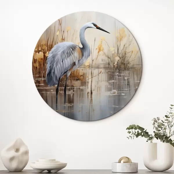 Ronde schilderijen Een grijze reiger in een vijver, omringd door hoge, dunne planten, de achtergrond is een zachte mix van beige en wit r43398