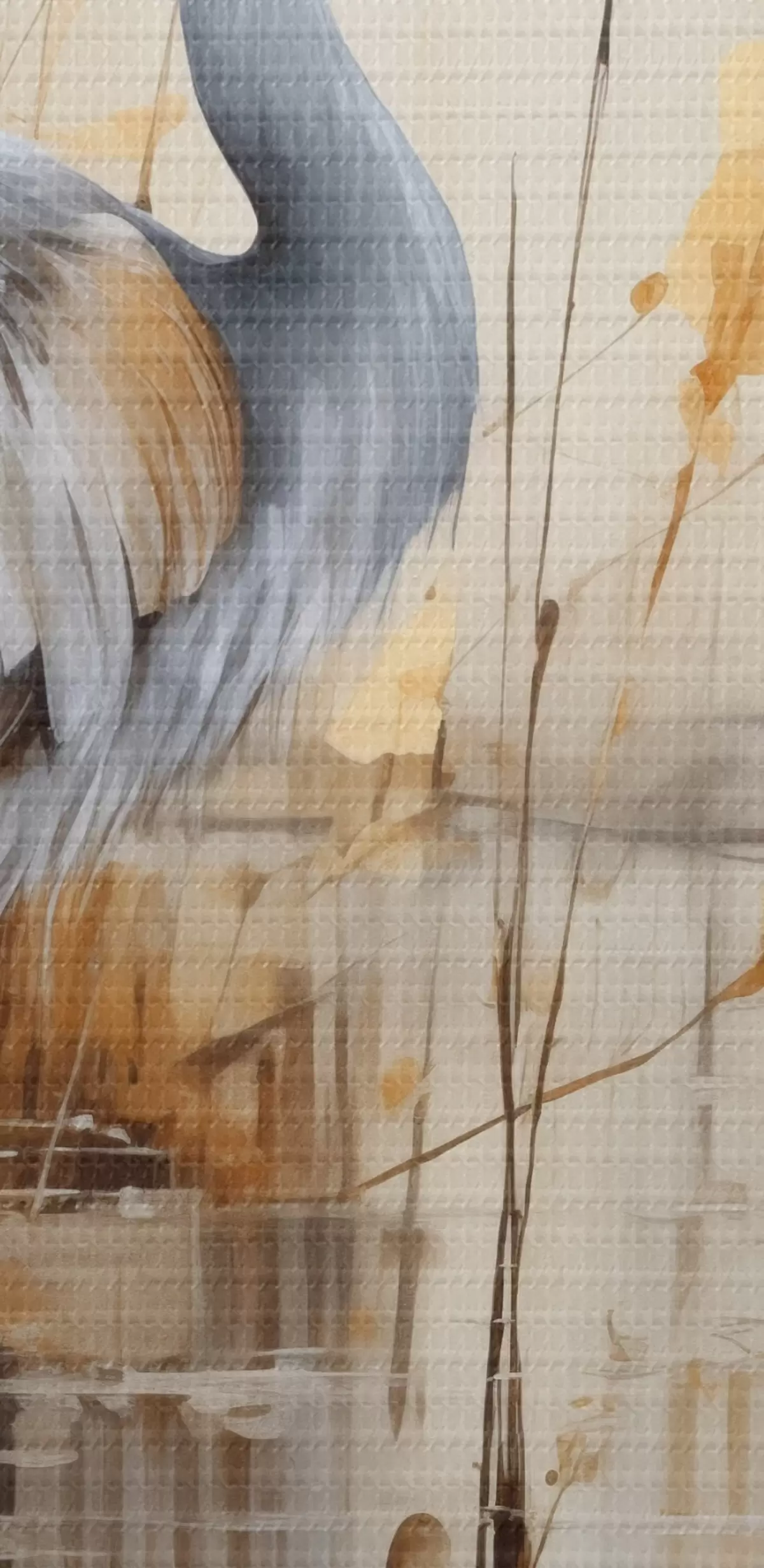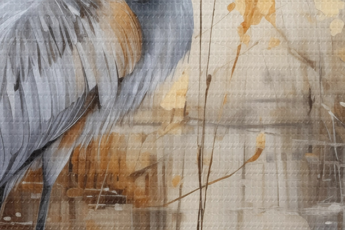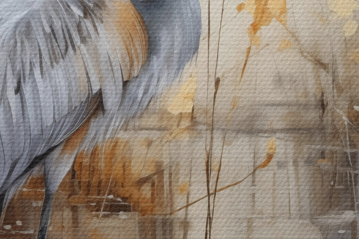 Afbeelding Een grijze reiger in een vijver, omringd door hoge, dunne planten, de achtergrond is een zachte mix van beige en wit Nr r43398