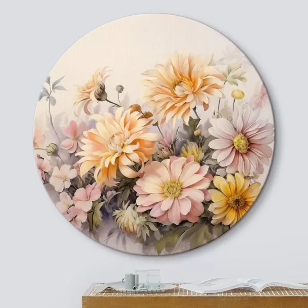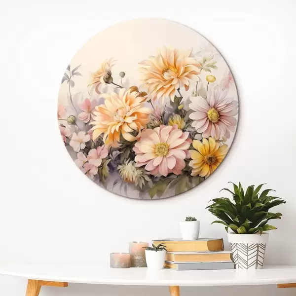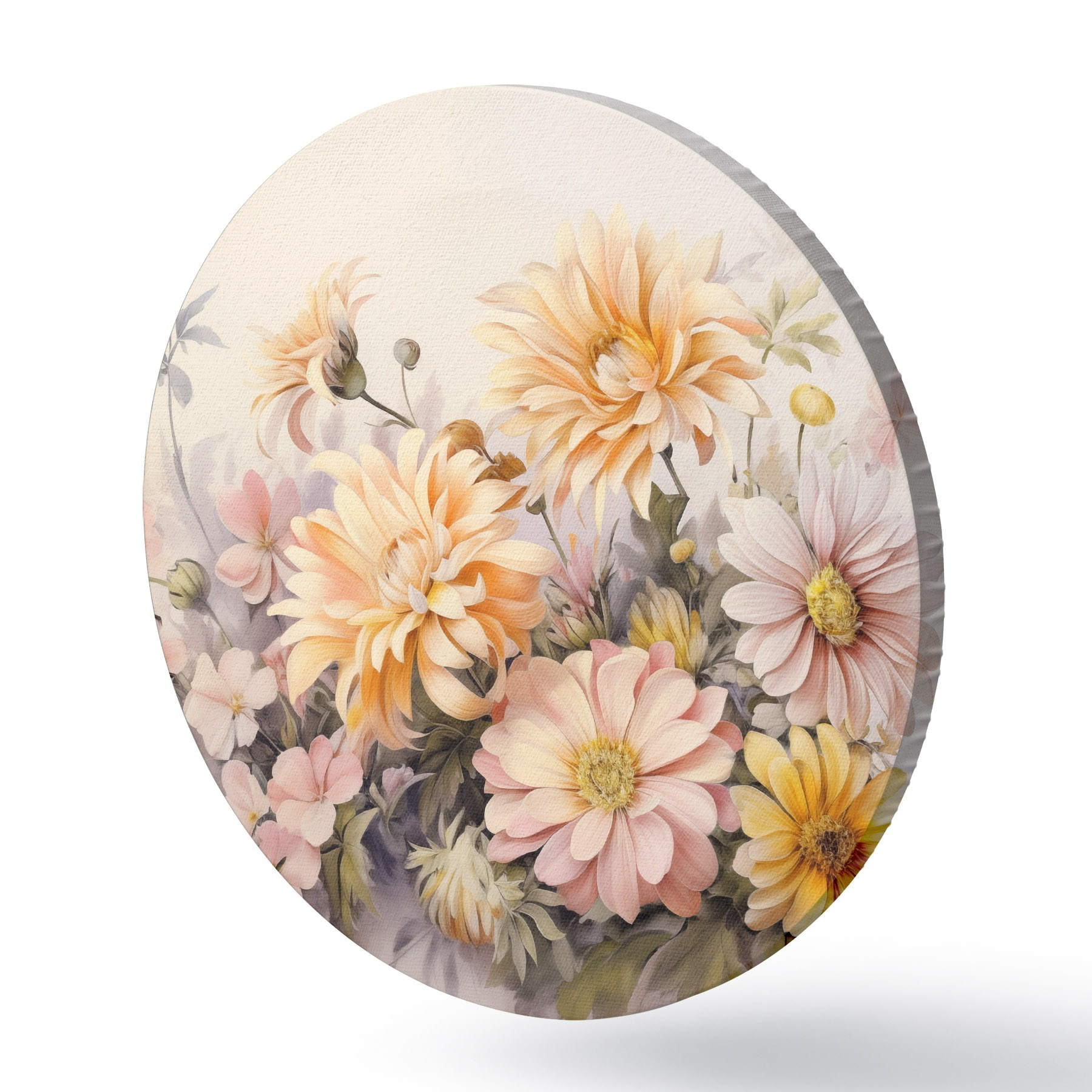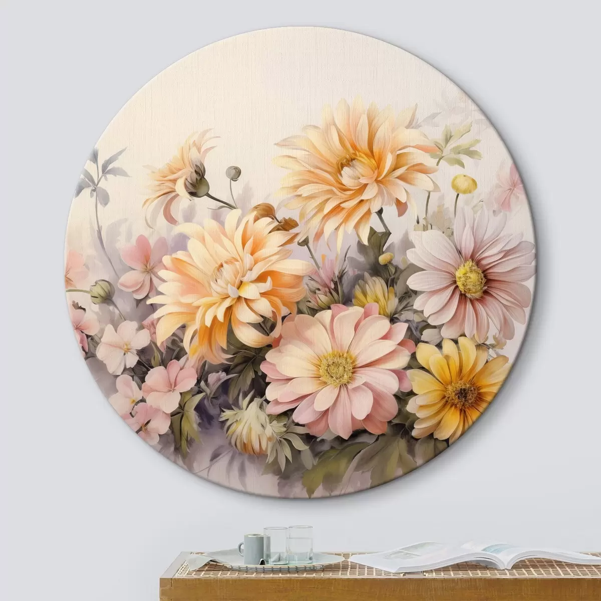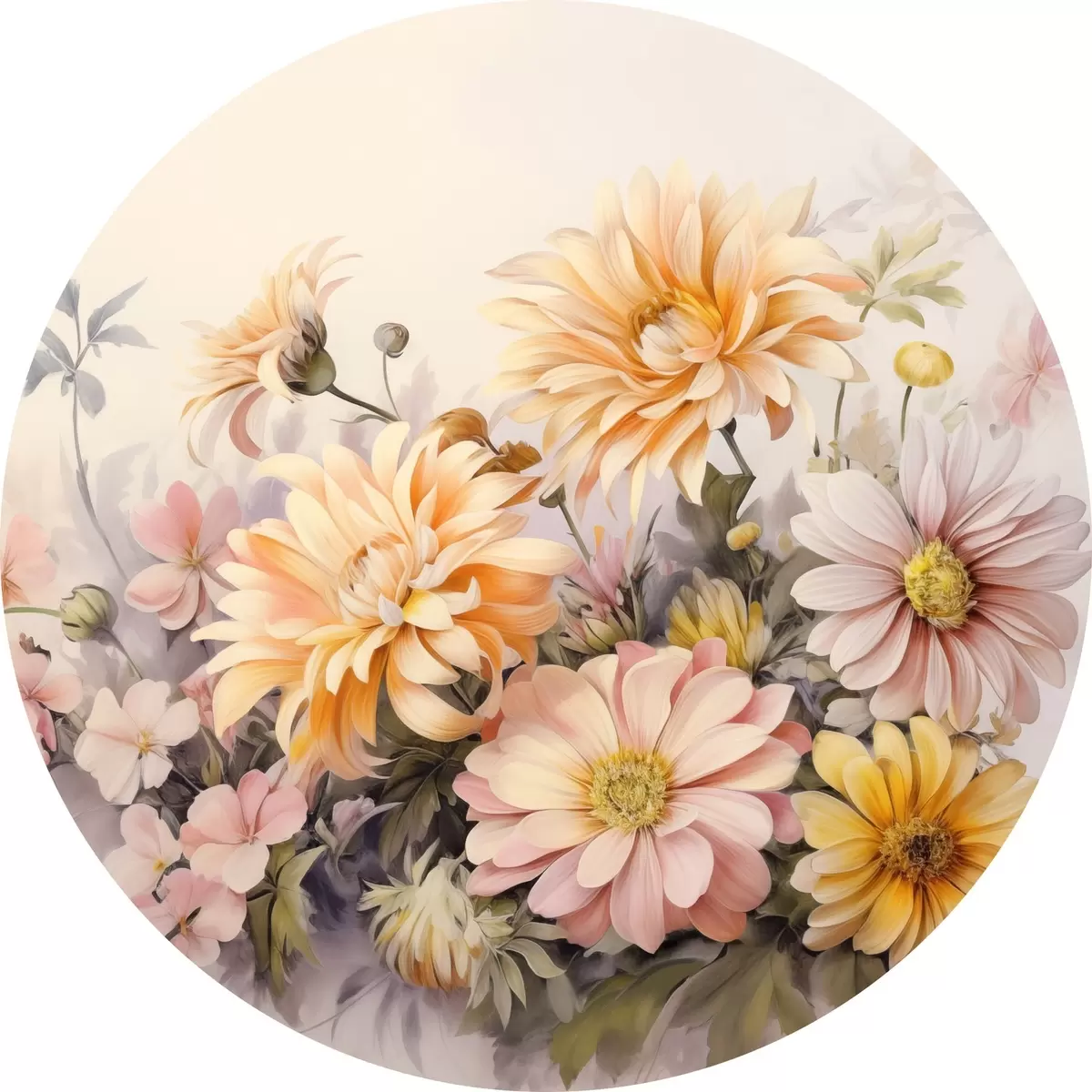 Ronde schilderijen Een verzameling roze, gele en oranje bloemen, lichte achtergrond, zachte kleuren, vintage stijl, botanische illustratie r43401
