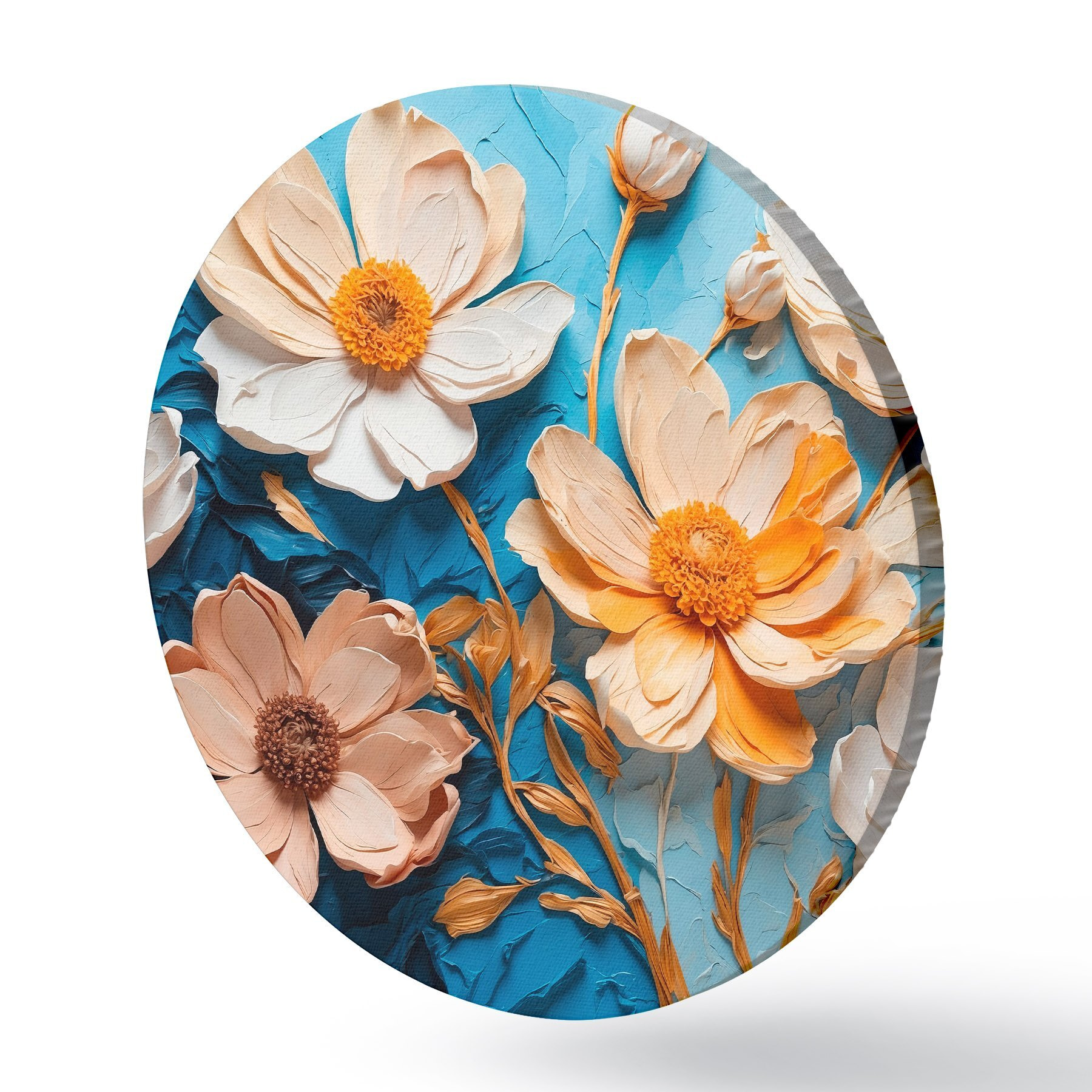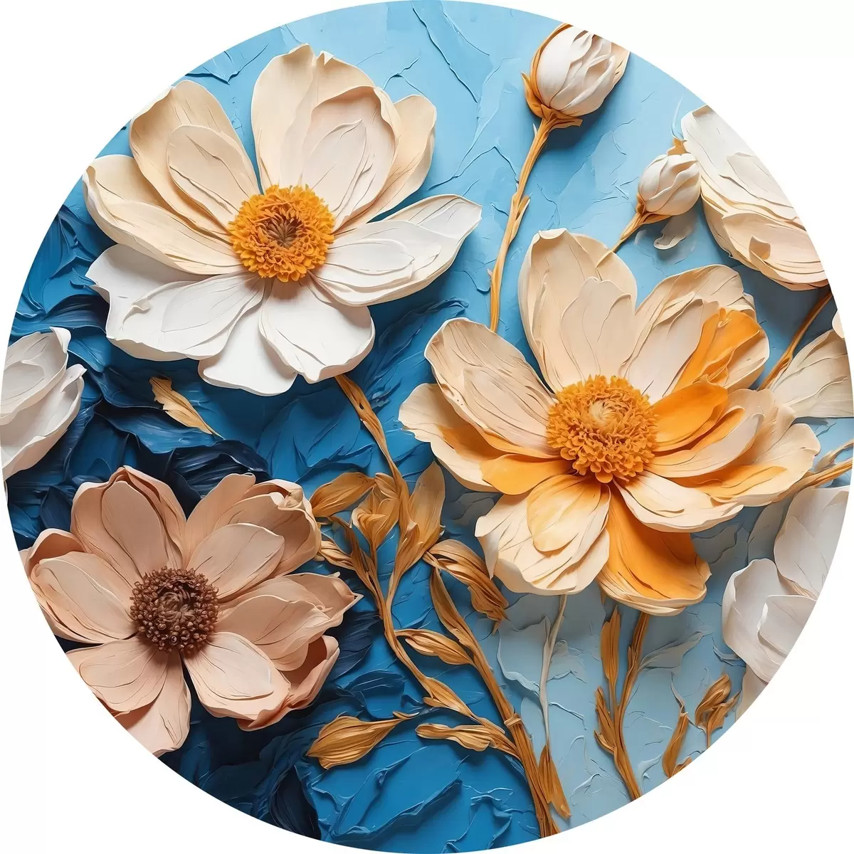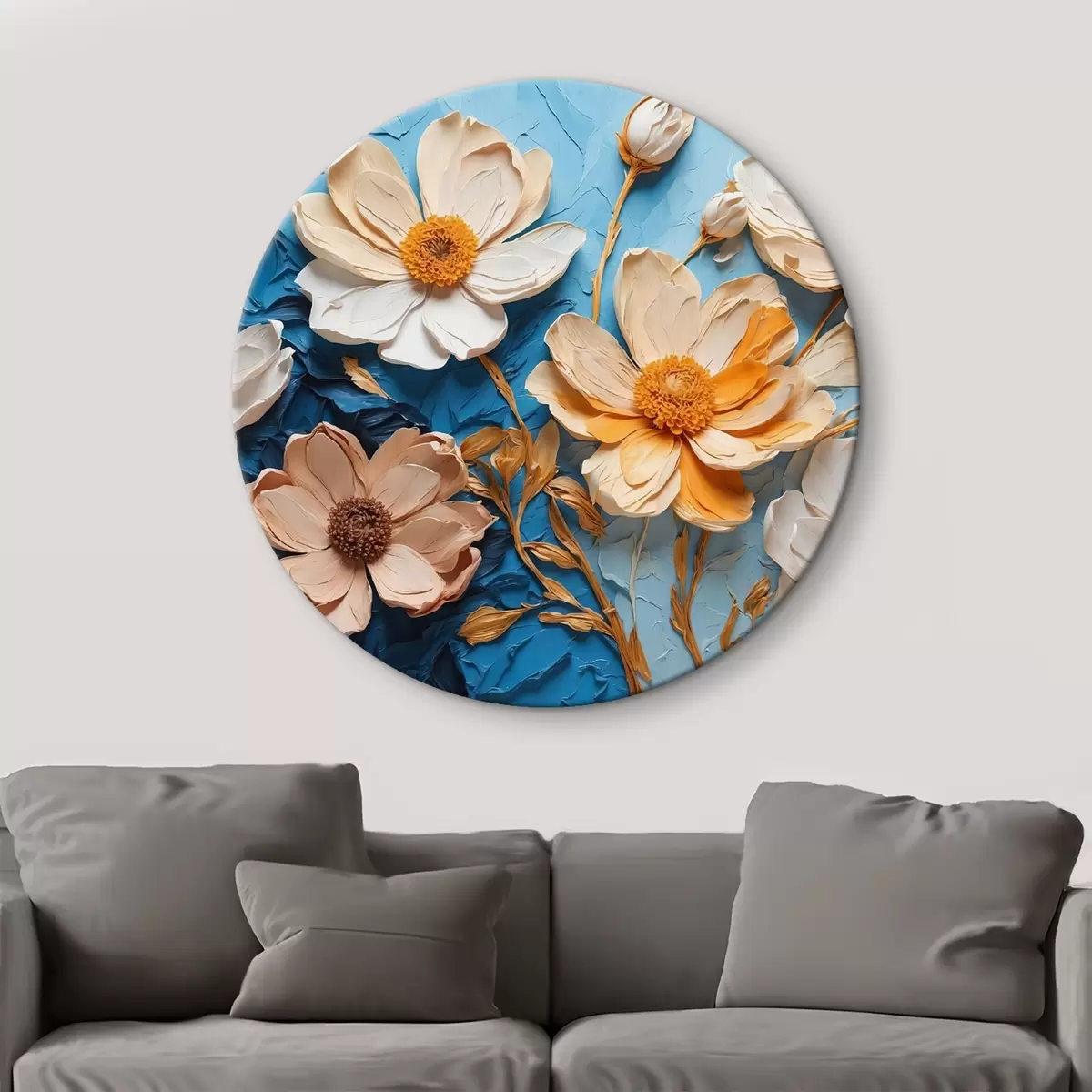 Ronde schilderijen Witte bloemen op blauwe achtergrond r43446