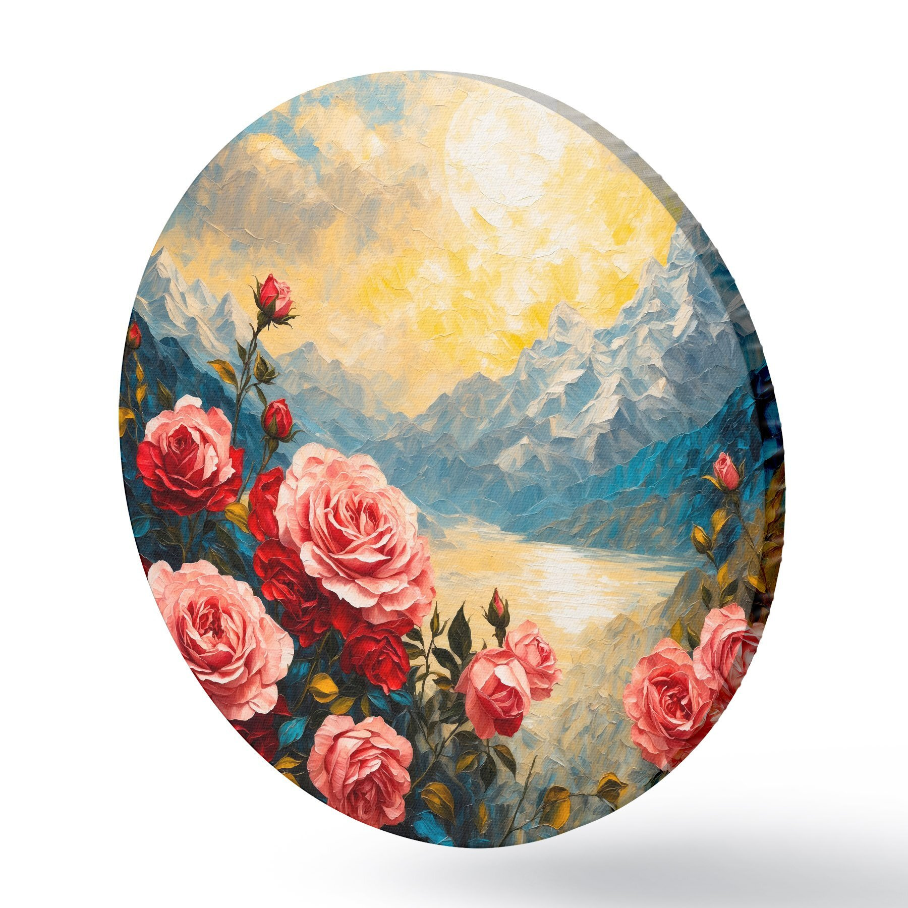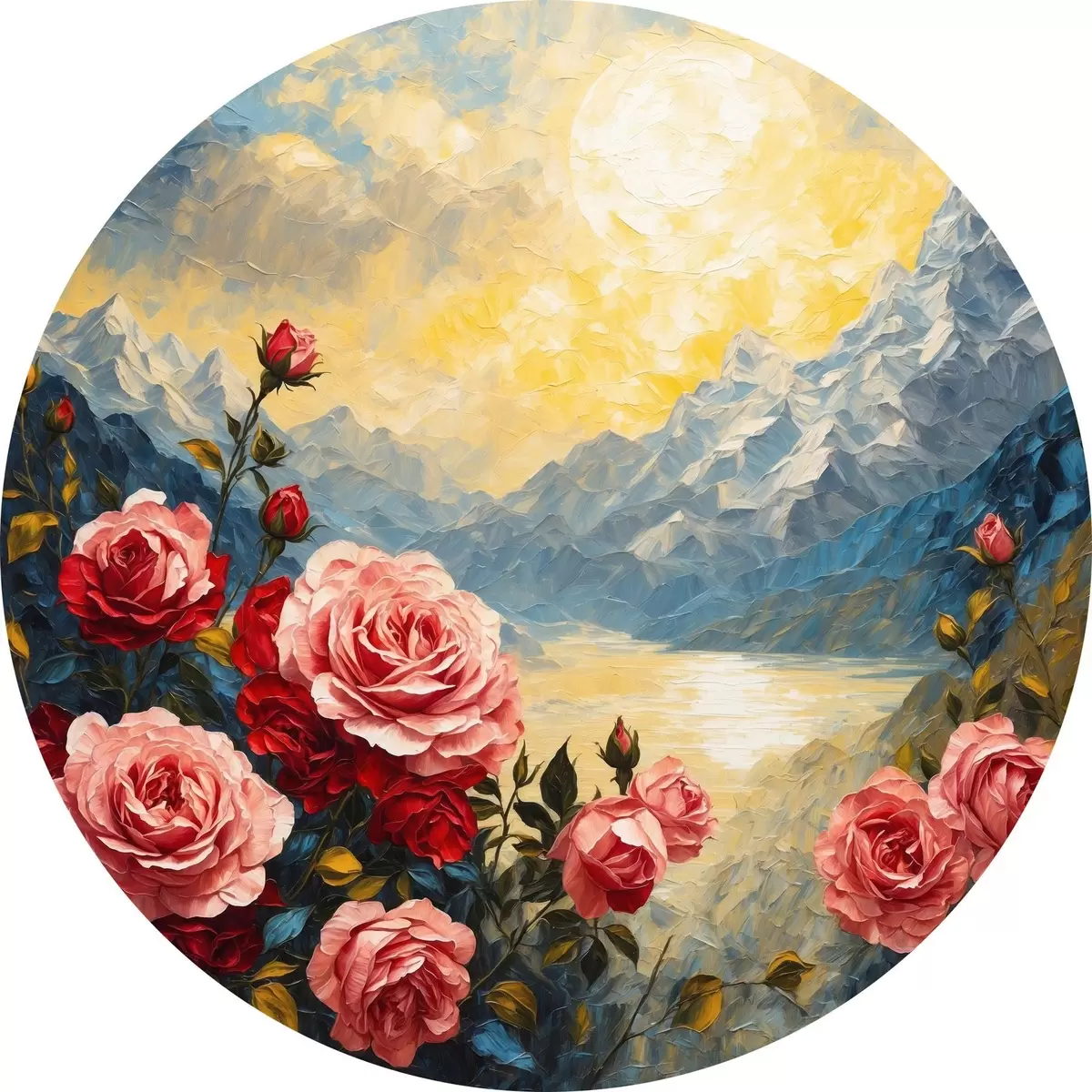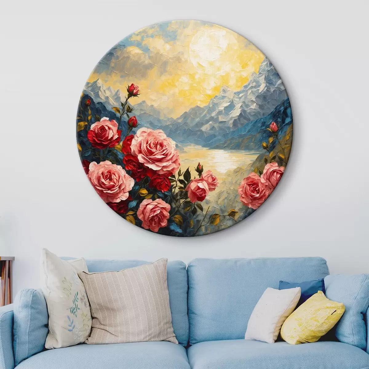 Ronde schilderijen Rozen op bergen achtergrond in olieverfschilderij stijl r43457