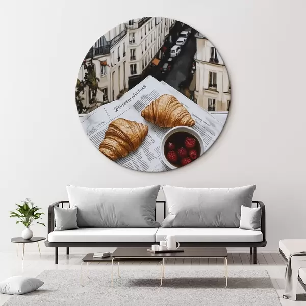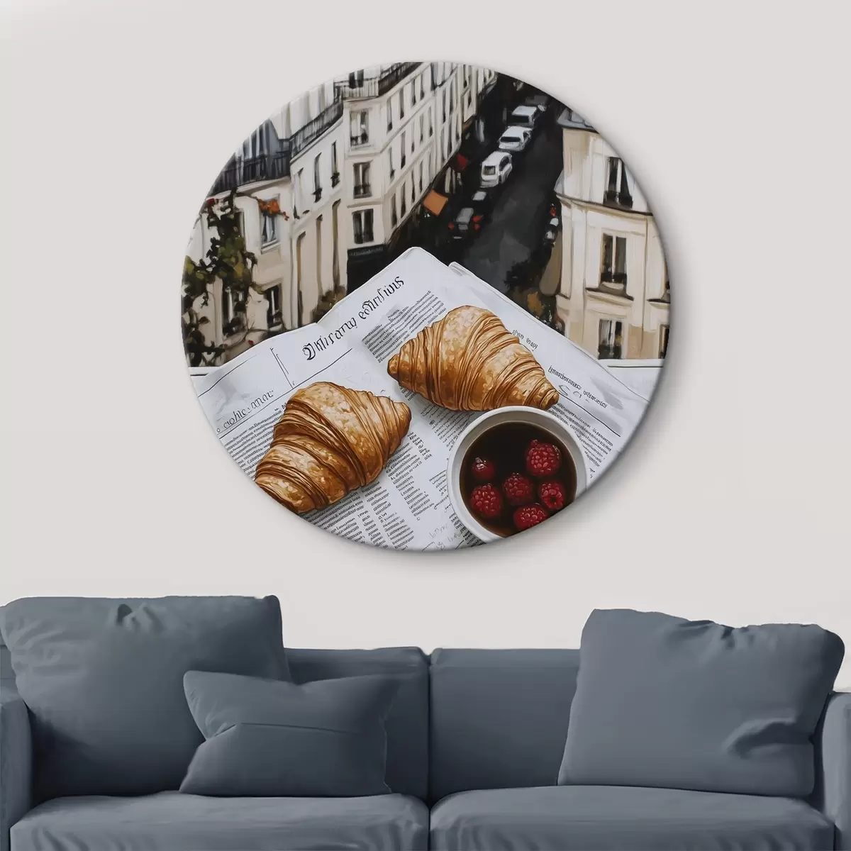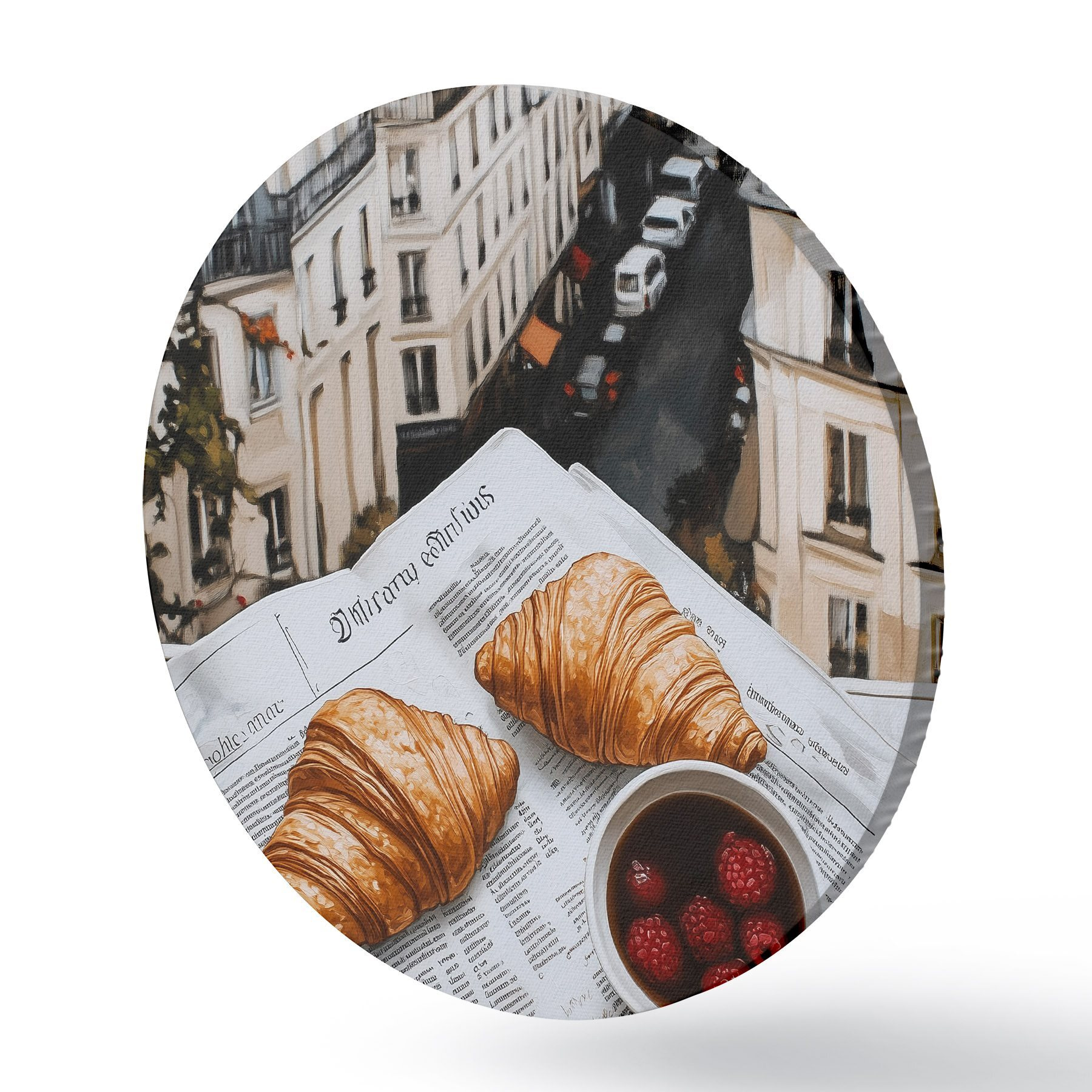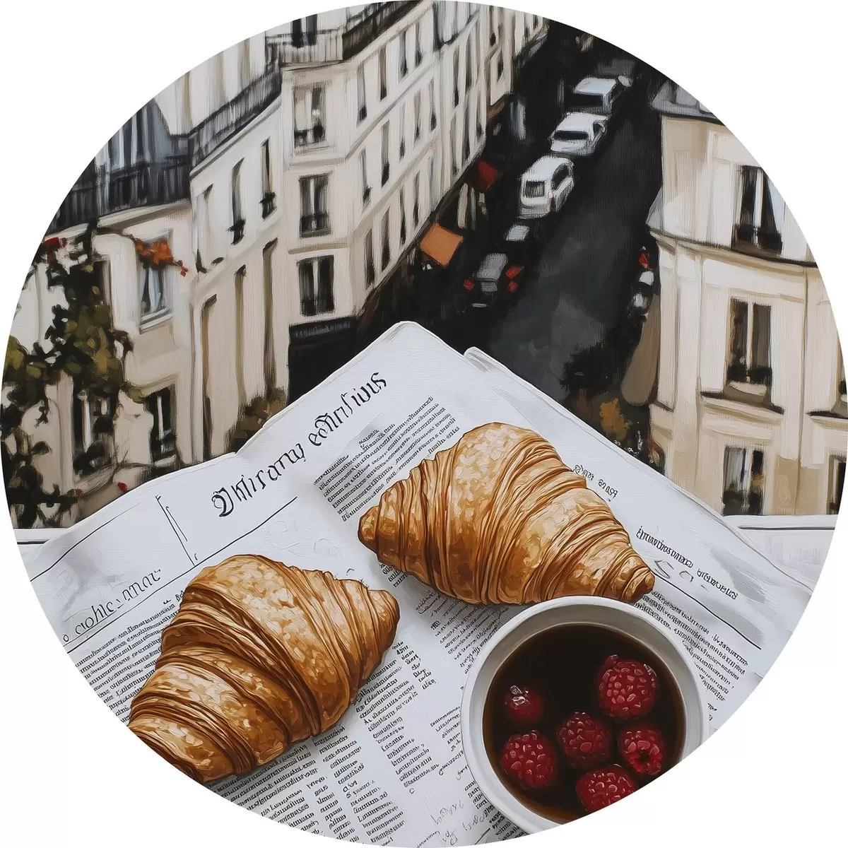 Ronde schilderijen Ochtendkoffie met croissants, stadsstraat, architectuur, olieverfstijl r43891