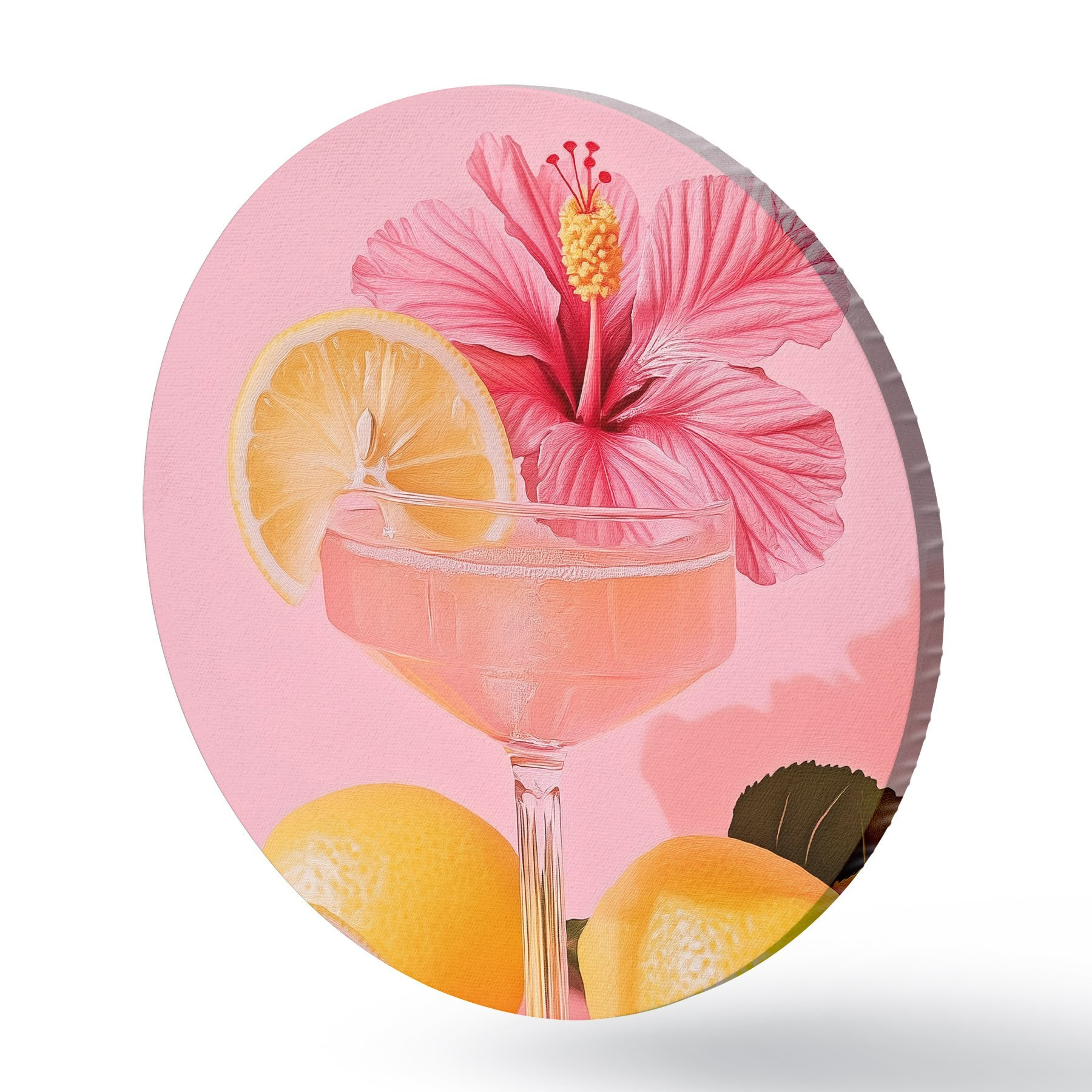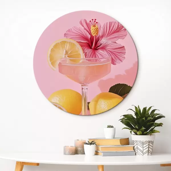 Ronde schilderijen Roze cocktail met hibiscusbloem, citroenen, realisme r43893
