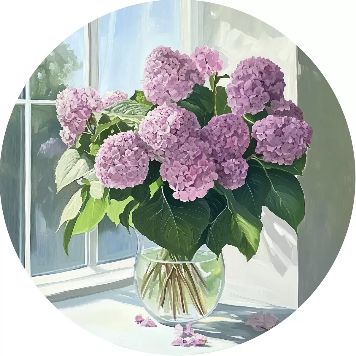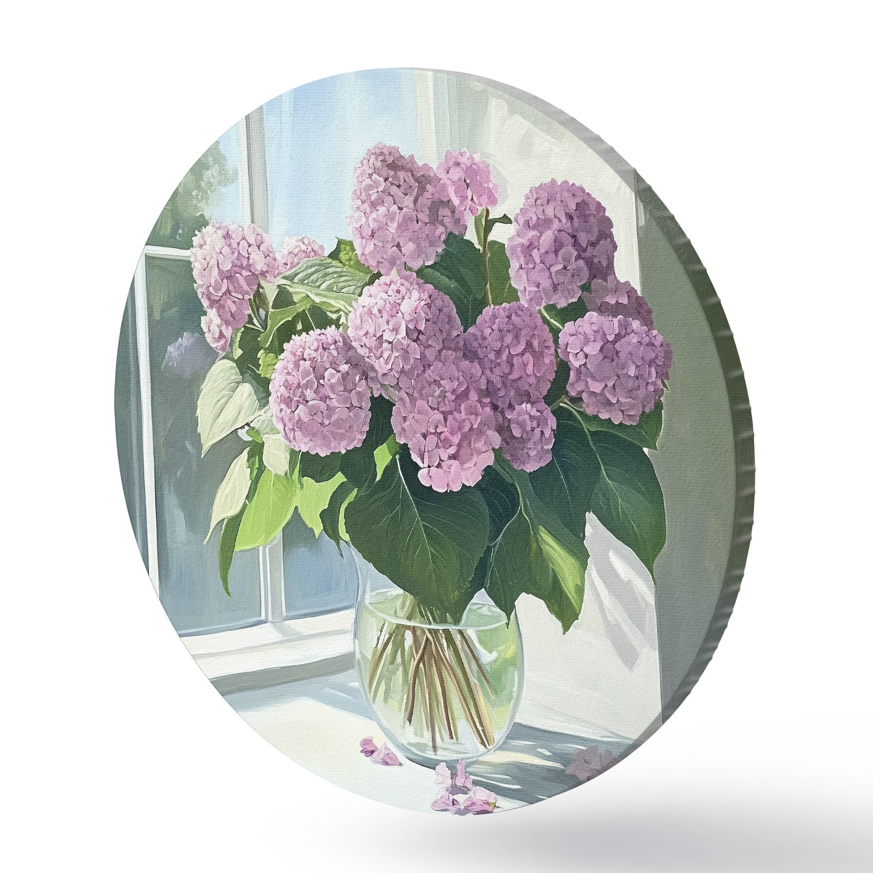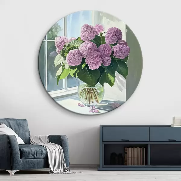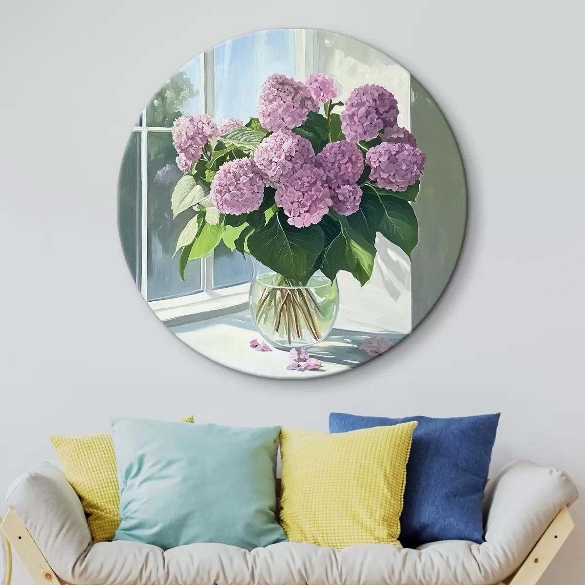 Ronde schilderijen Boeket paarse bloemen op het raam r43906