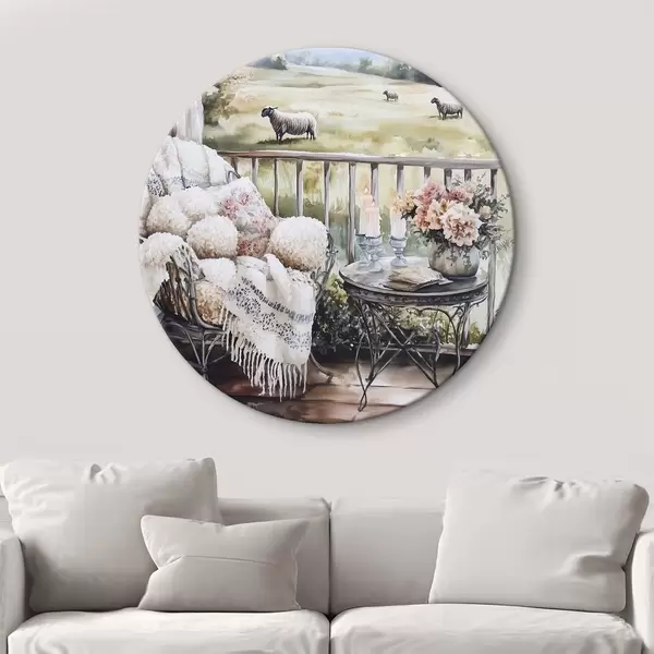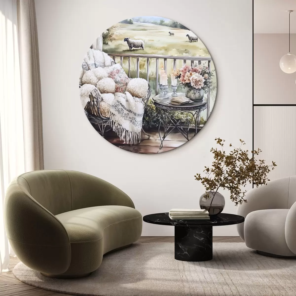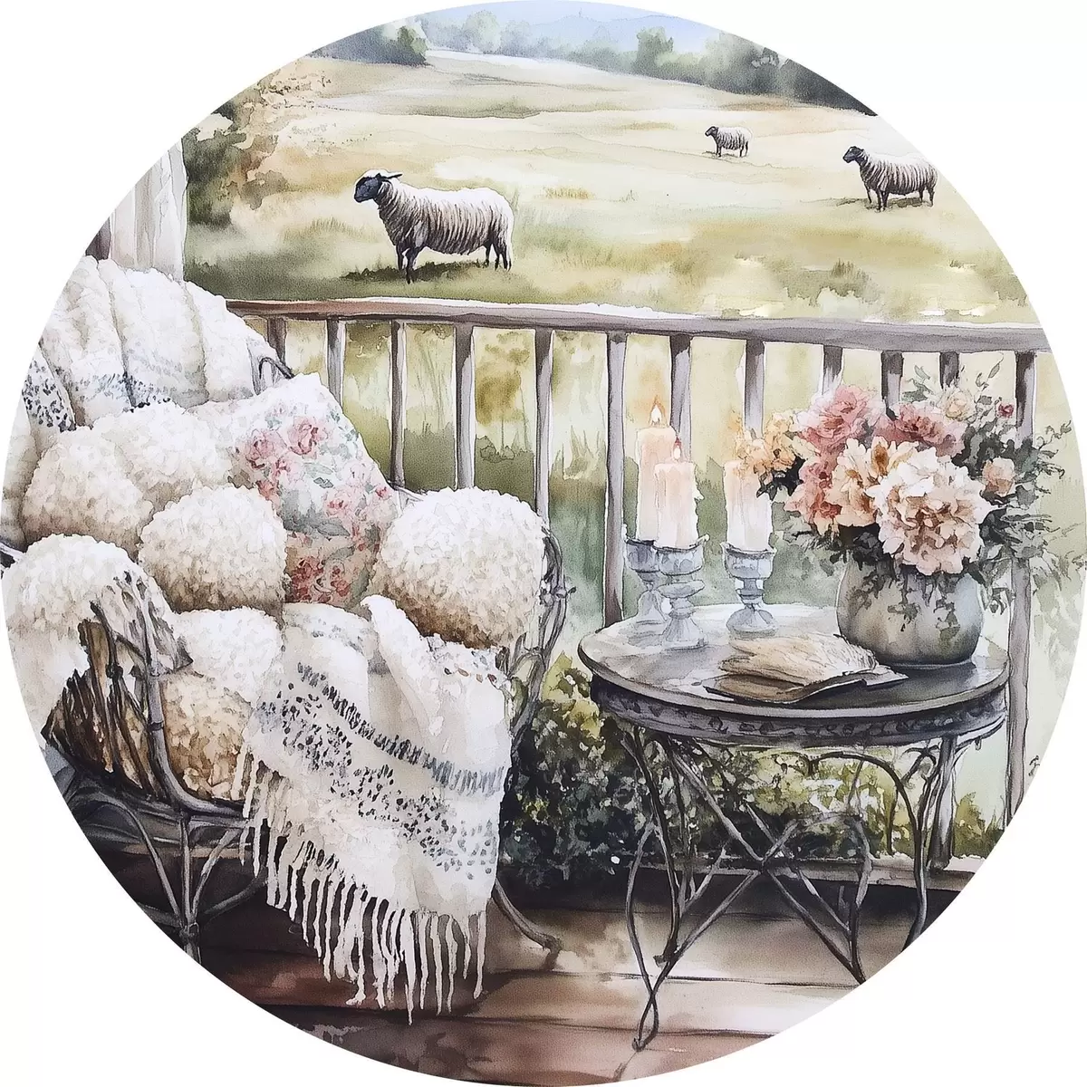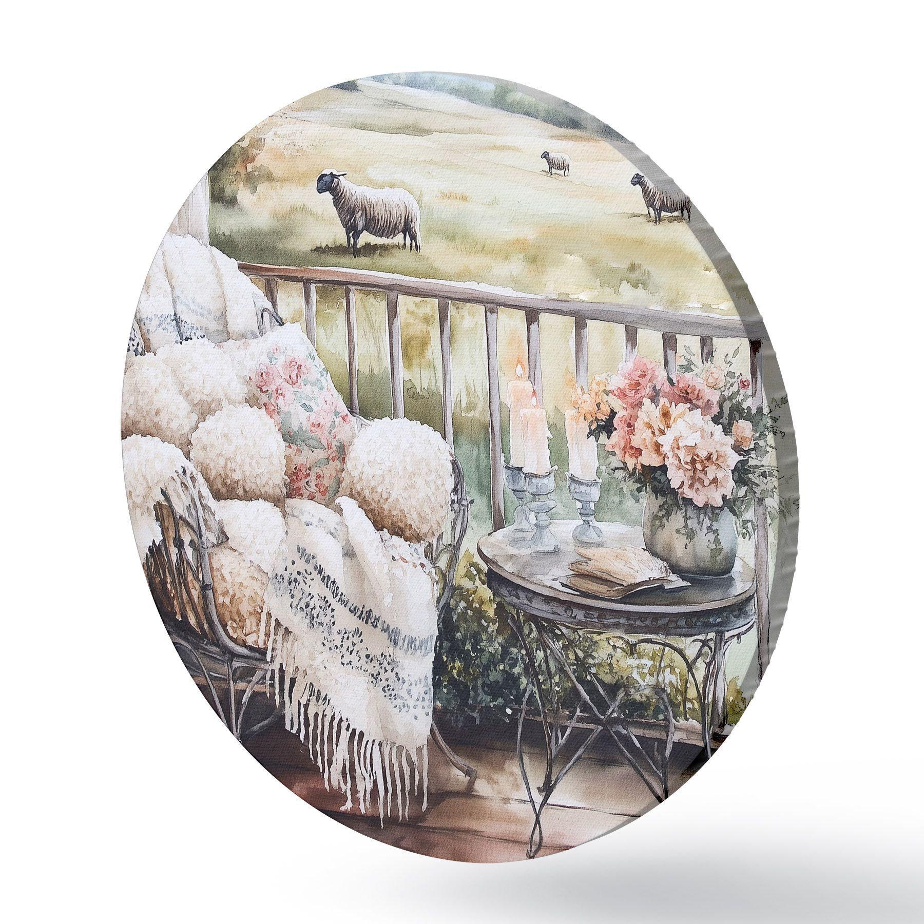 Ronde schilderijen Plattelandsboerderij met schapen, velden, rustieke bloemen, aquarelstijl r44014