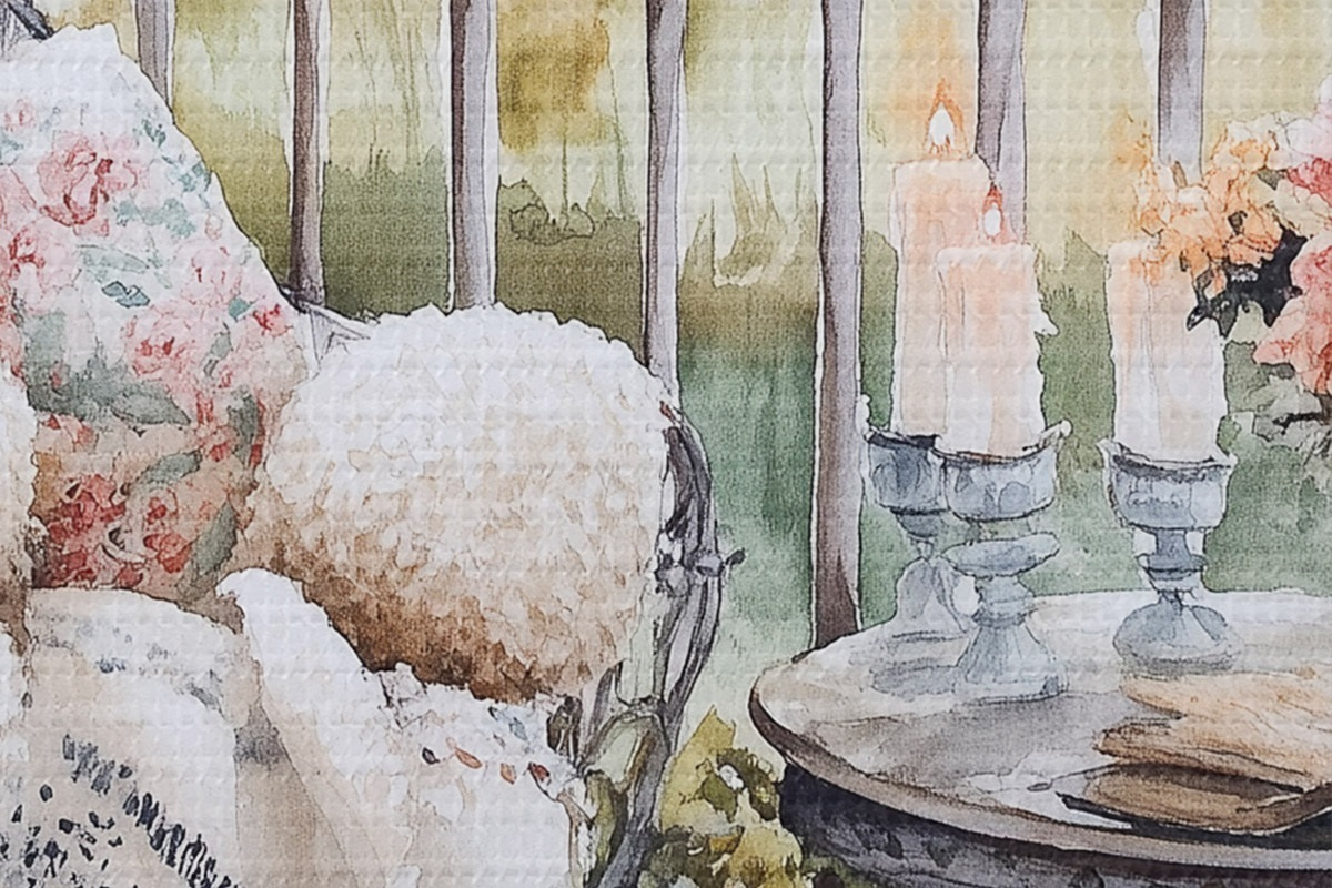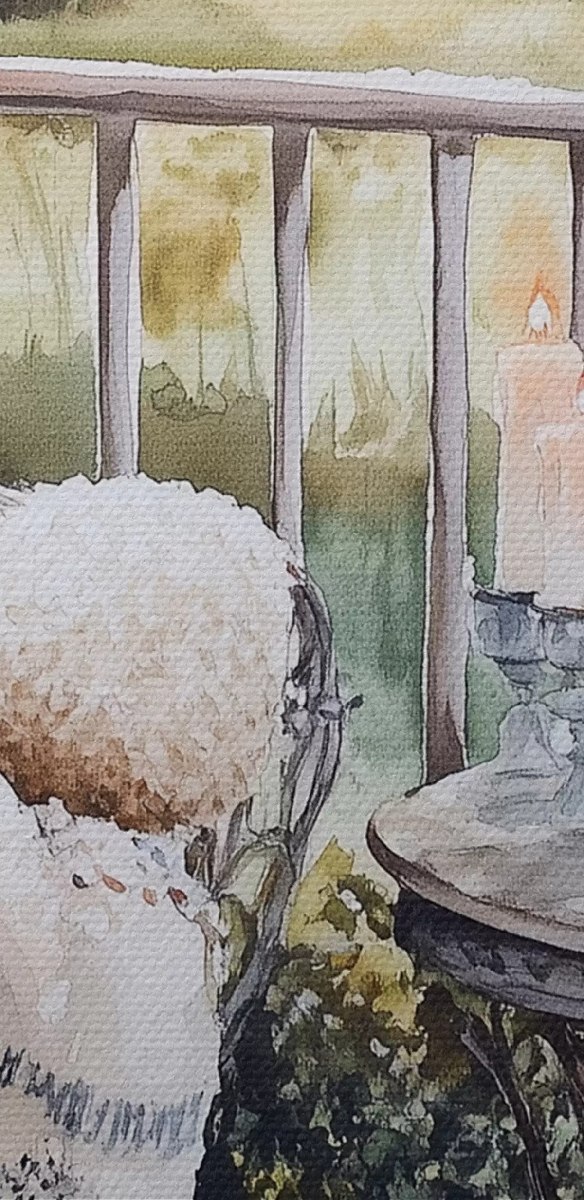 Afbeelding Plattelandsboerderij met schapen, velden, rustieke bloemen, aquarelstijl Nr r44014