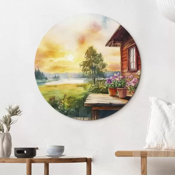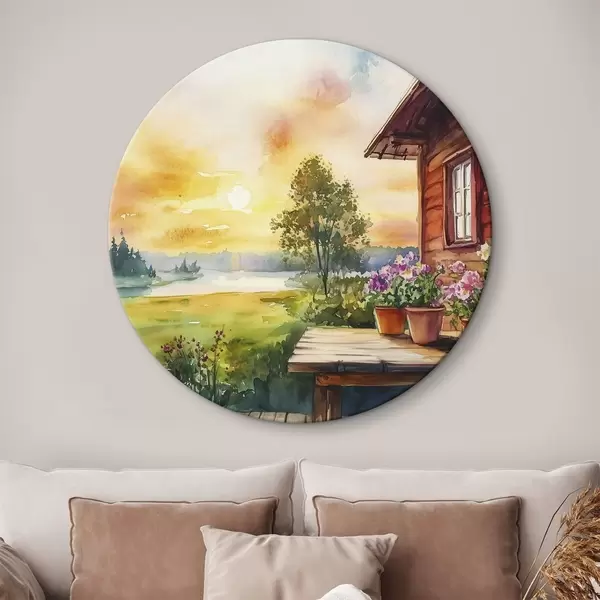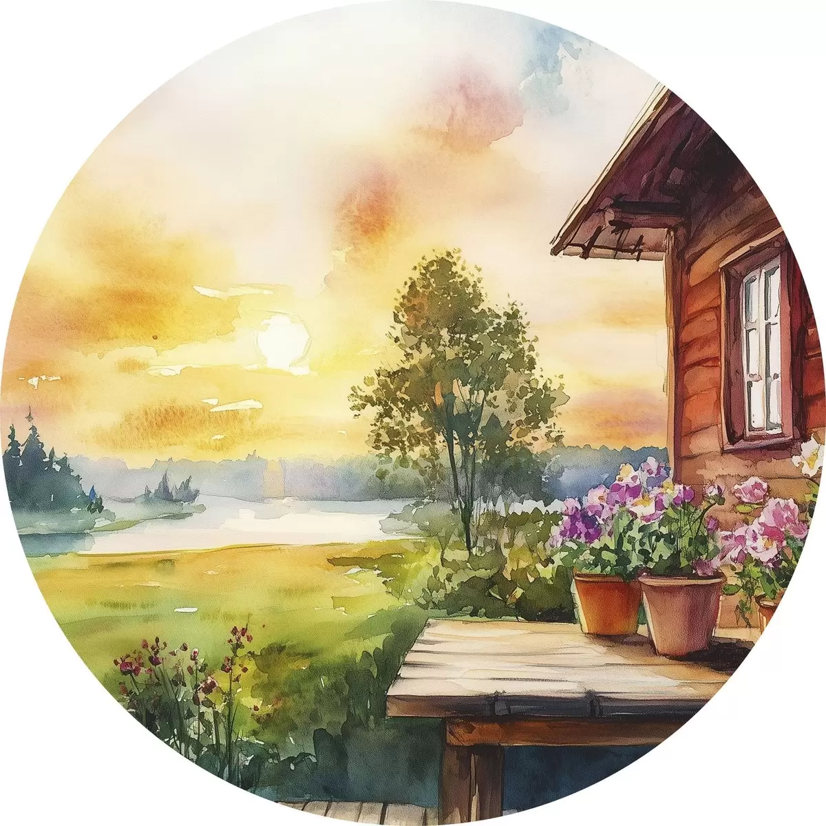 Ronde schilderijen Kleuren zonsondergang, boerderij, aquarelstijl, rustiek, zomerbloemen r44017