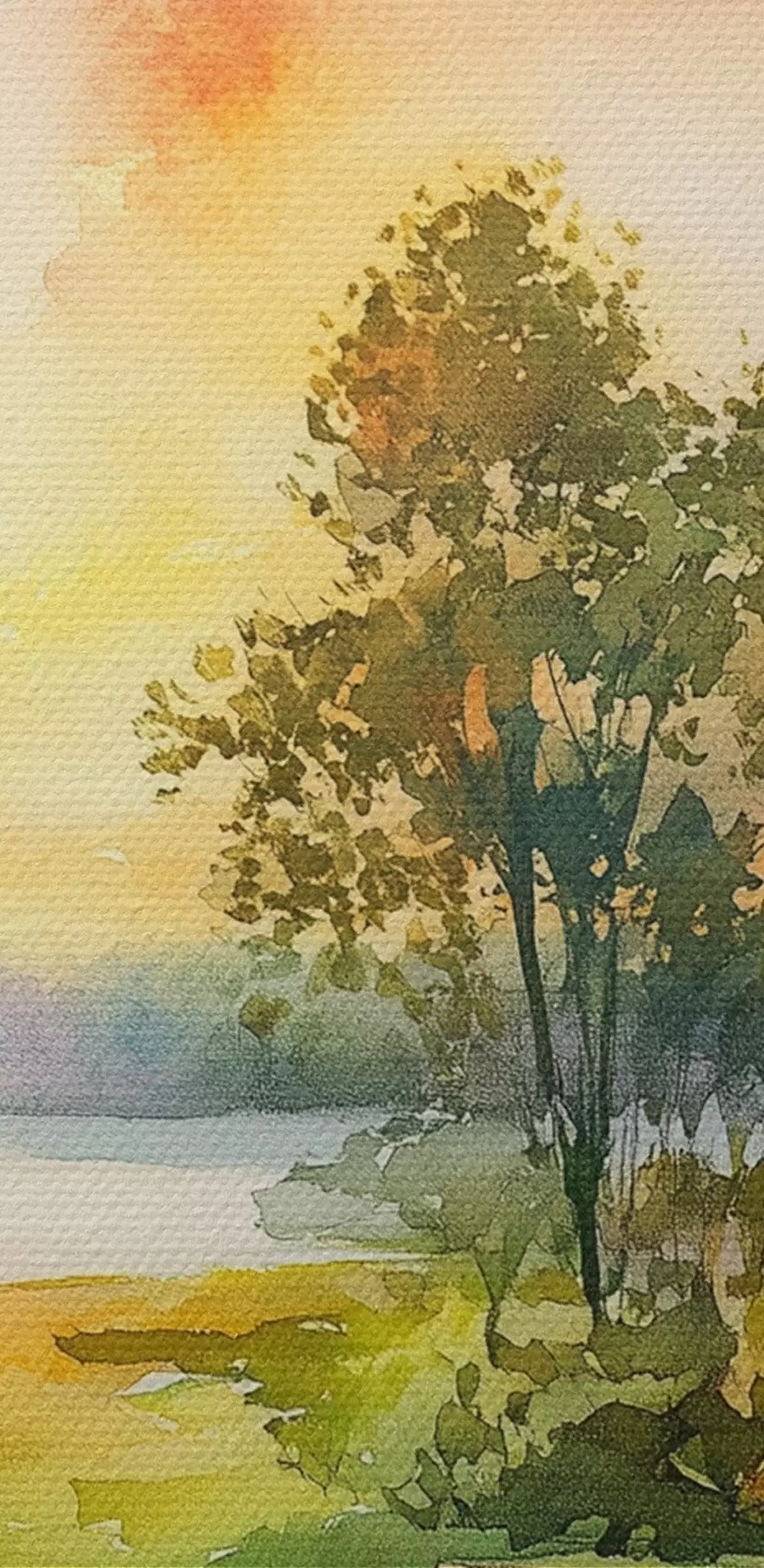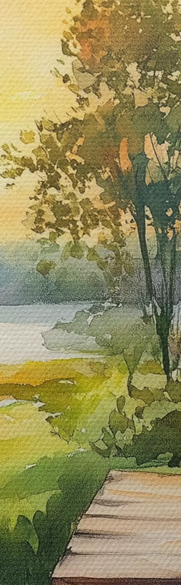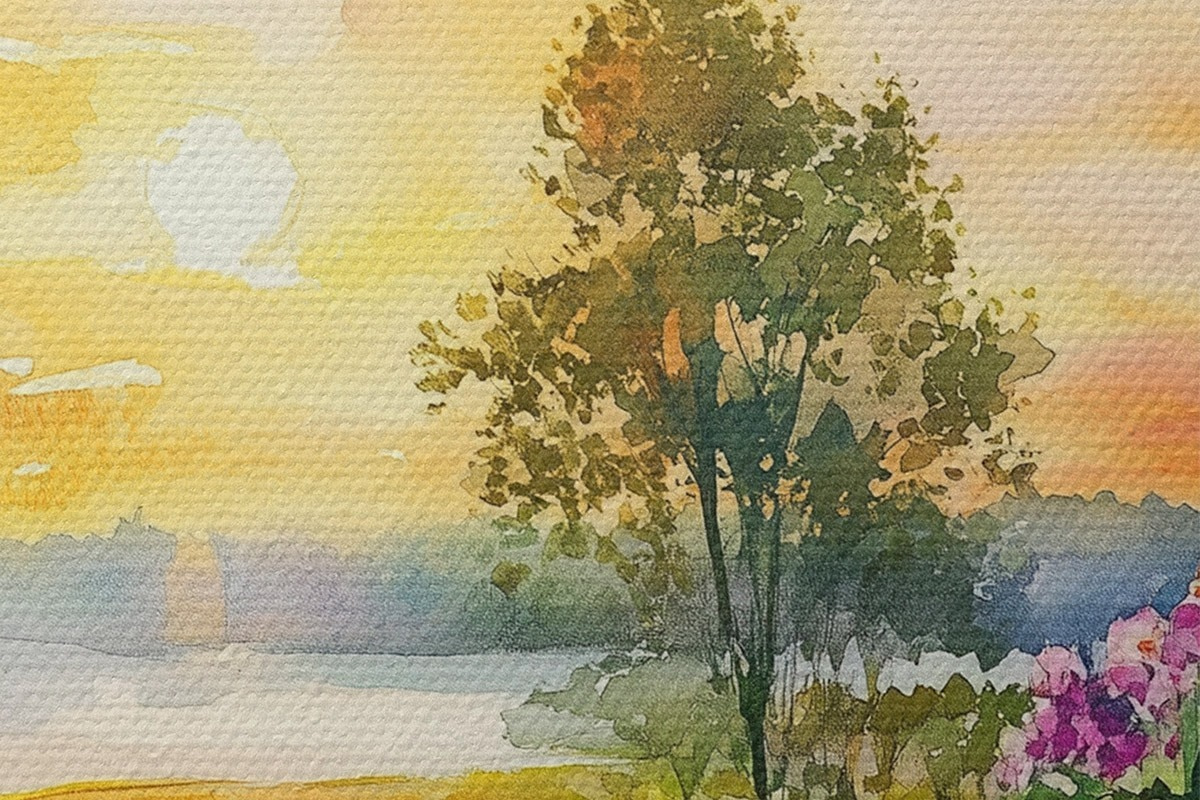 Afbeelding Kleuren zonsondergang, boerderij, aquarelstijl, rustiek, zomerbloemen Nr r44017