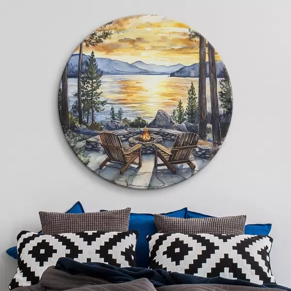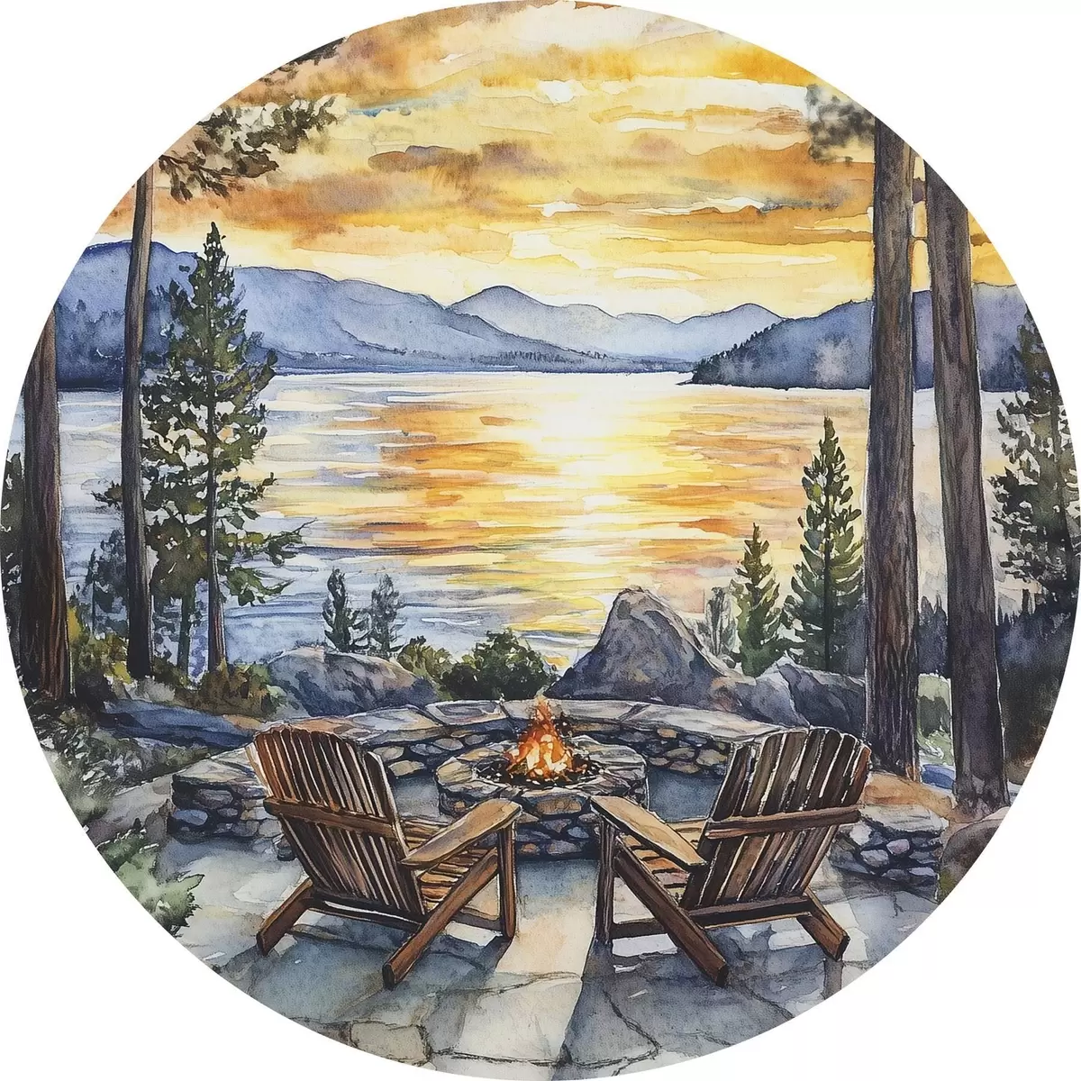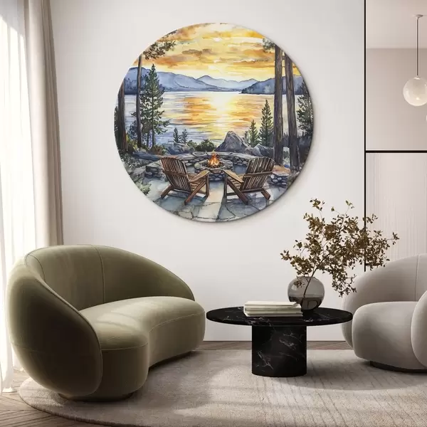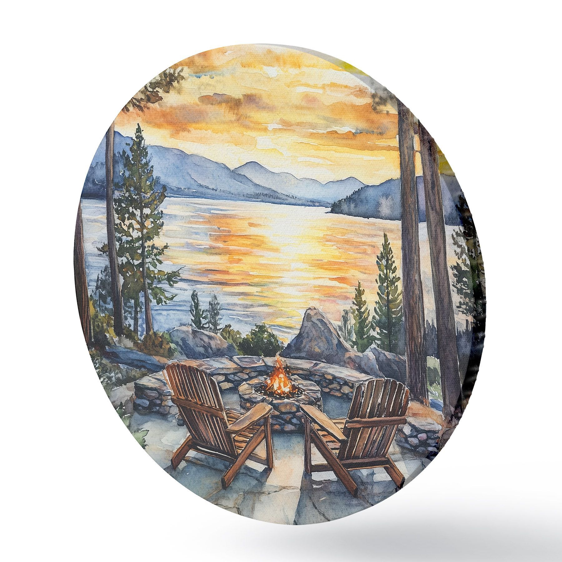 Ronde schilderijen Meer met bergen op de zonsondergang, reizen, gezellige open haard, aquarel r44018