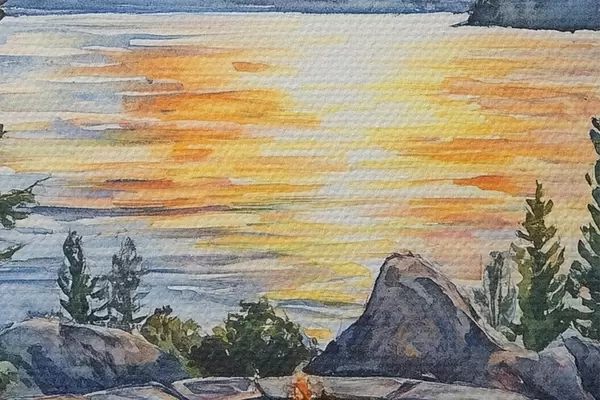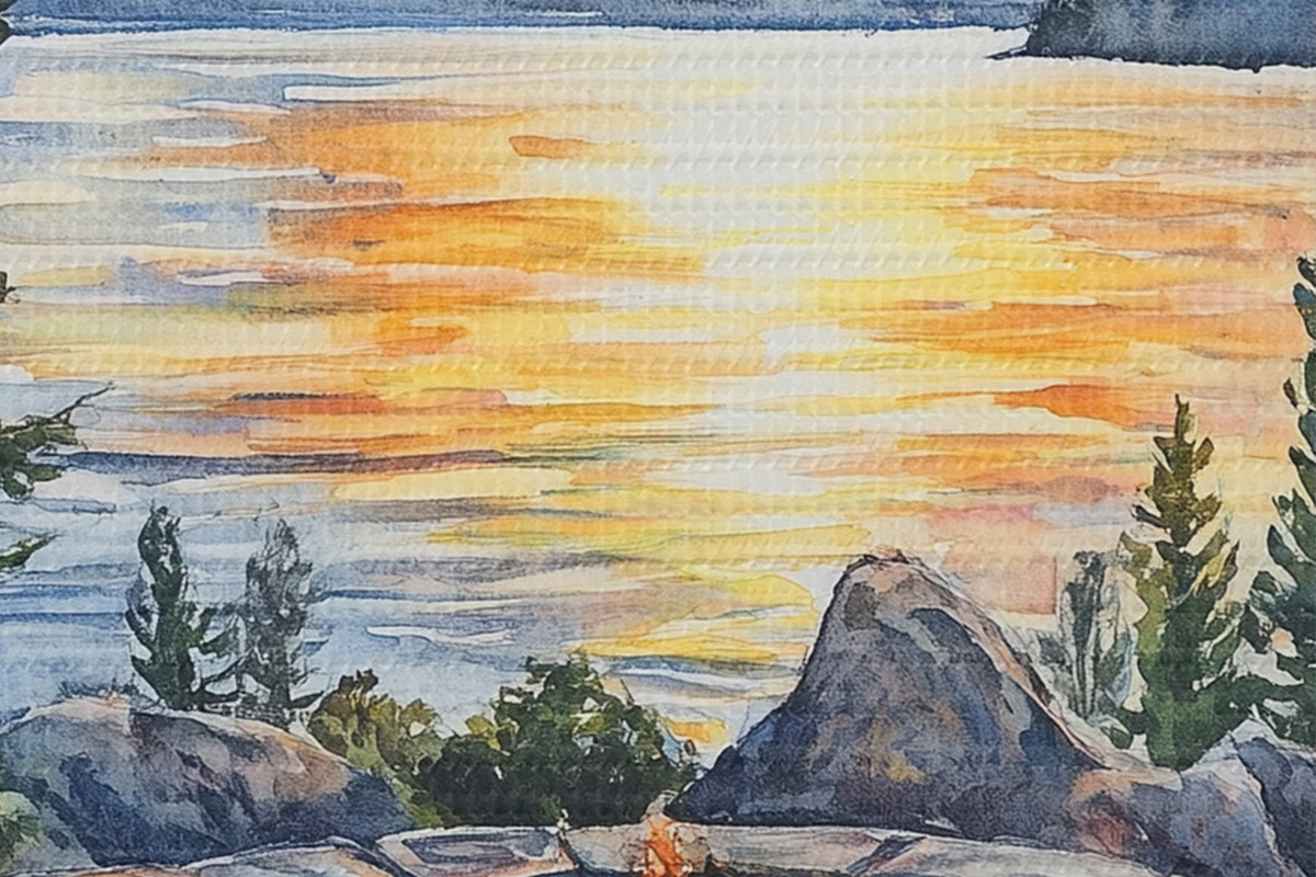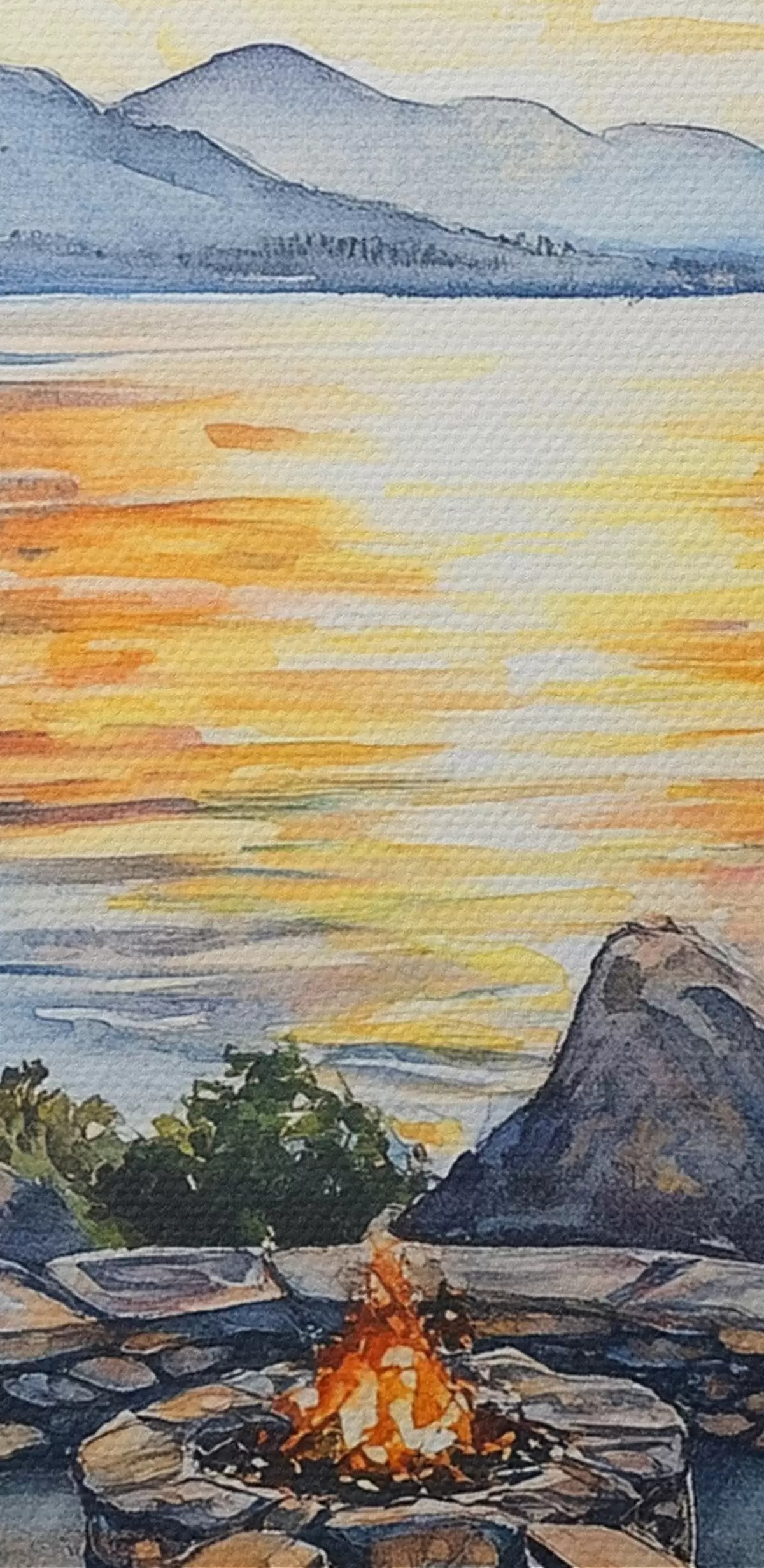 Afbeelding Meer met bergen op de zonsondergang, reizen, gezellige open haard, aquarel Nr r44018