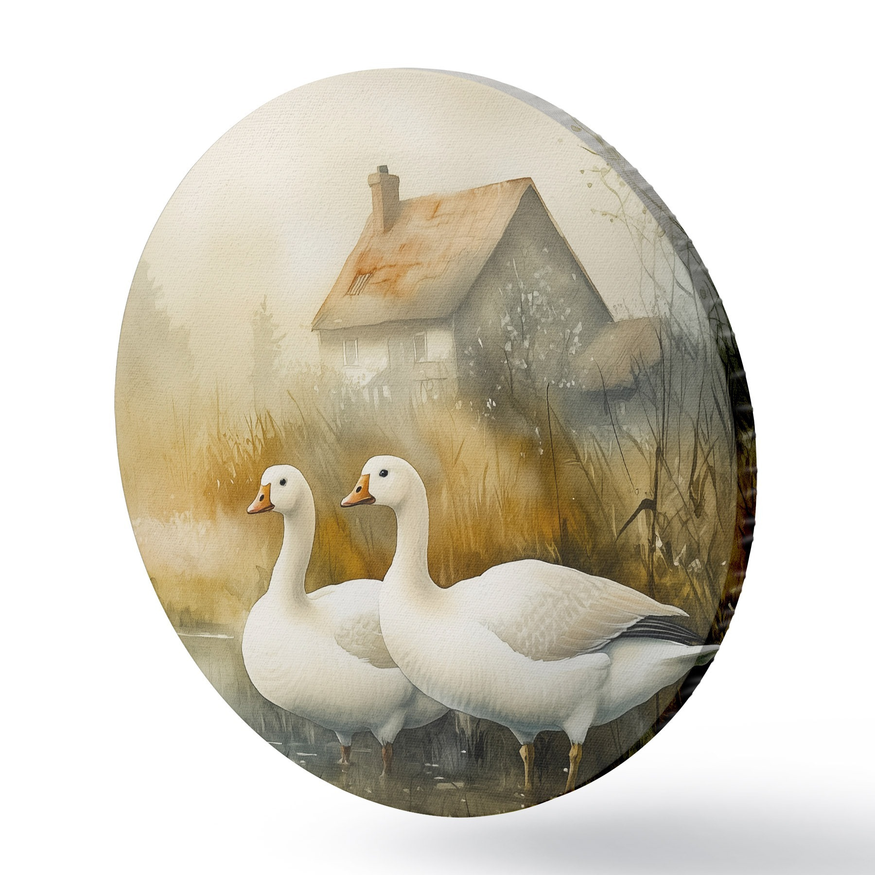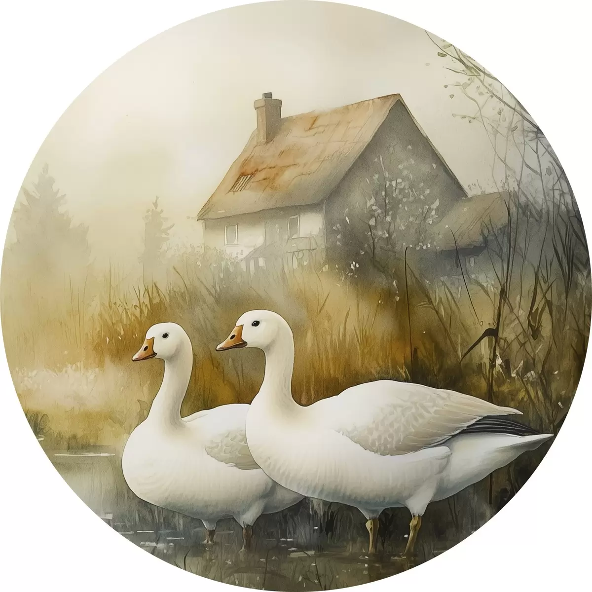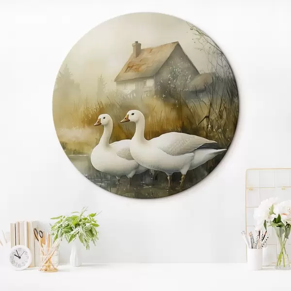 Ronde schilderijen Ganzen in het meer bij boerderij, rustiek, aquarel stijl r44022