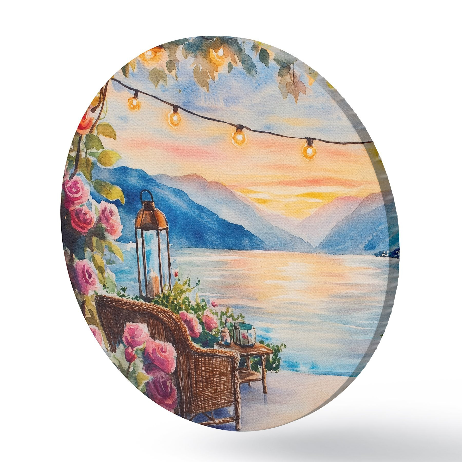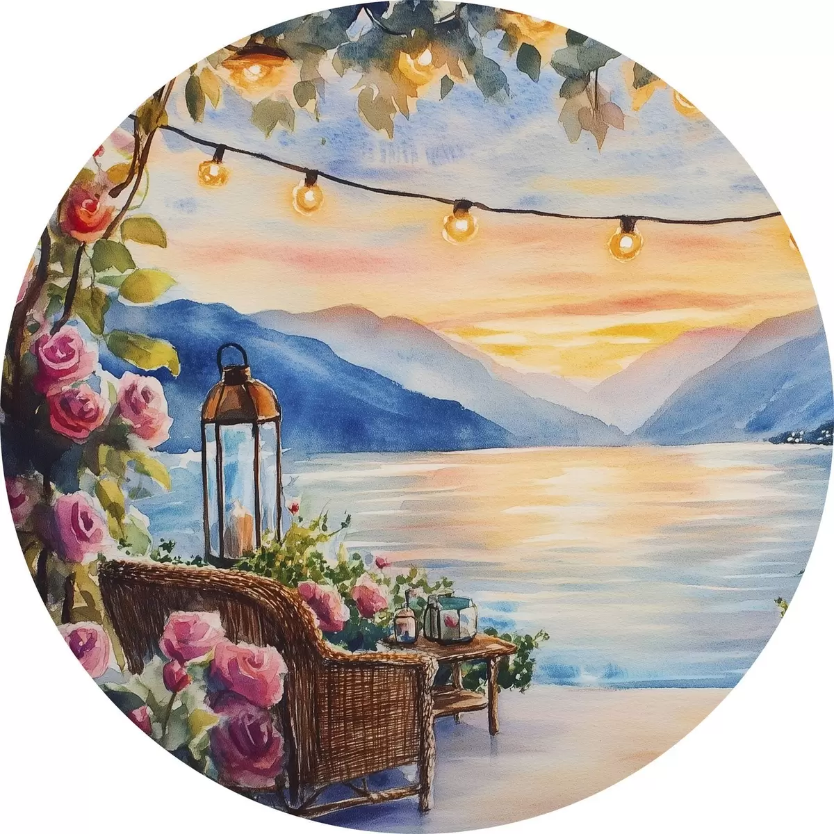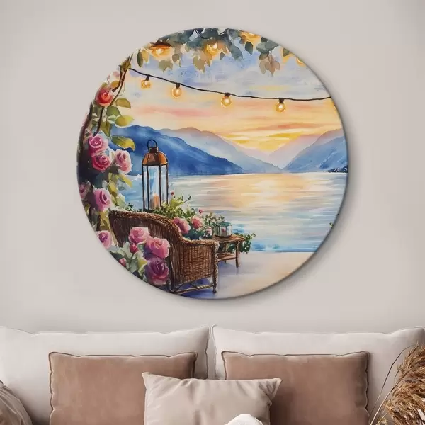 Ronde schilderijen Prachtige zonsondergang in de bergen, meer, rozen, boho stijl r44025