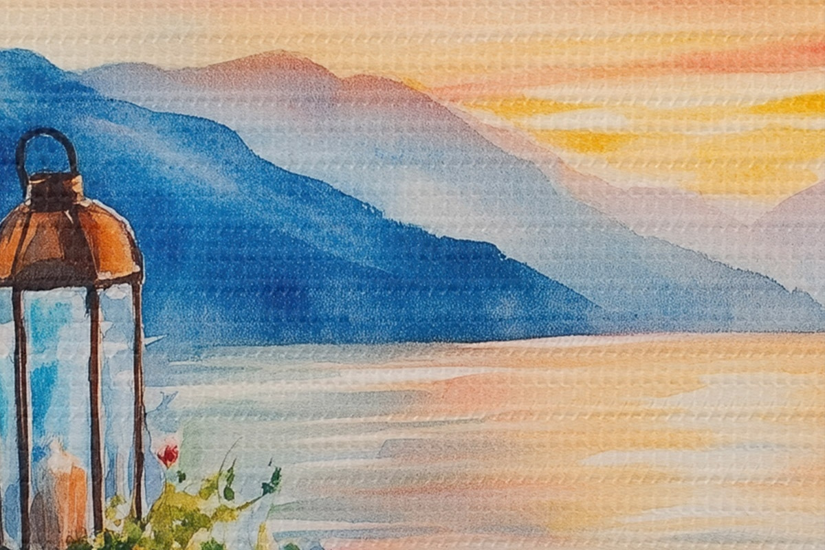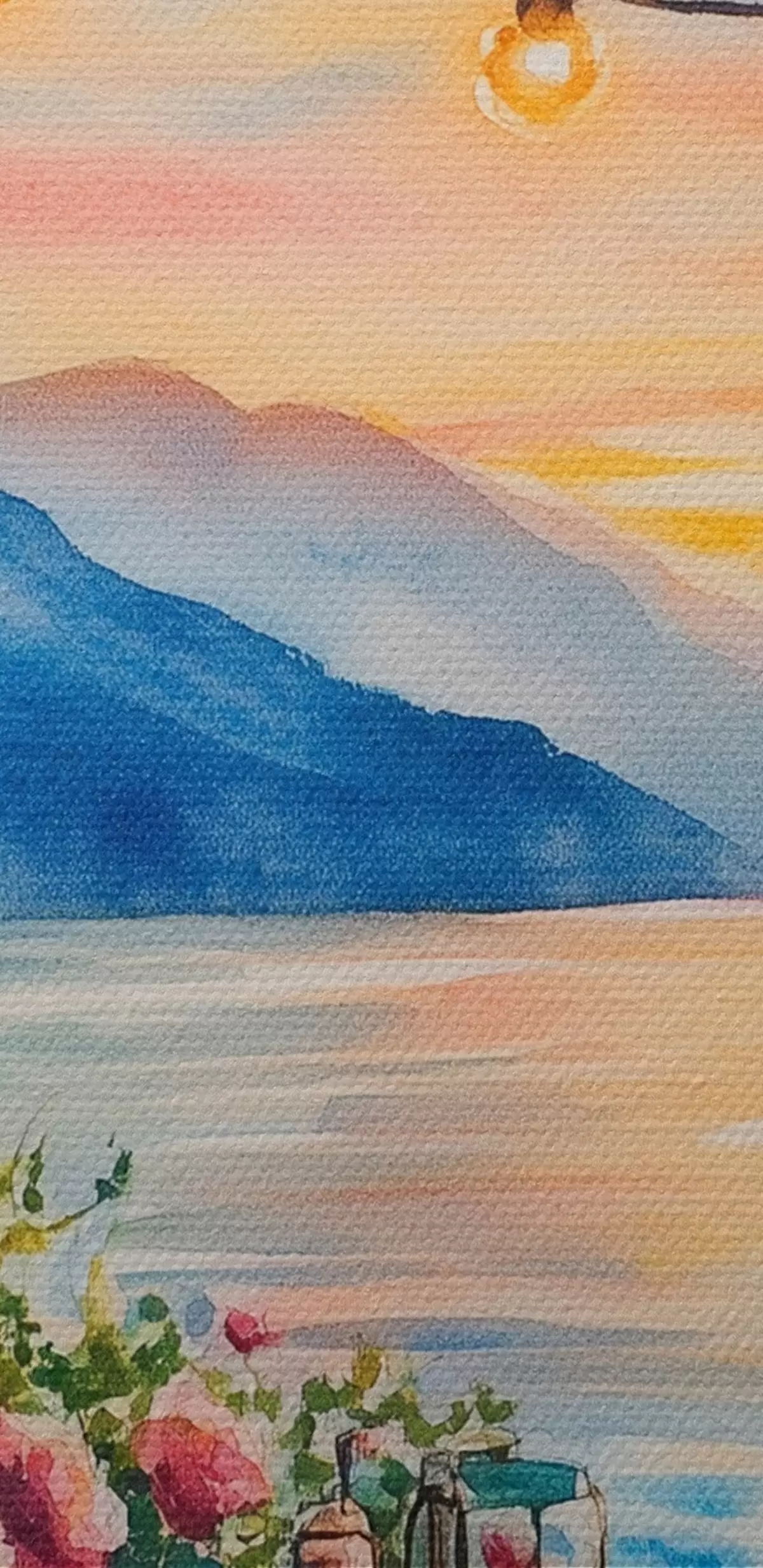 Afbeelding Prachtige zonsondergang in de bergen, meer, rozen, boho stijl Nr r44025