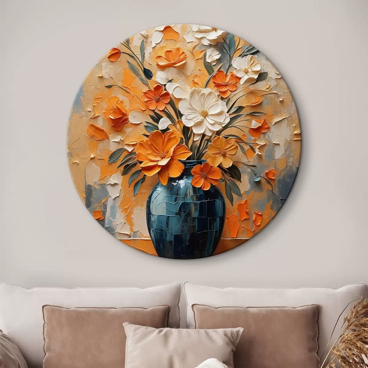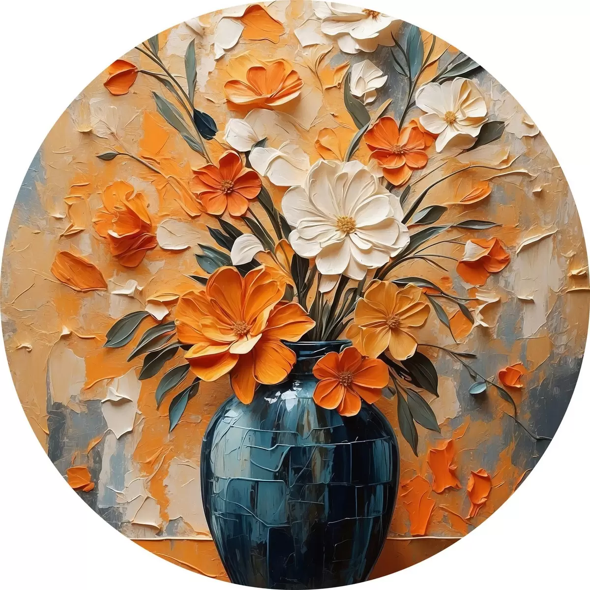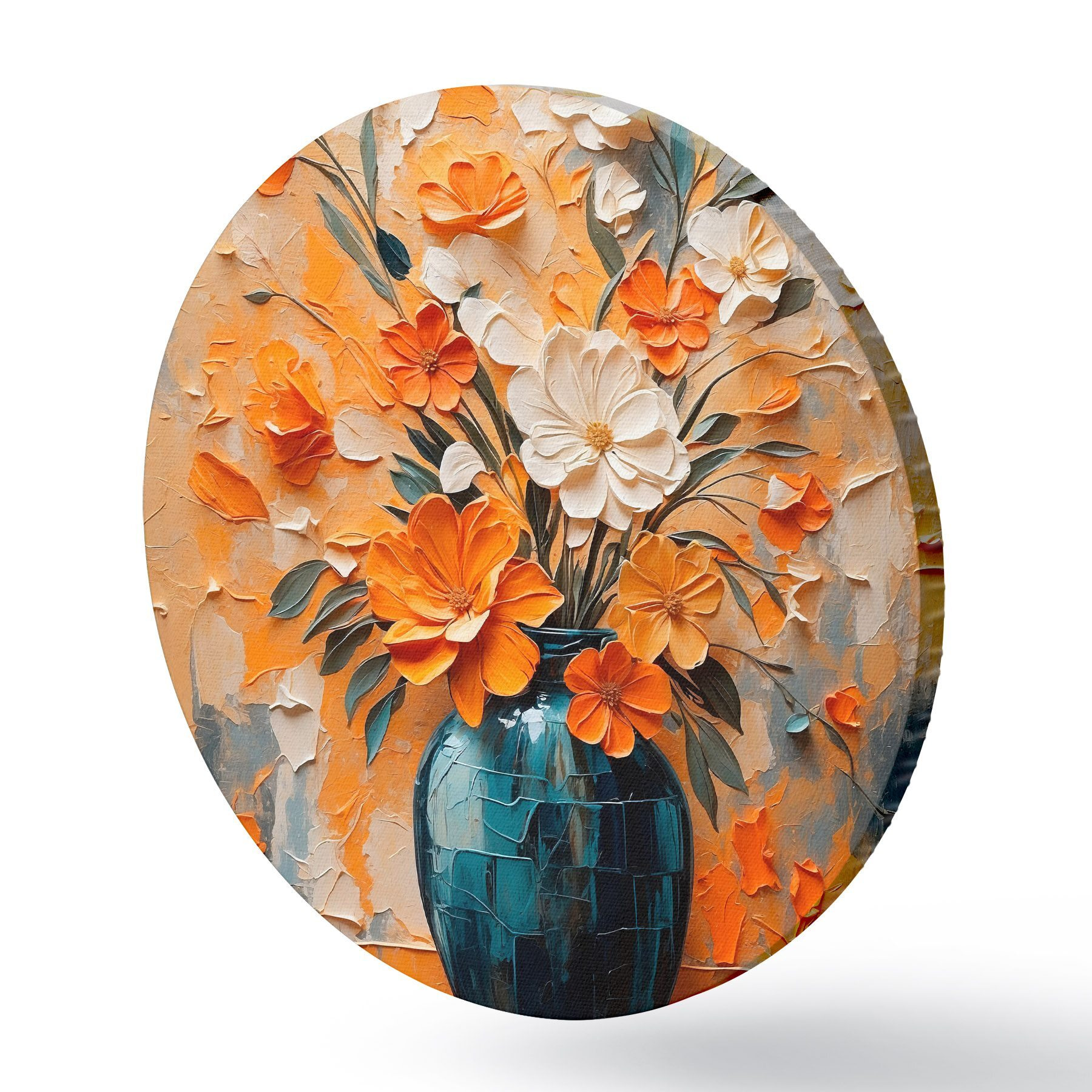 Ronde schilderijen Witte en oranje bloemen in vaas in olieverfschilderijstijl r44059