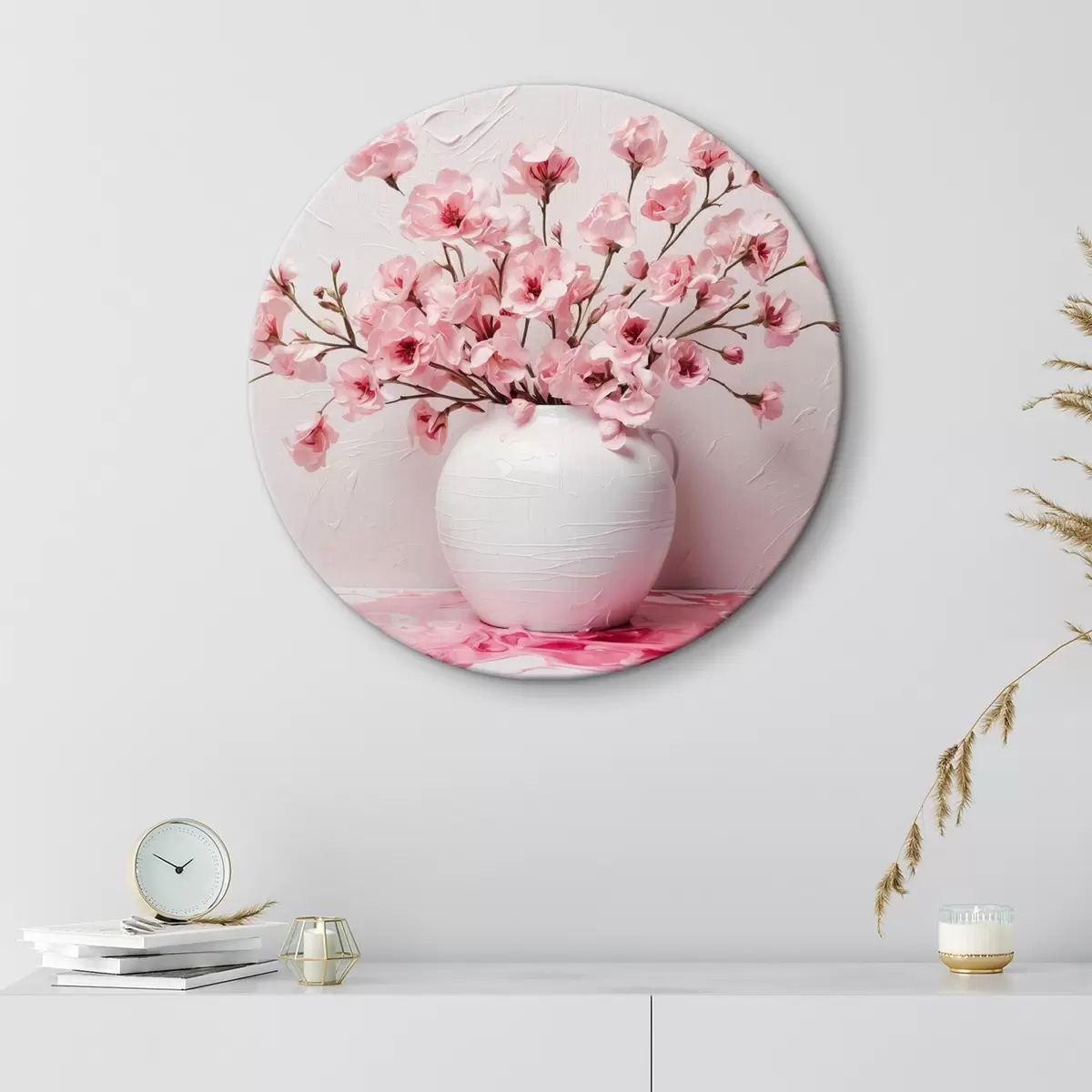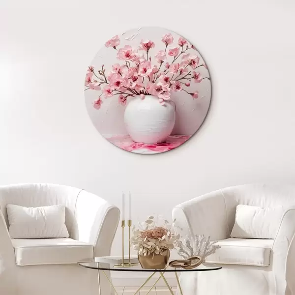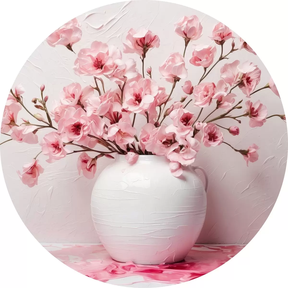 Ronde schilderijen Roze bloemen in witte grote vaas r44081