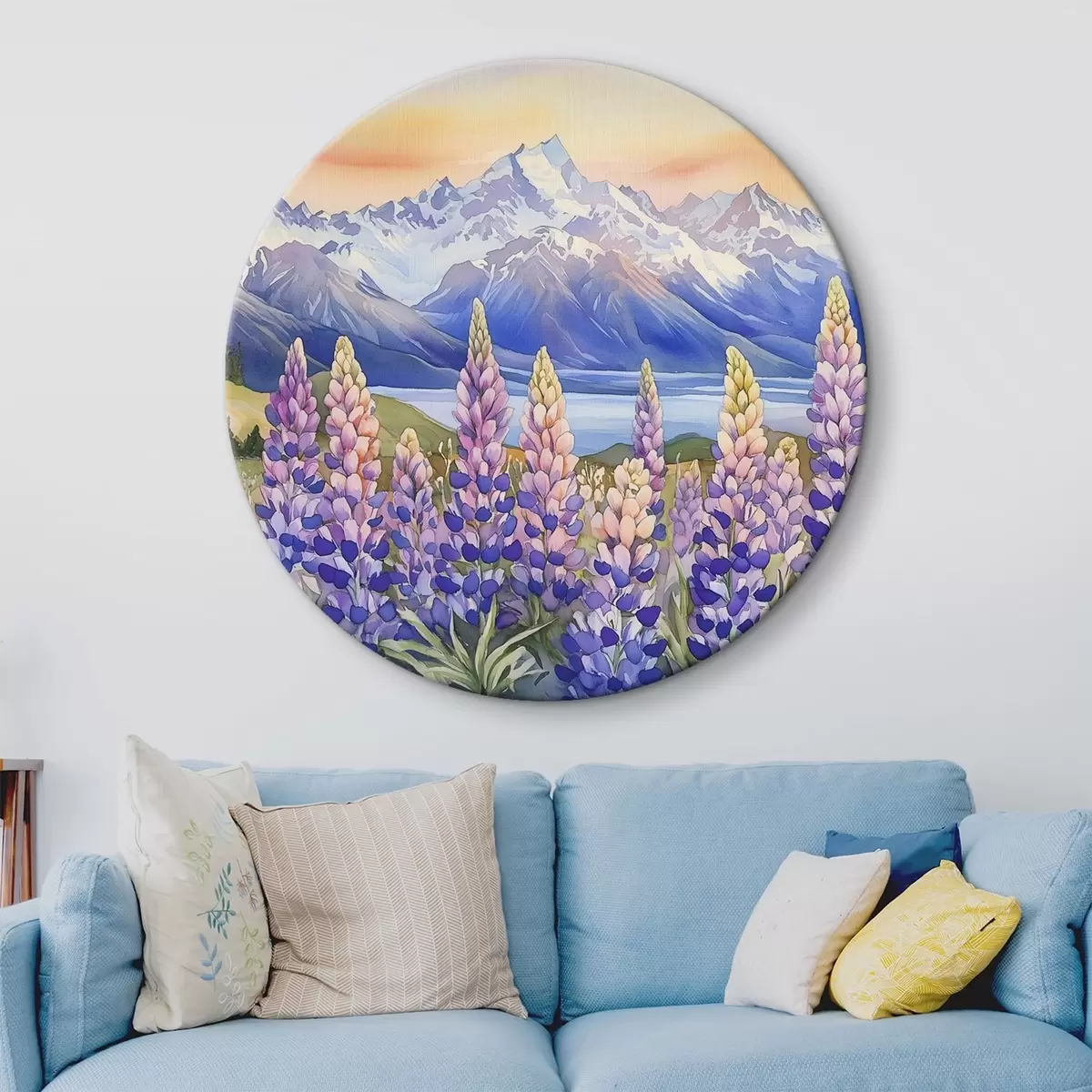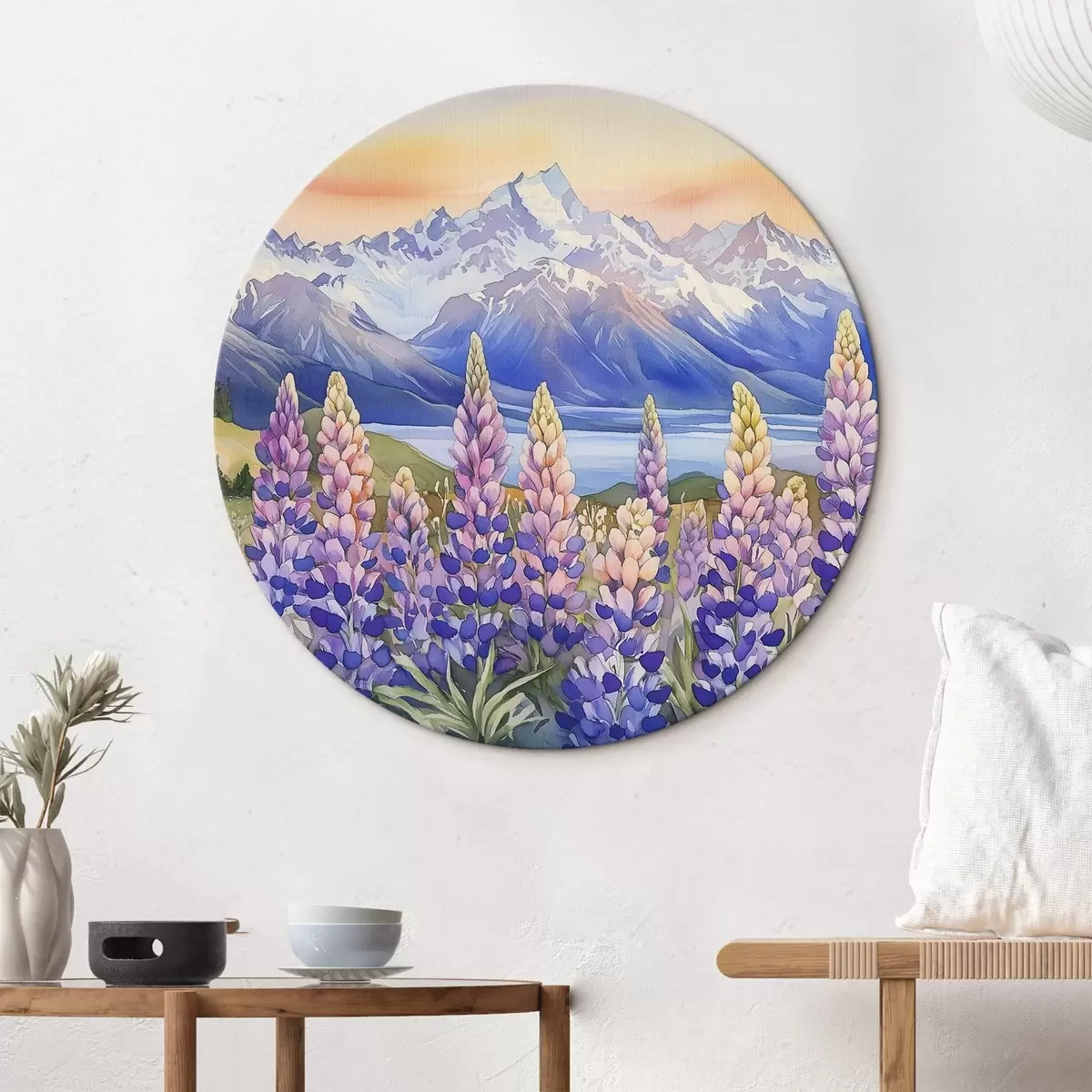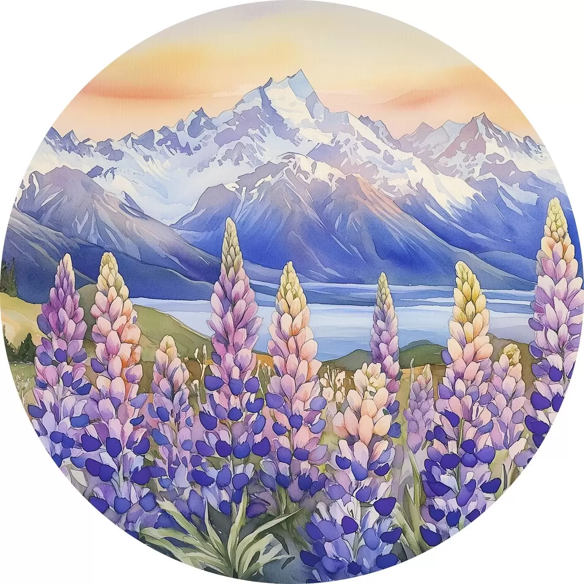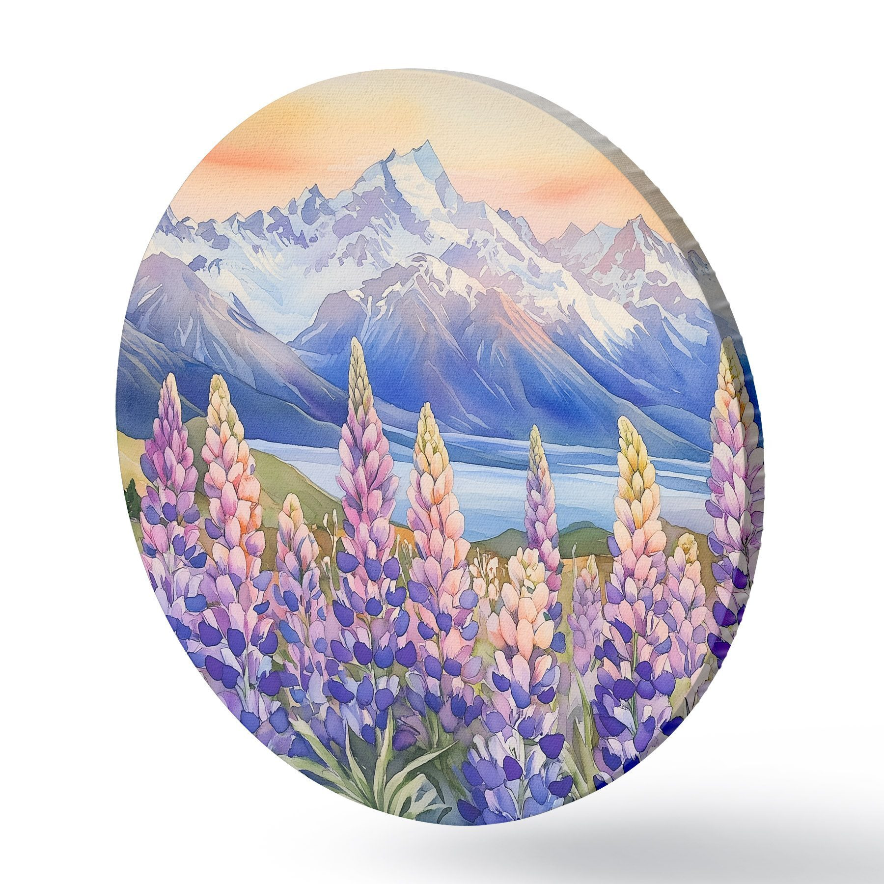 Ronde schilderijen Lupinebloemen, weide, bergen, aquarelstijl, lucht met zonsondergang r44146