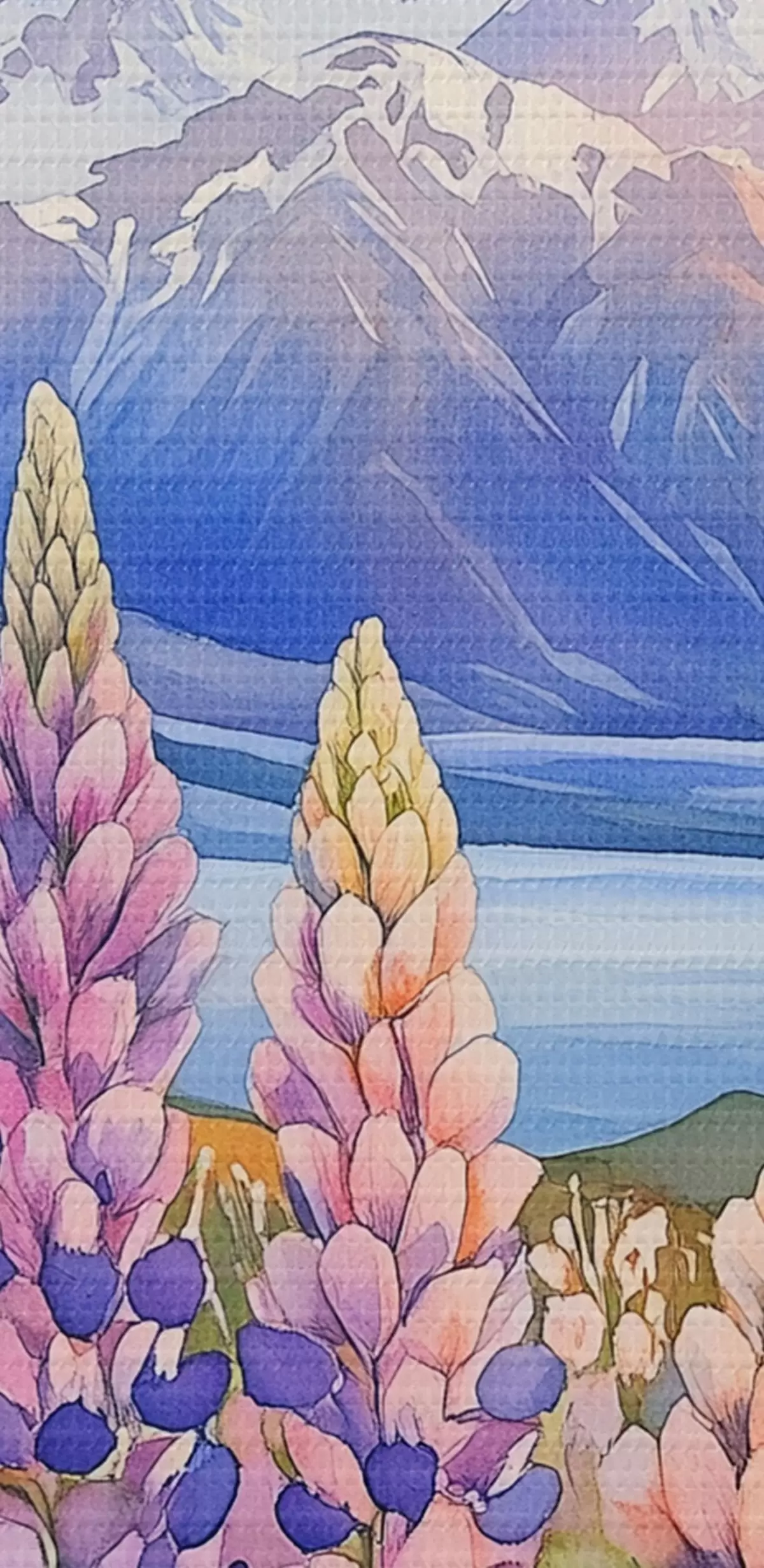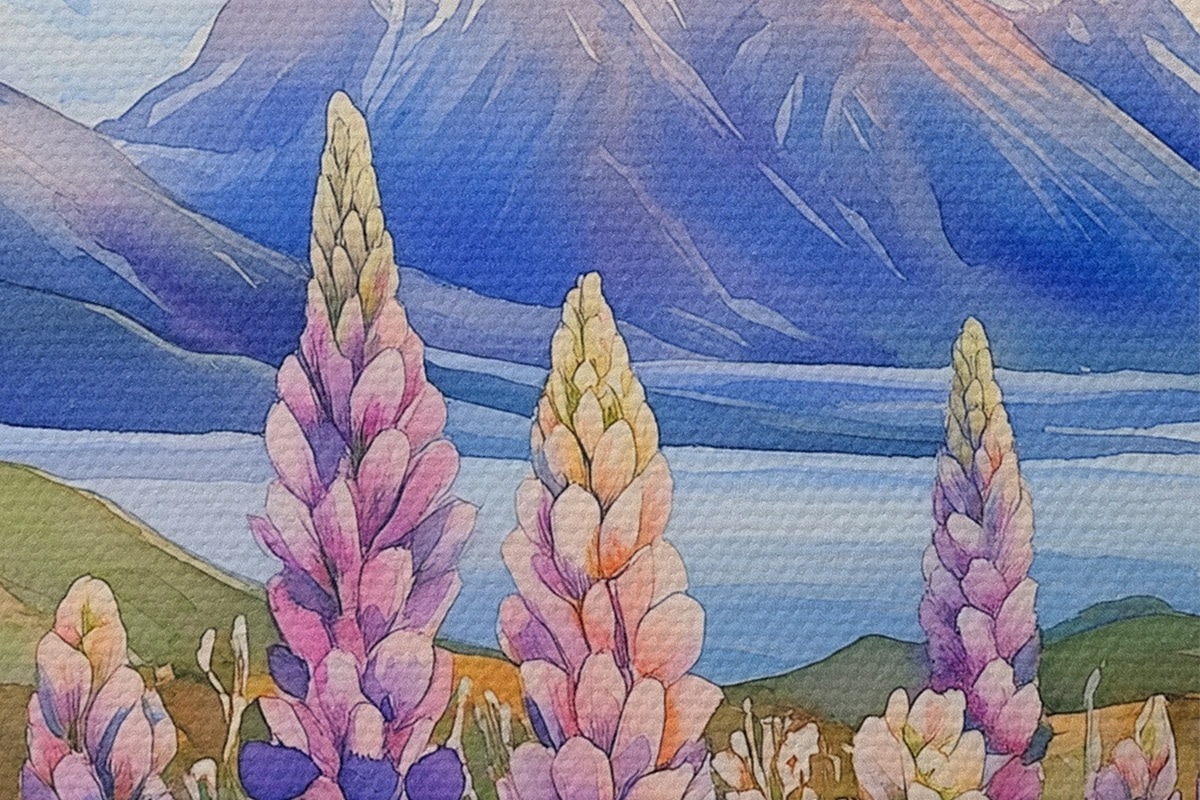 Afbeelding Lupinebloemen, weide, bergen, aquarelstijl, lucht met zonsondergang Nr r44146