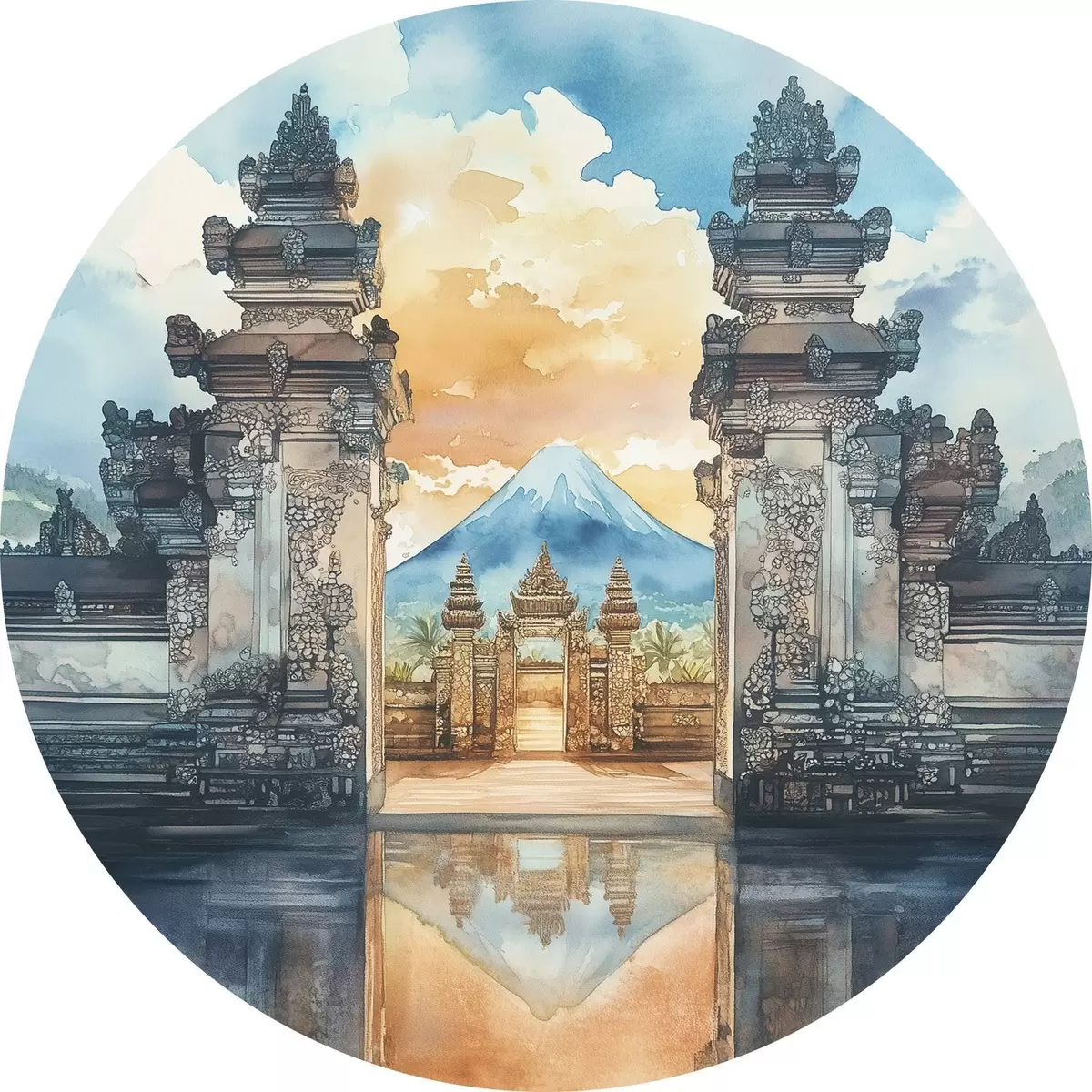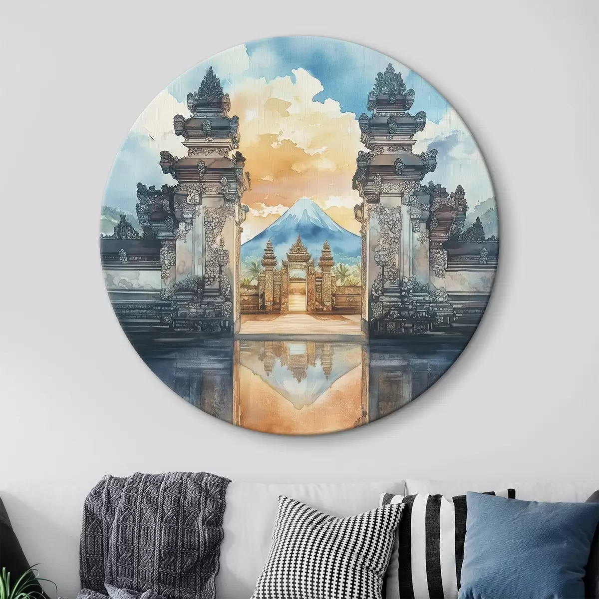 Ronde schilderijen Bali esthetiek, tempel, zonsondergang, tropische natuur, aquarel stijl r44149